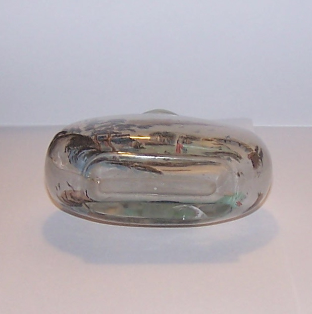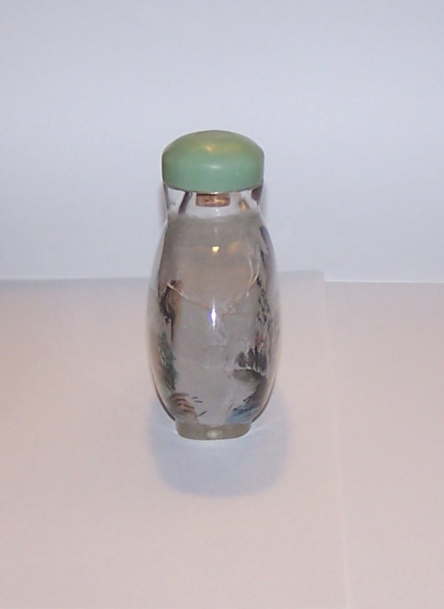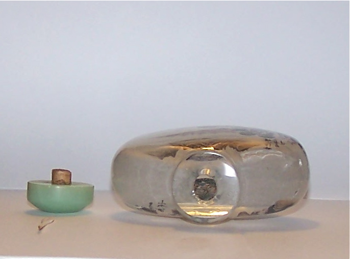 There are several cracks on the left side ( second photo ). The cracks seem to be internal, because the surface is smooth everywhere. There are no chips, you cannot feel the cracks. I do not know if glass cracks like this because of age ? It would seem that if it was dropped, the edges would be chipped ?, which they are not. The spoon looks and feels to be made out of bone, it is no longer attached to the cork. There is still some snuff in the bottom of the bottle and on the spoon.