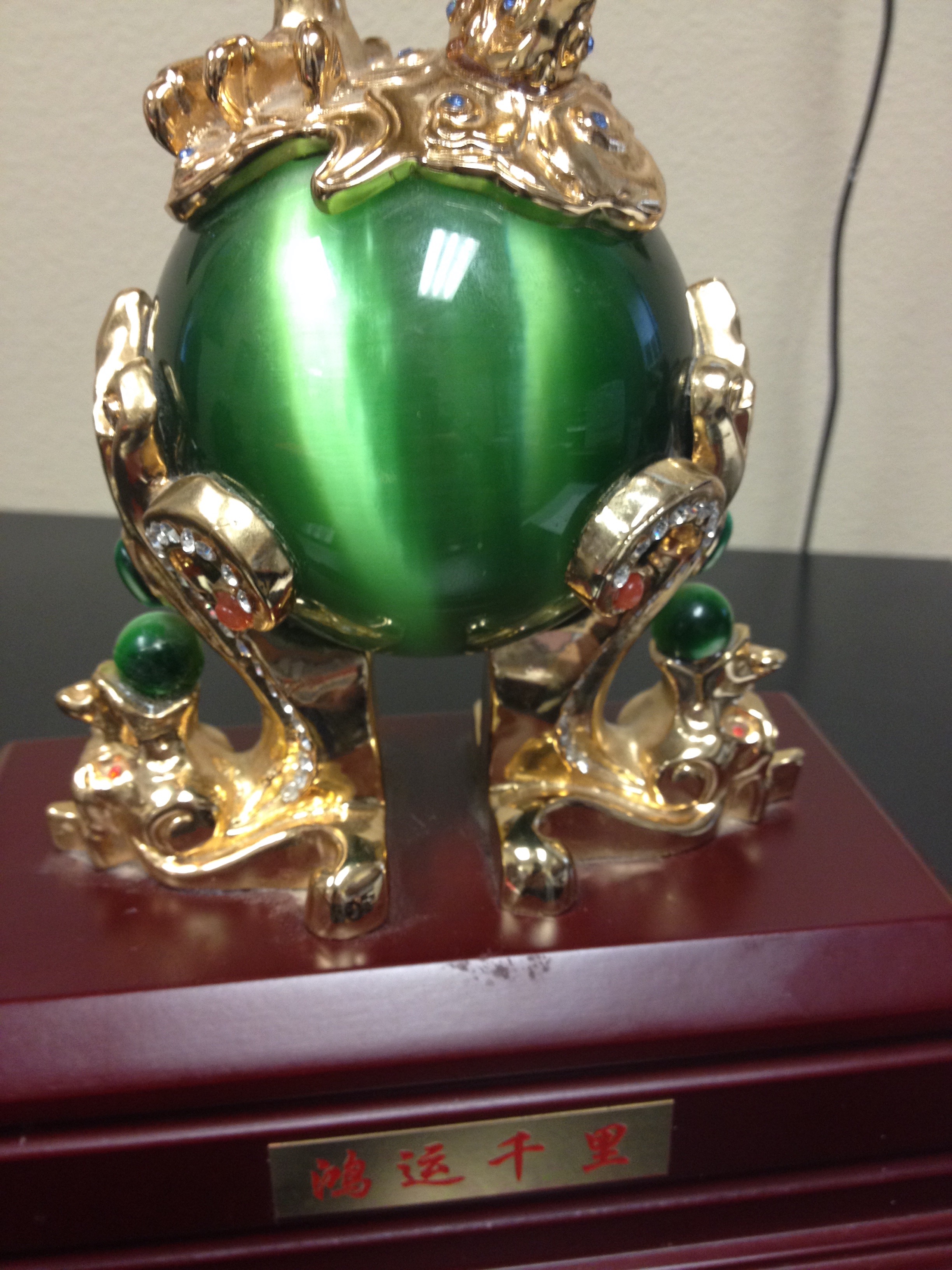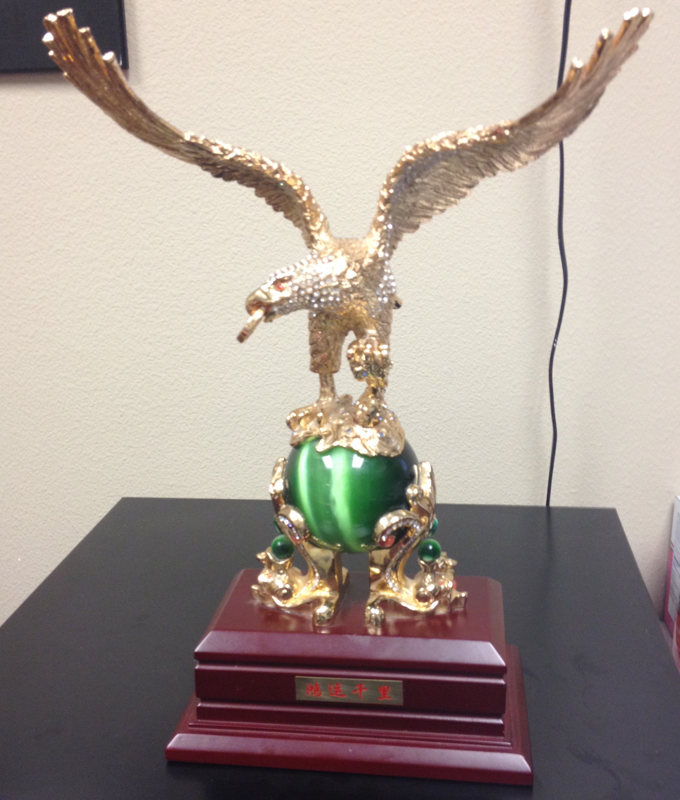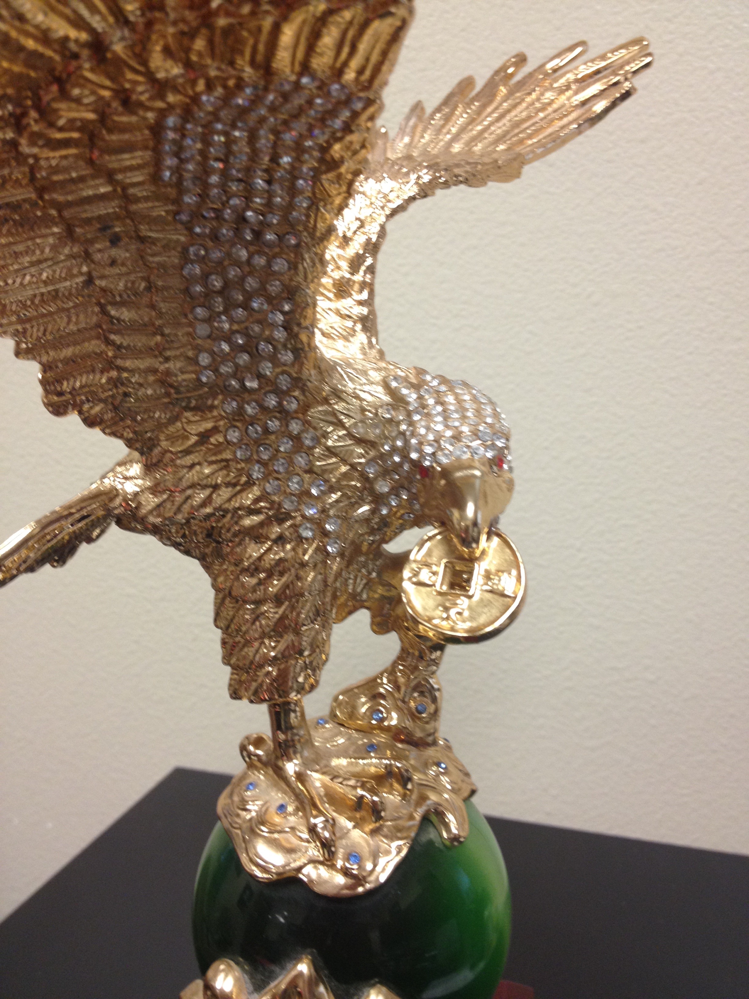 This is an eagle figurine that is gold colored (not sure if it is actual gold or not). It has several clear jewels encrusted under the wings  and on the face/neck, as well as red jeweled eyes.  It has what appears to be an Asian coin in its beak, Asian writing on the front of the base, and a gold metal tag with Asian writing on it, but I do not know the country of origination.  The figurine stands about 15 inches tall from the bottom of the base to the top of the wings, and appears to be very well made.  This item belonged to my father and was given to me after he passed away, my stepmother said that he thought it was "something special".  I have searched all over the internet and have not been able to find anything like it.  I am very curious if anyone knows what it is, where it came from, what it is made out of and if it is worth anything.