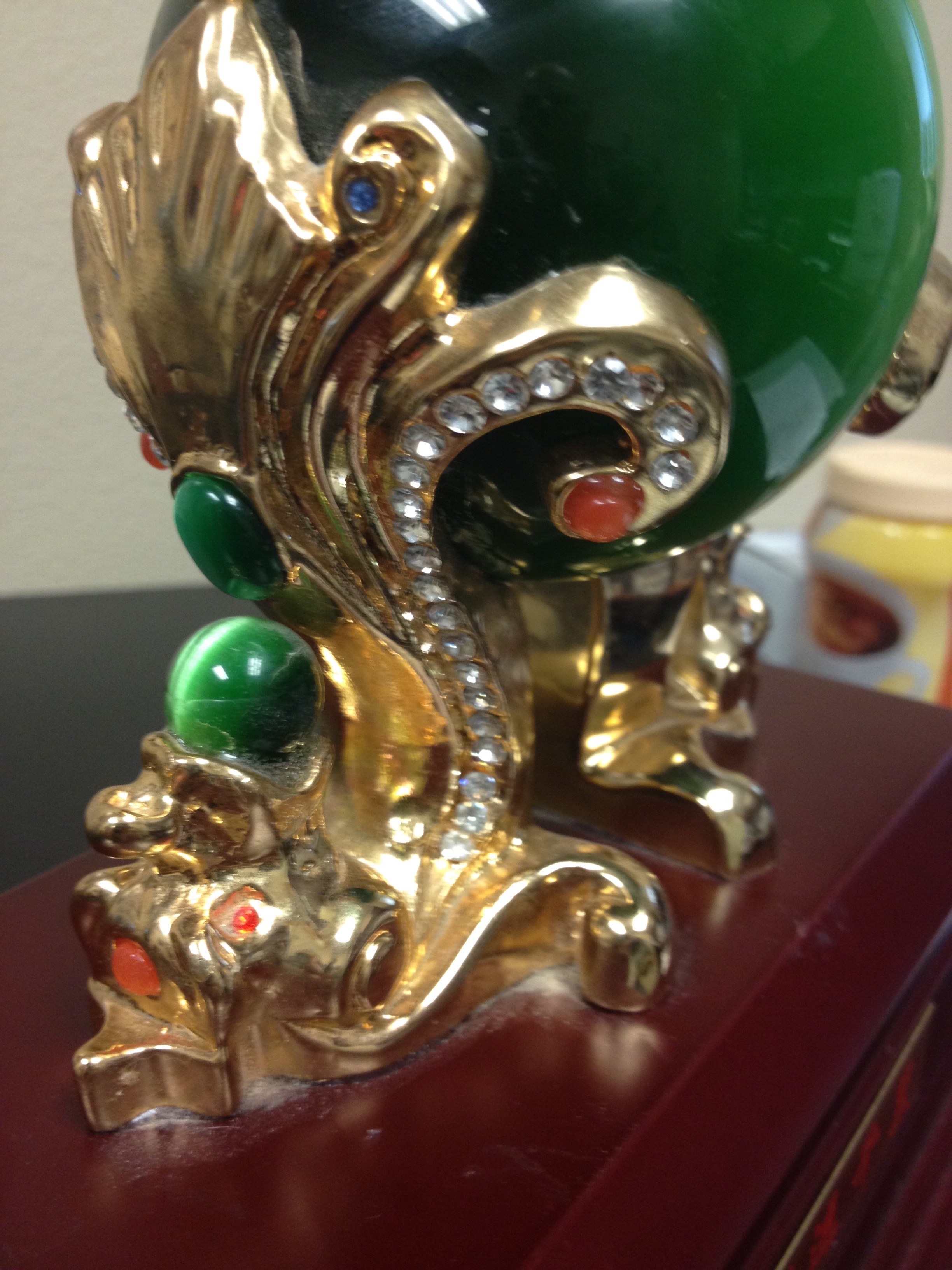 Medium Gold metal (not sure if it is gold, gold plated, brass or something else). Covered under wings, neck and face with jewels. Standing on a green ball, resembling cat's eye quartz.