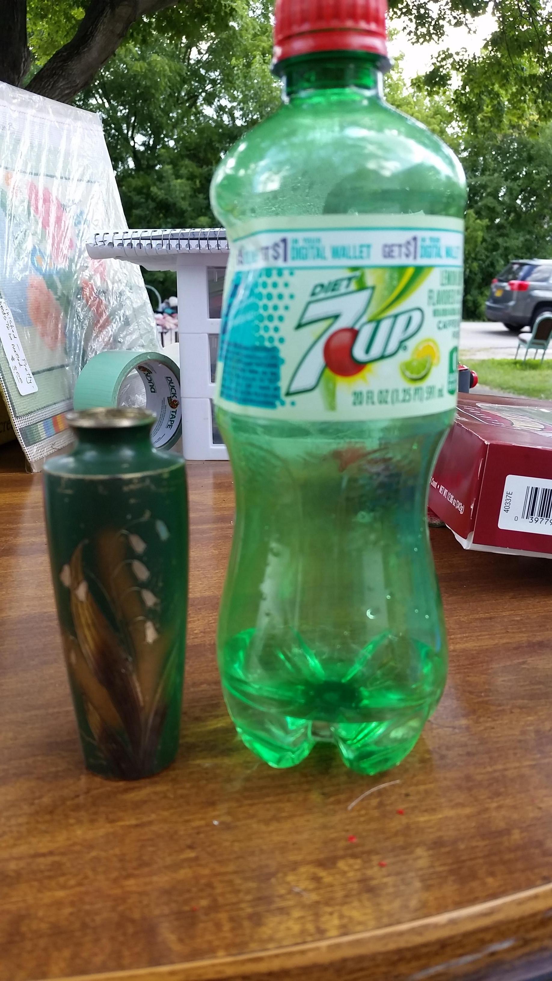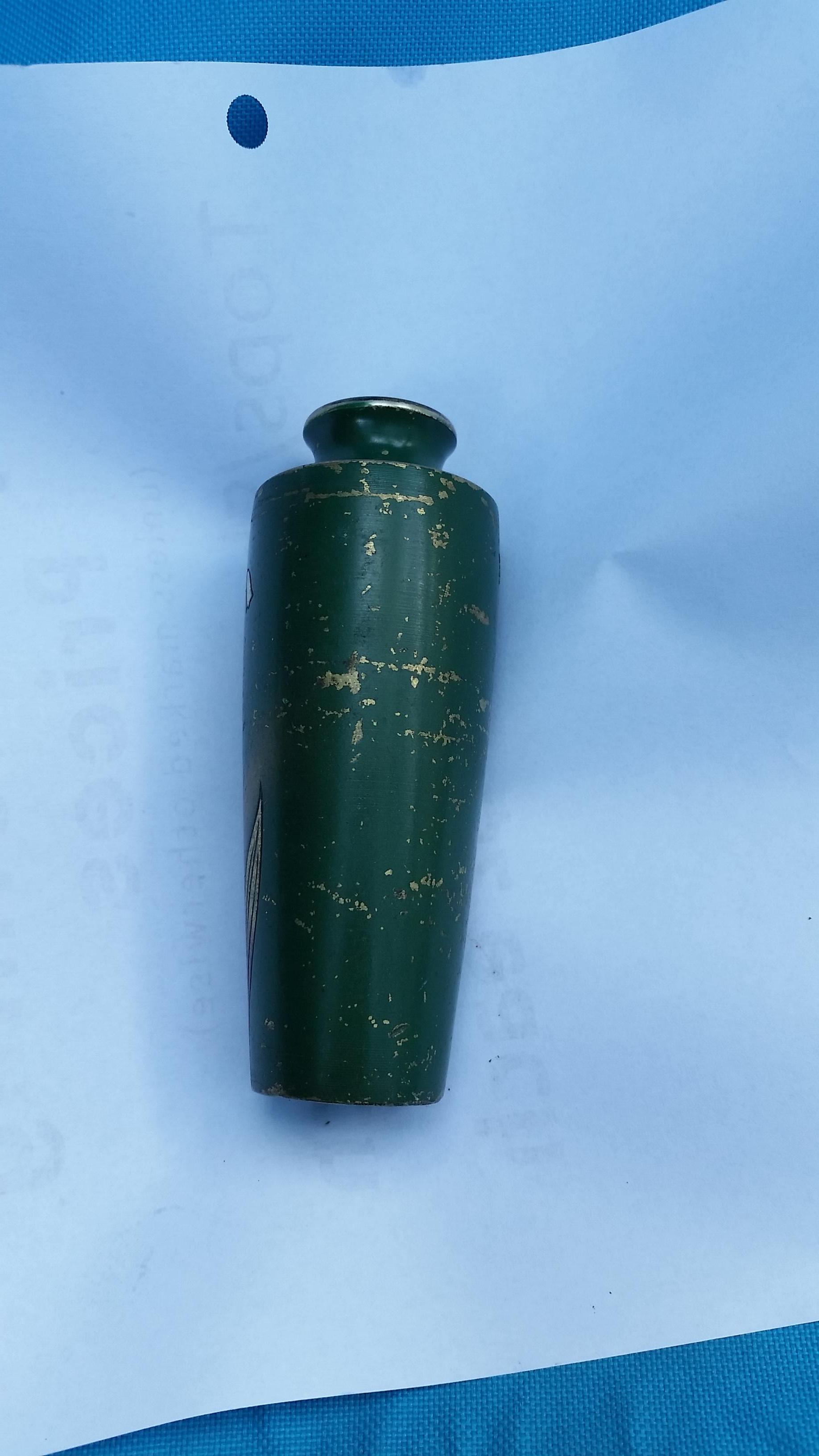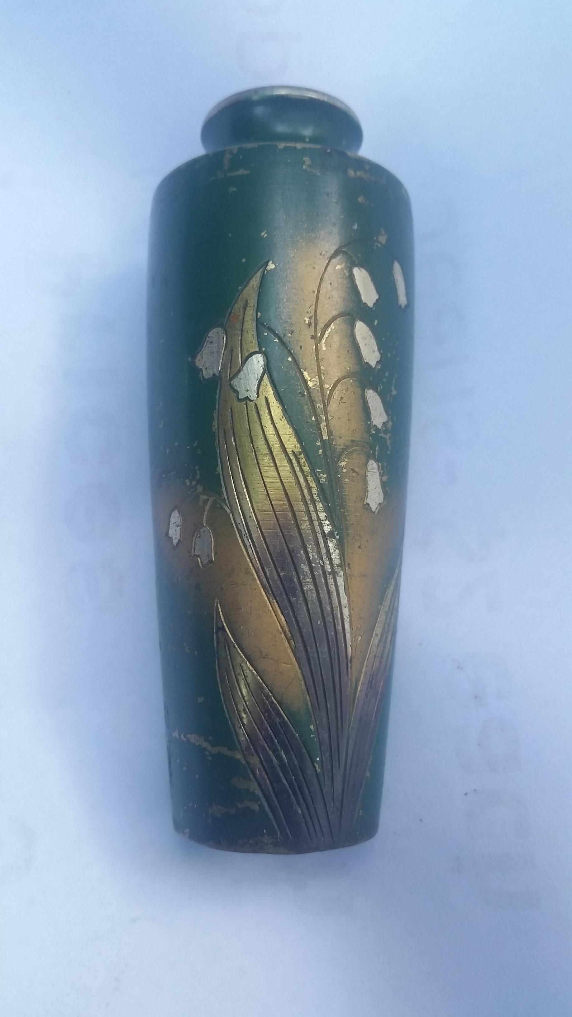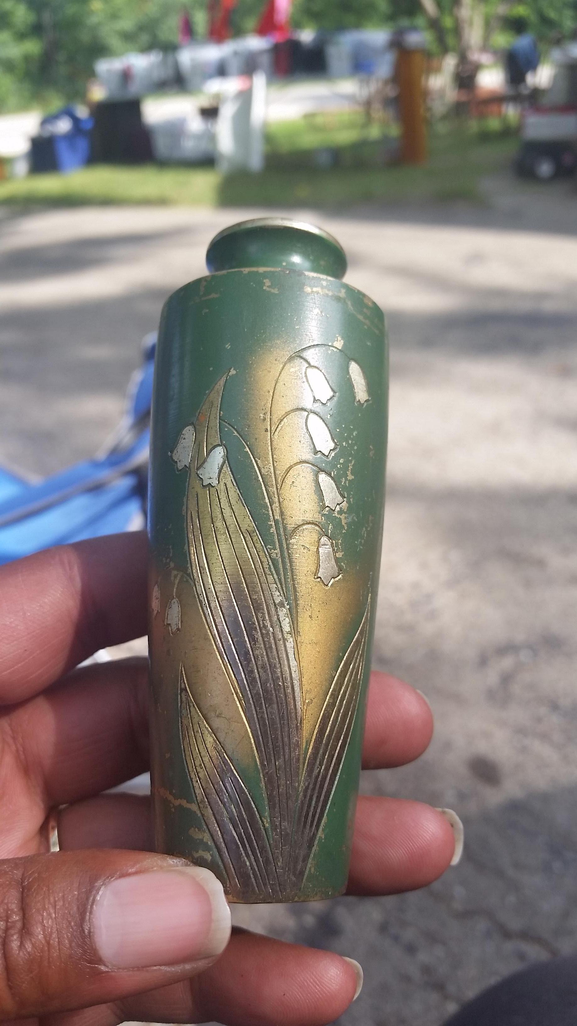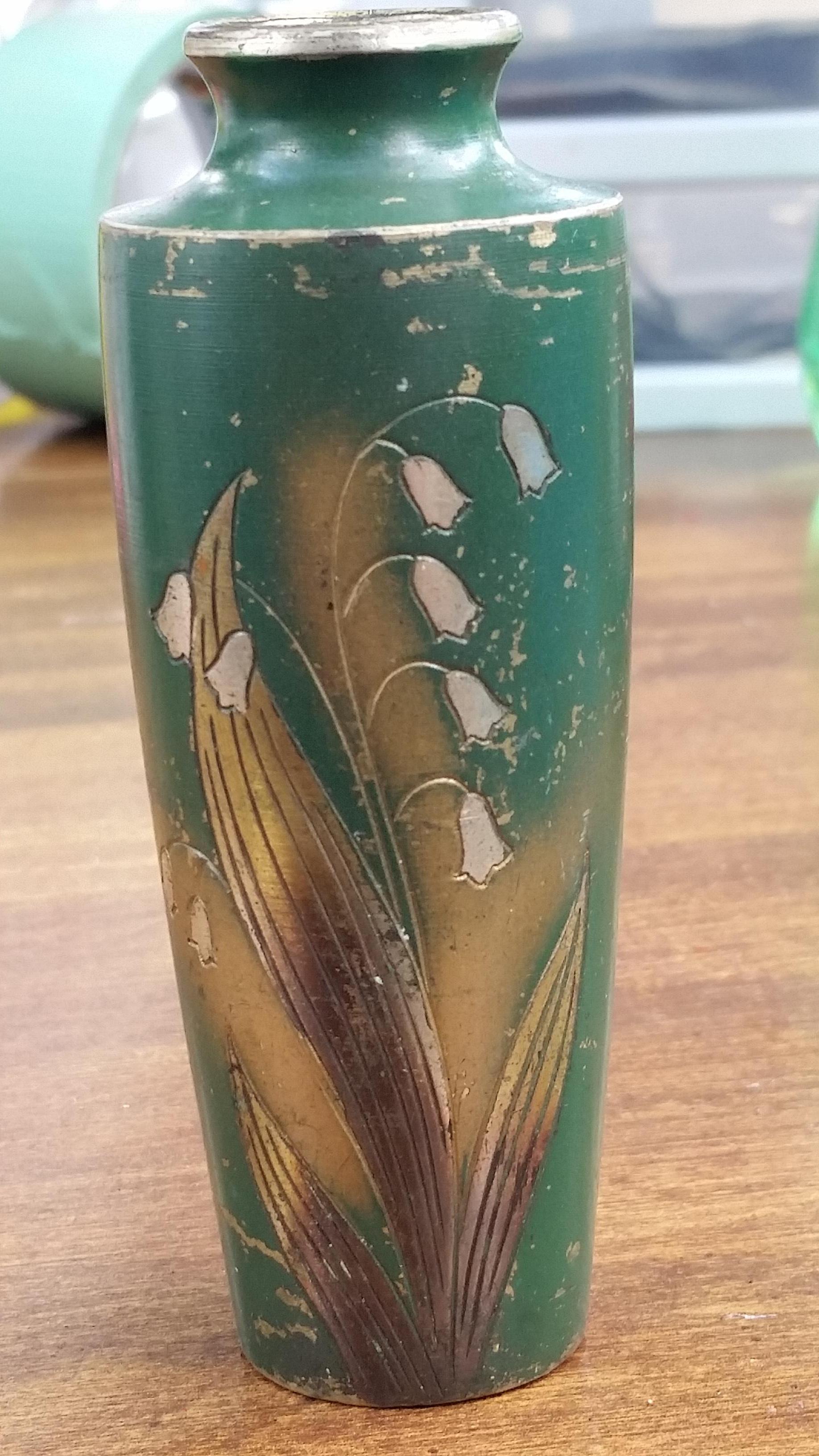 I got this vase at a rummage sale 18 years ago. It seems to be made of brass, is etched with a lilly of the valley and is painted green and gold. It also has two small Chinese or Japanese characters on the back.