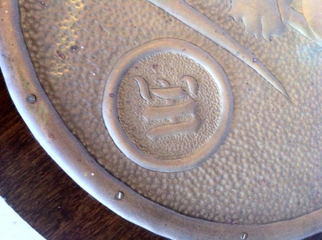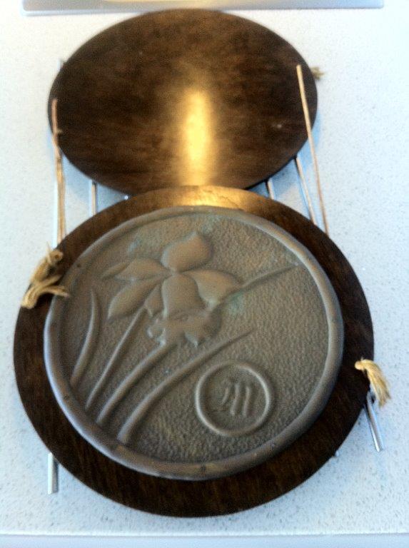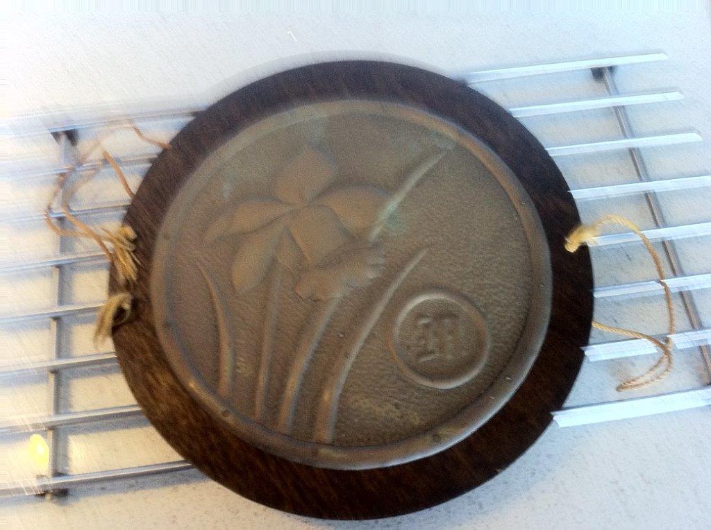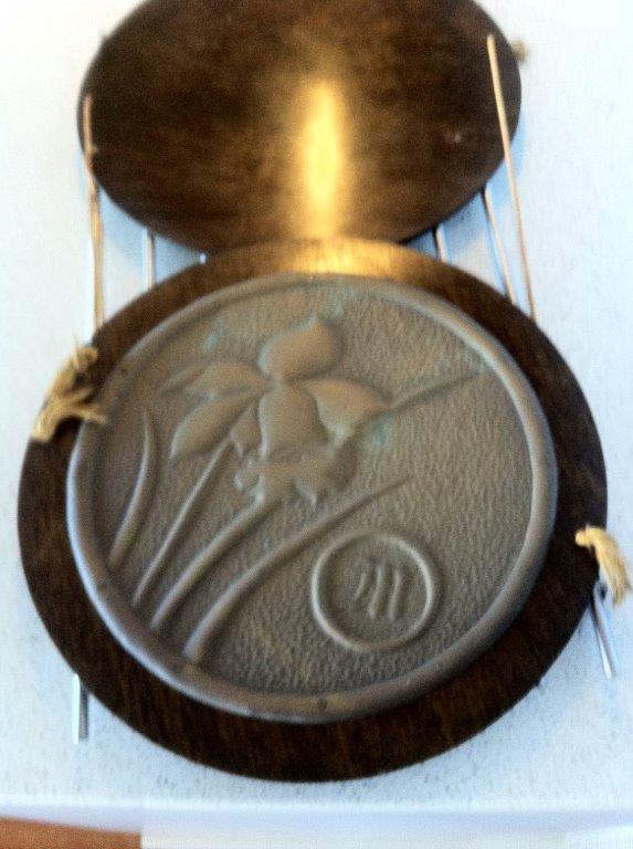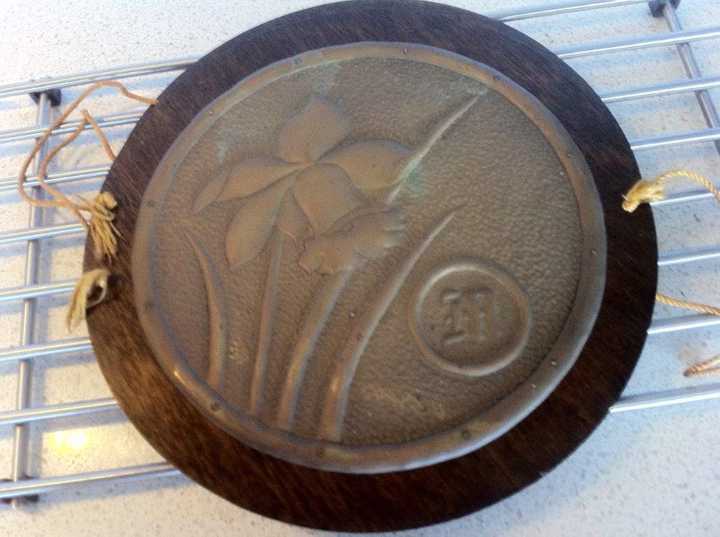 The front piece is embossed- I suspect with Beaten Brass- with an image of a Daffodil and with initials on the bottom RHSide.