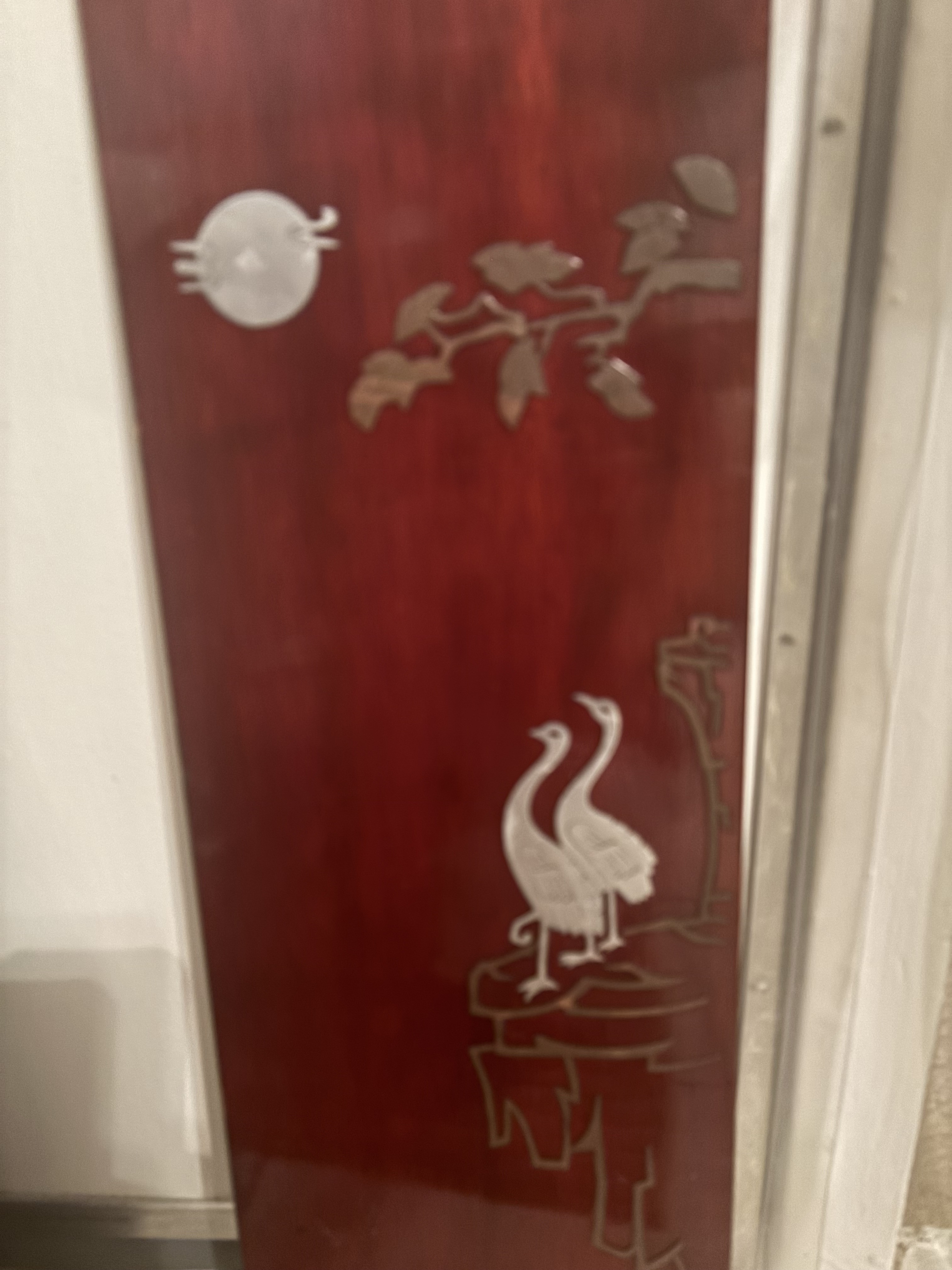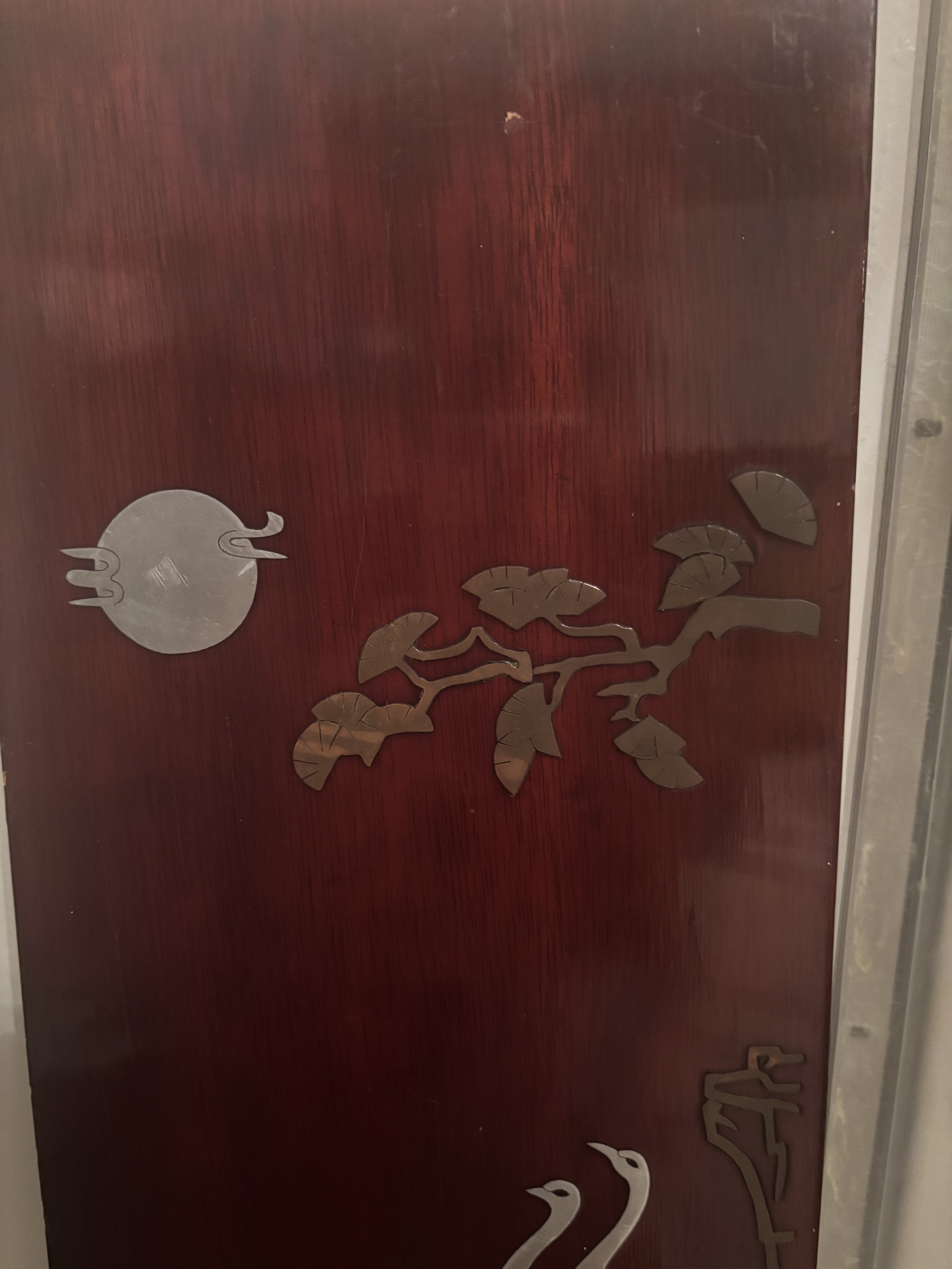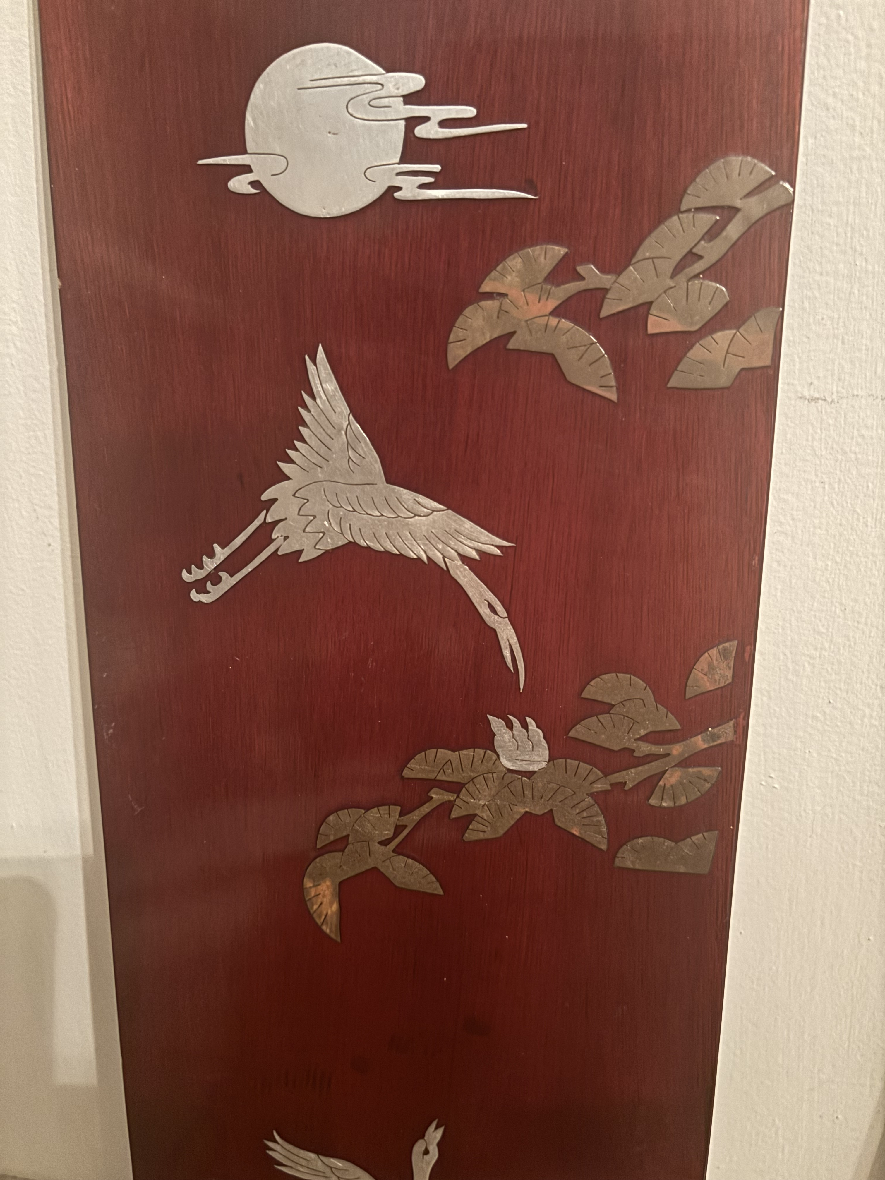 This piece likely originates from East Asia, where wood inlay techniques have been practiced for centuries. The cranes depicted are significant in Asian culture, symbolizing longevity and good fortune. The craftsmanship reflects traditional methods that emphasize intricate design and natural materials.