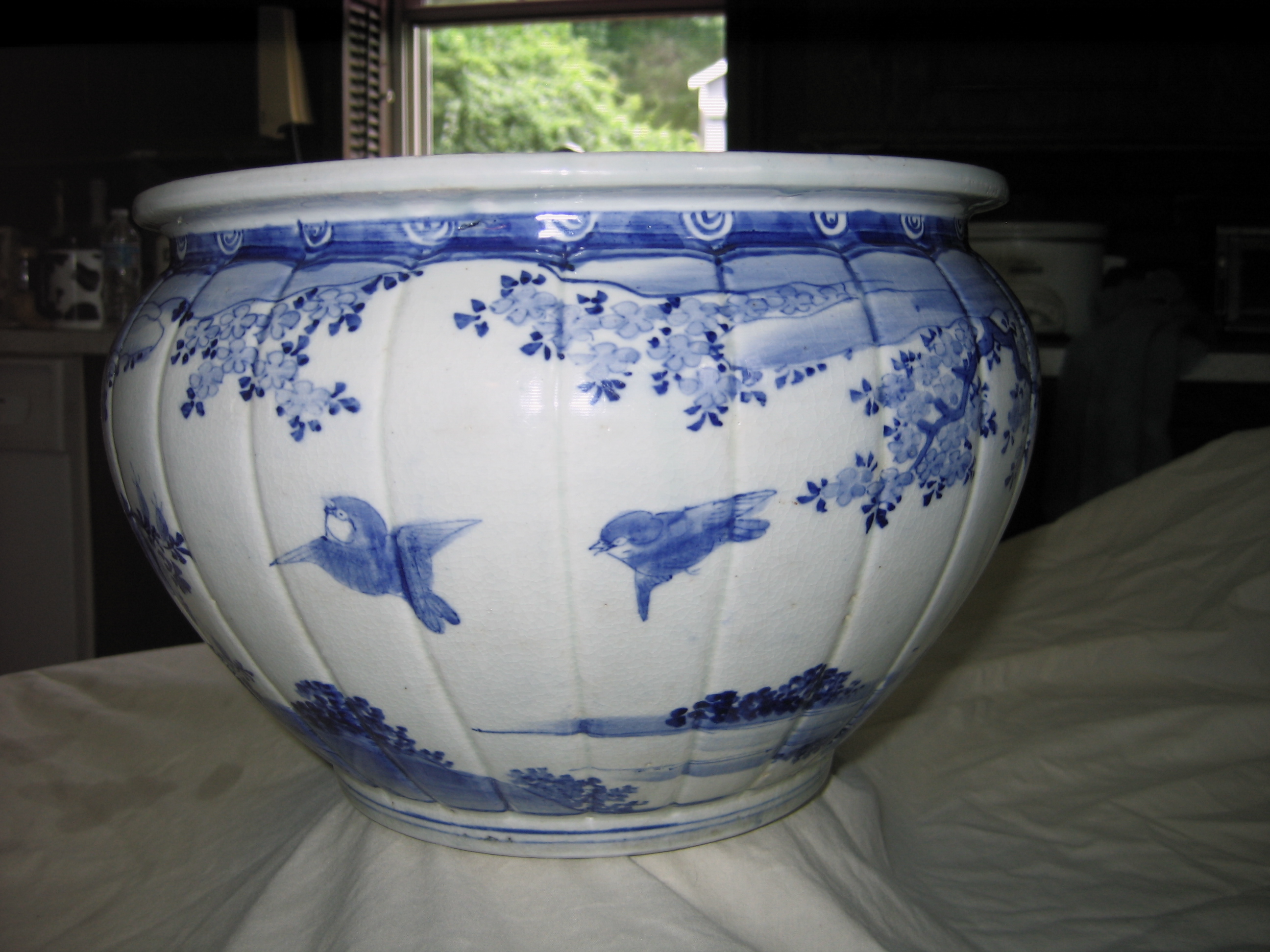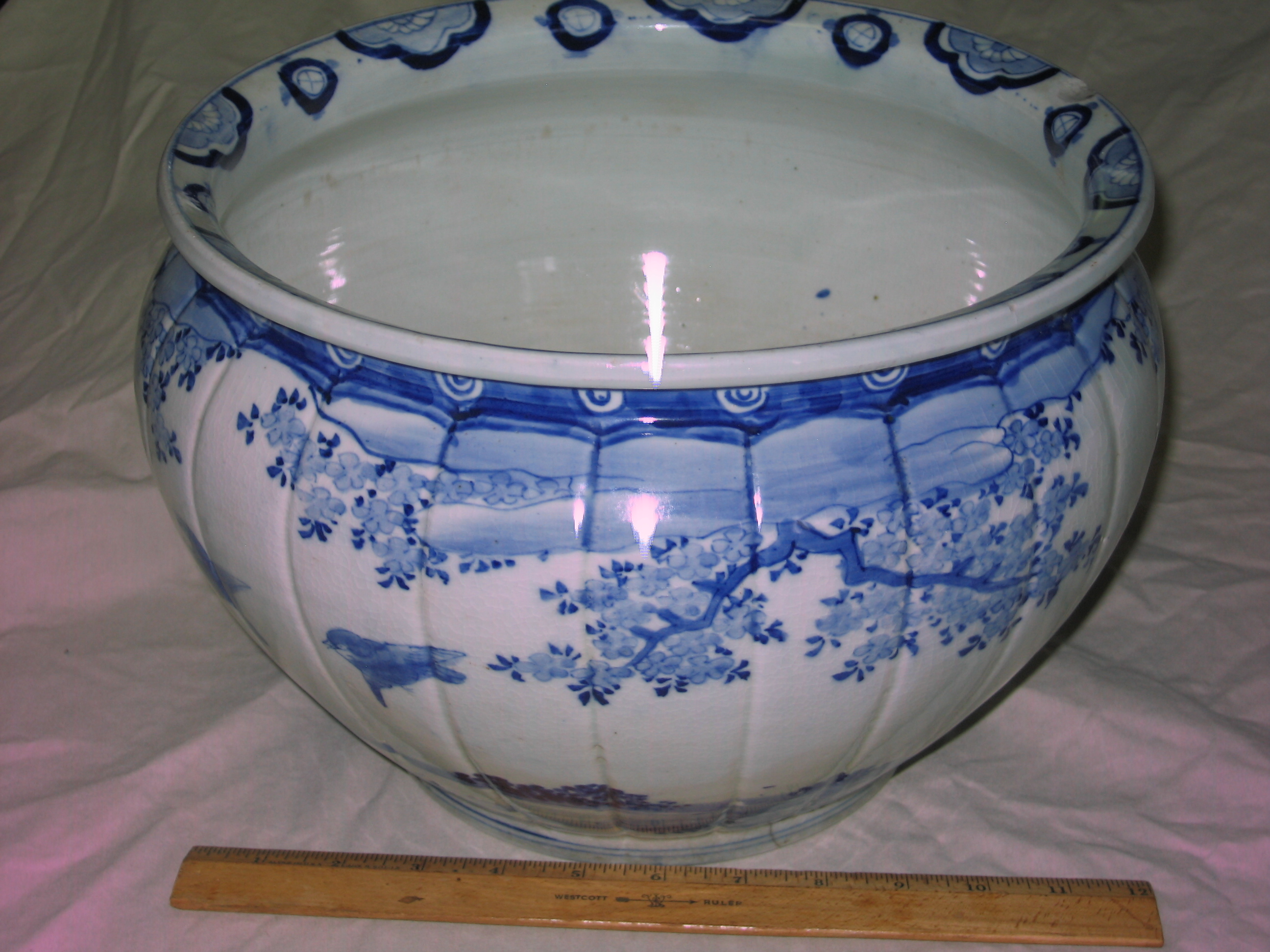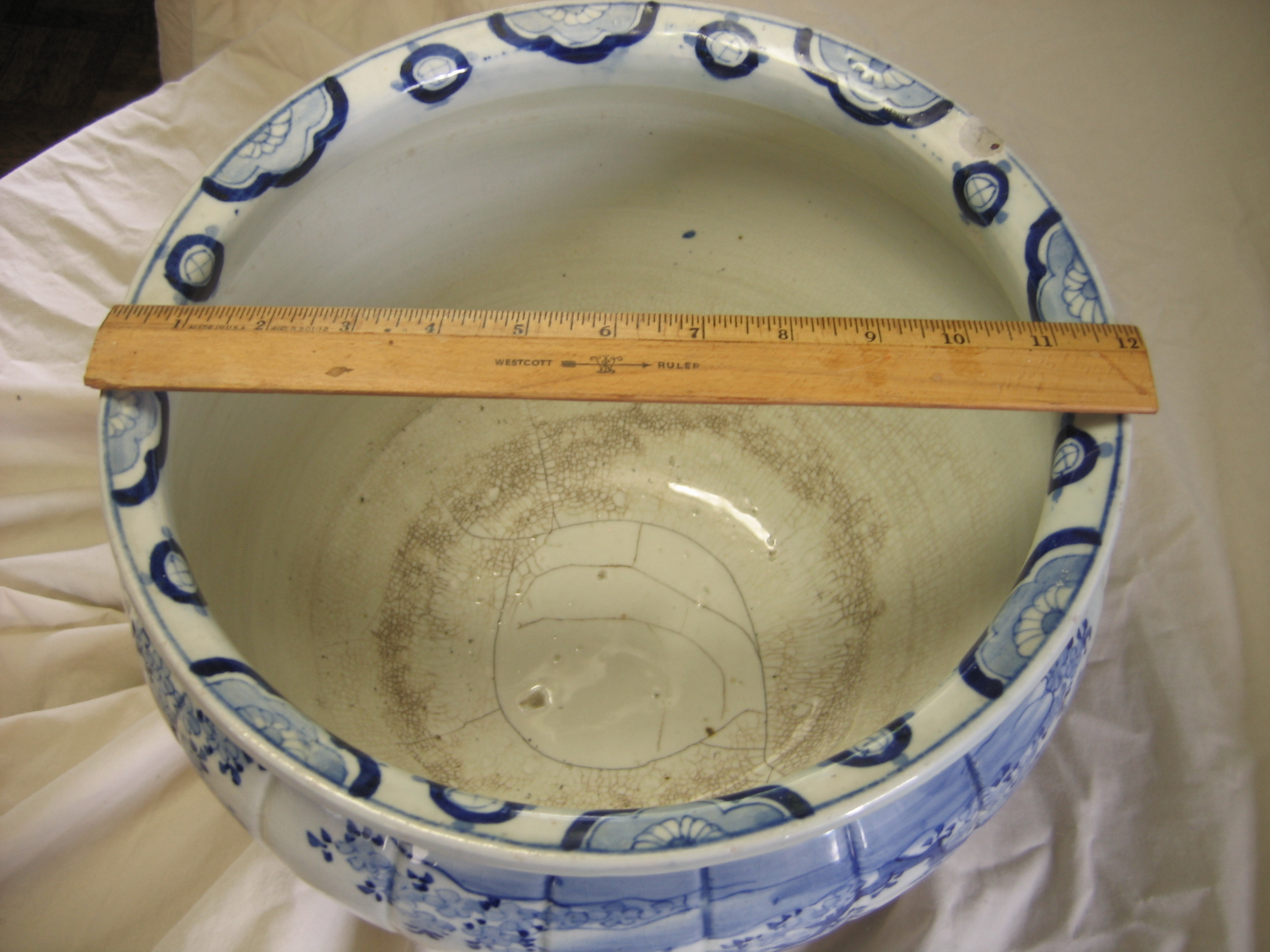This blue and white Jardinière was given to my Grandmother in 1938 and I am told it was old then (who knows what grandma thought was old thenJ), I know nothing of its origin or history. It is approximately 12” x 10” I can not find any maker marks on it.