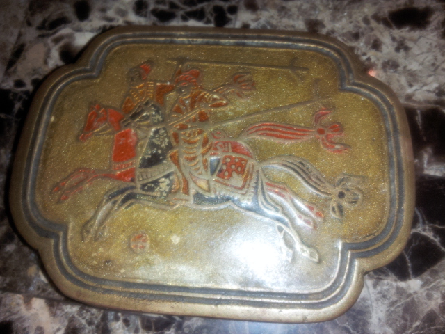 I picked this jewel up unknowing what it was. It is really heavy for its size and examining the paint a little closer you can determine that the paint seems withered and somewhat old. I'm not sure of the origins of this piece are but it does seem pre industrial civilization. The picture on top depicts two Asian men playing a game on a horse. I believe it might be Mongolian but the men do not seem to be warriors and I'm not educated enough to decipher its ethnicity. They seem to be playing a sport that involves a ball and two pitch fork- like objects. One of the horses are blue as the other is red. I am very interested in maybe learning more of this amazing history and thank you for reading