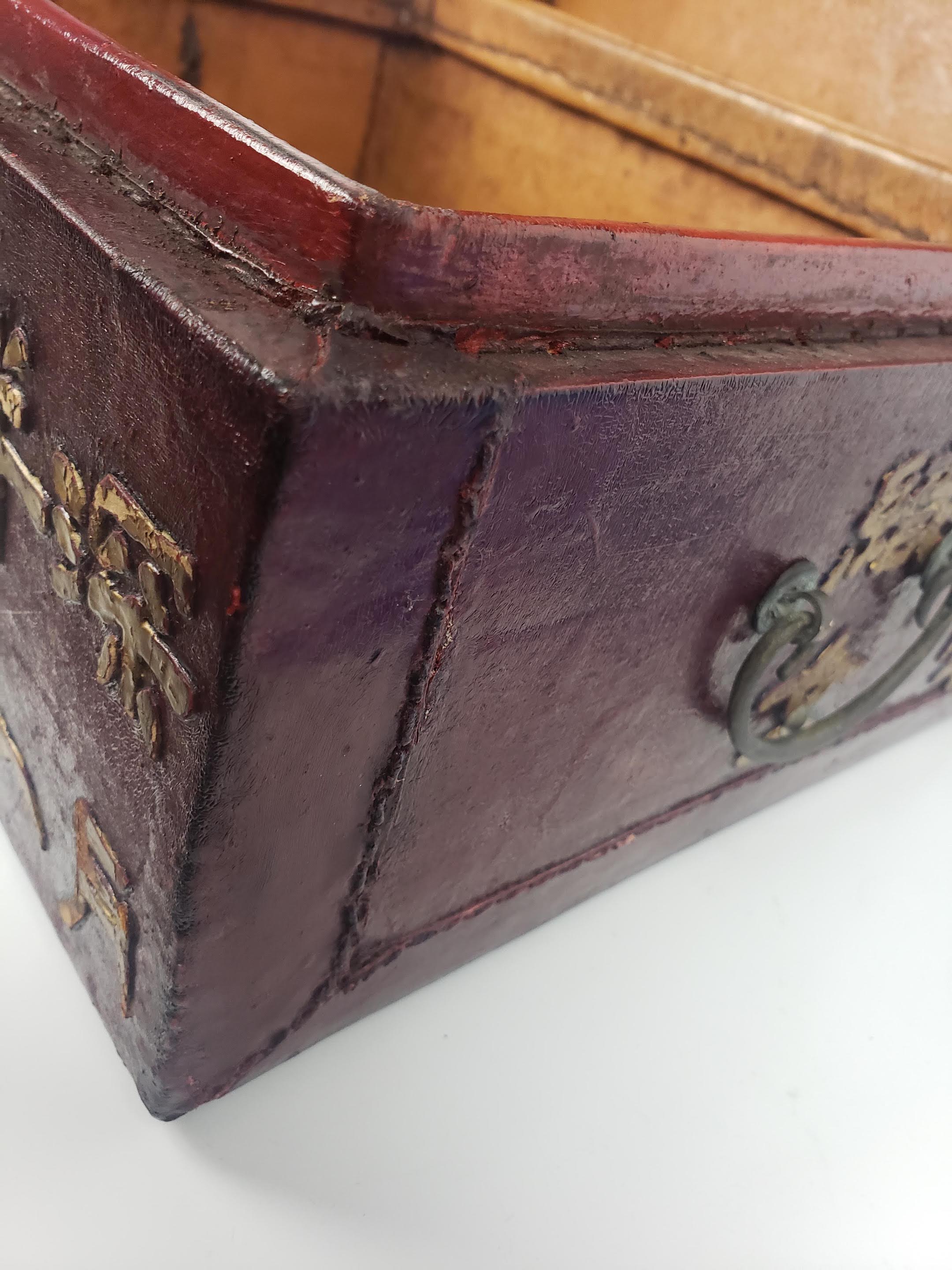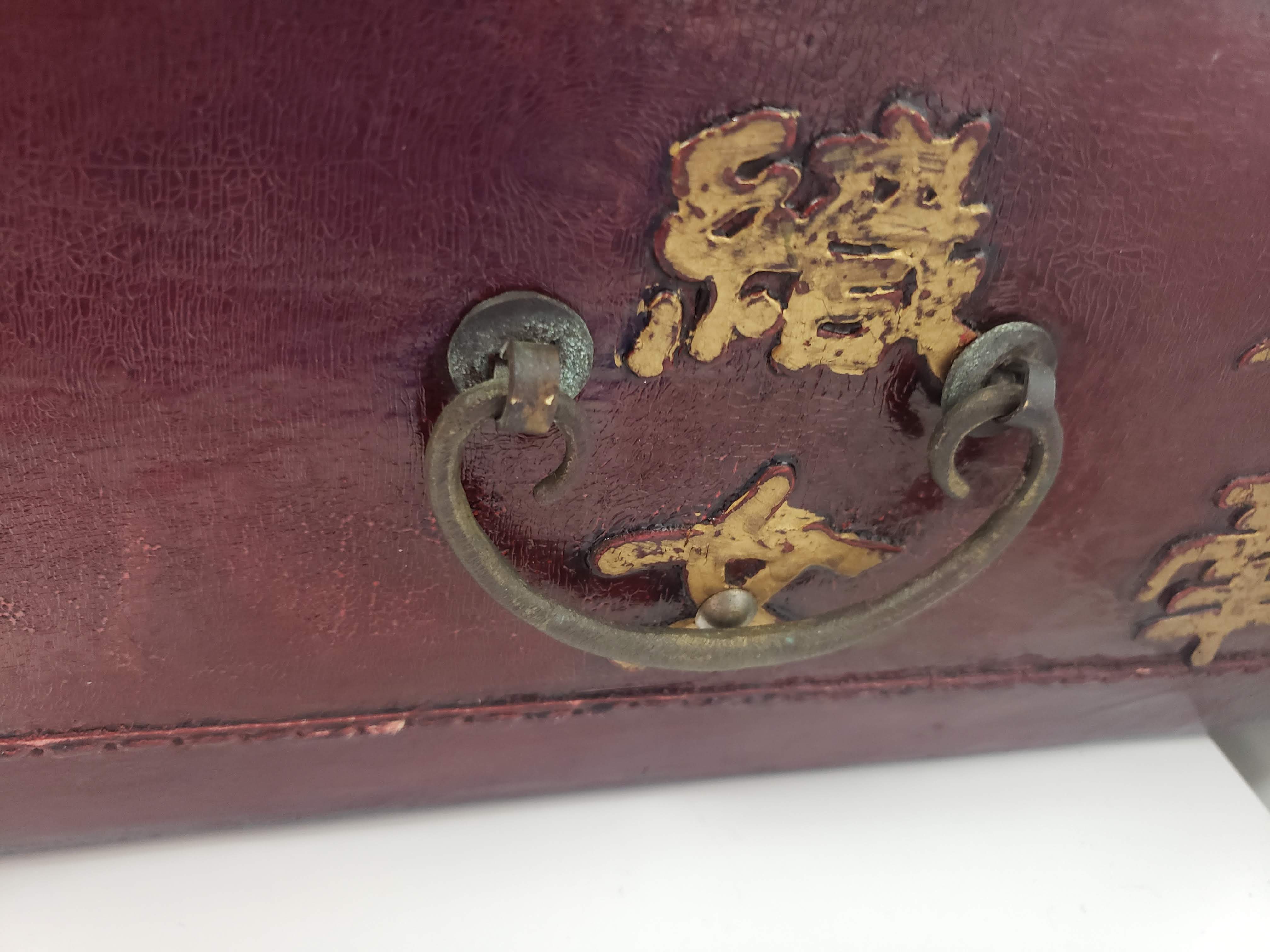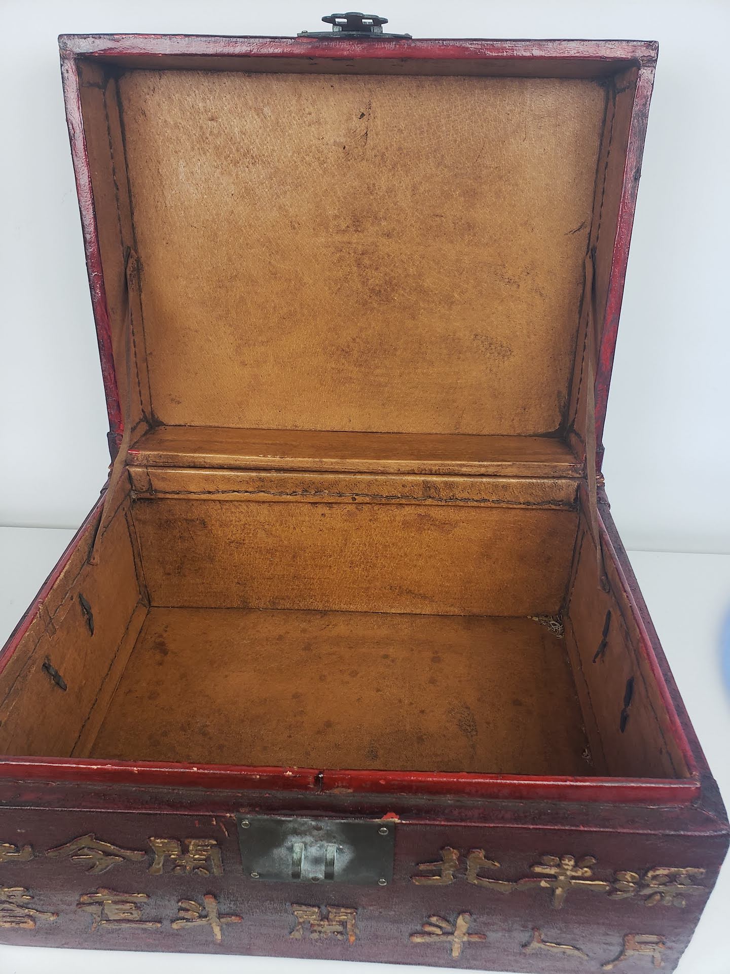 Was wondering the age of this box or any info. It is red with raised gold letters. Others I have seen said it may be lacquered leather. Has suede straps on either side. I have no idea if this is old or a reproduction. It is in very good shape. Leather on the inside and stitching on corners and seams. Thank you.