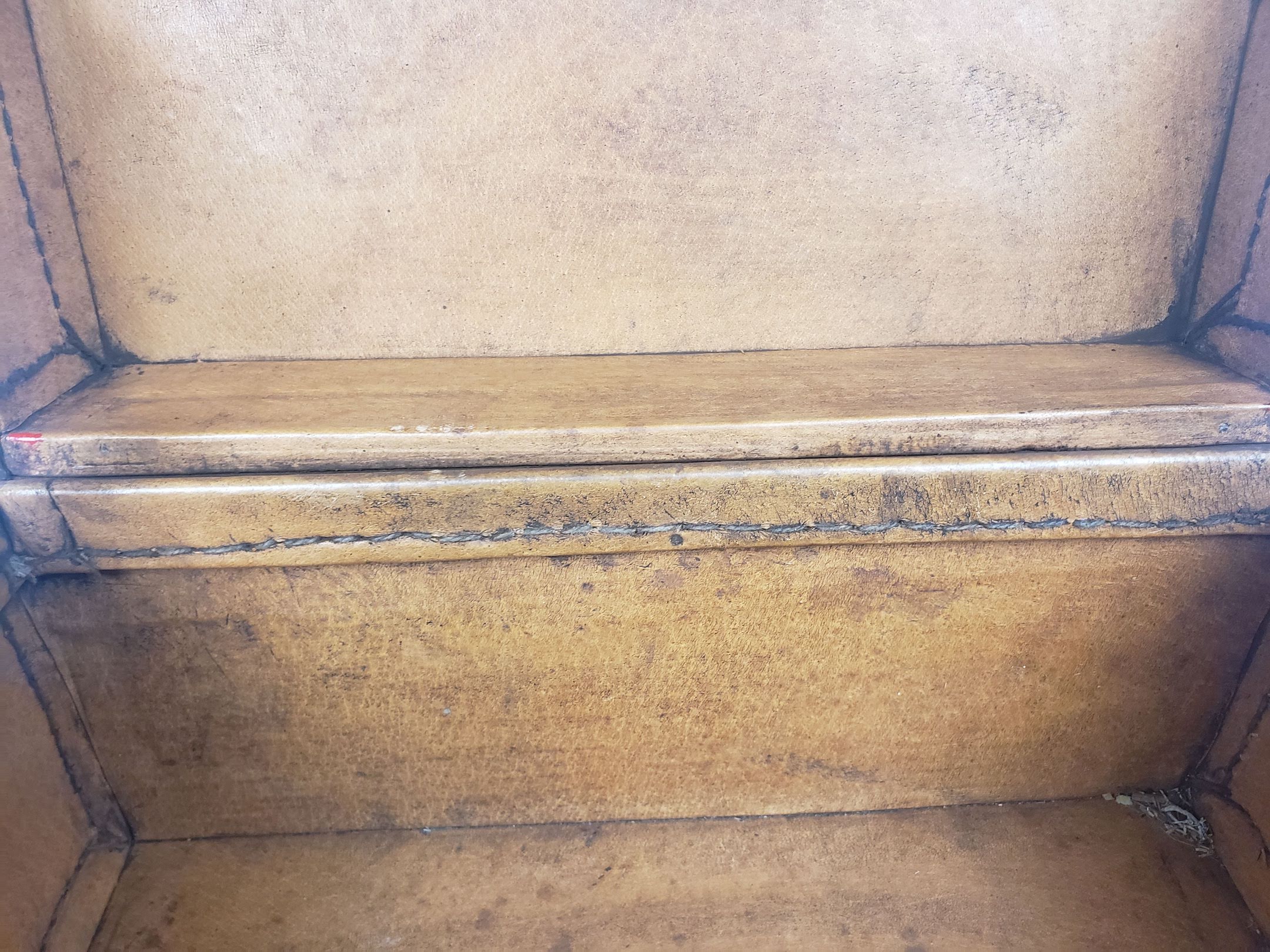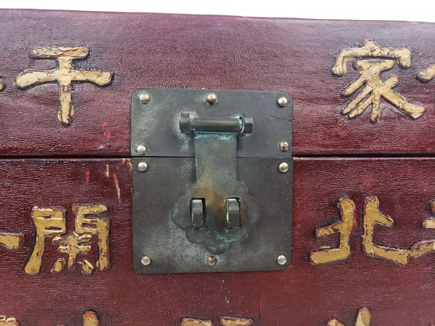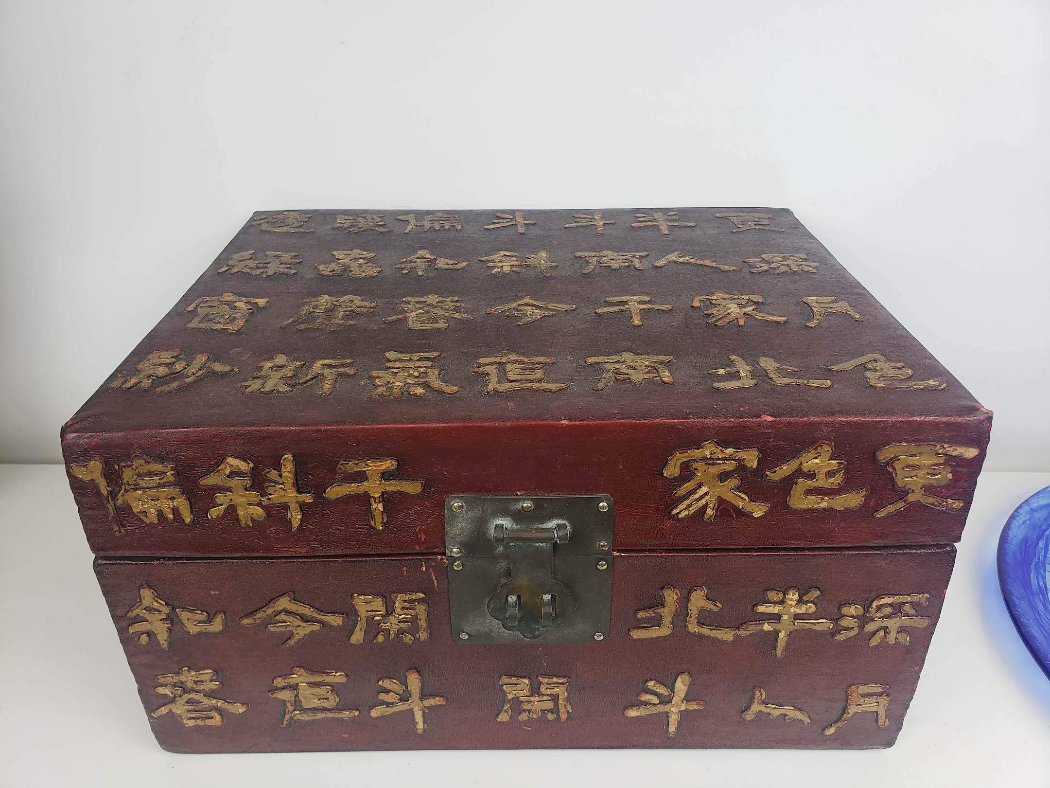 Was wondering the age of this box or any info. It is red with raised gold letters. Others I have seen said it may be lacquered leather. Has suede straps on either side. I have no idea if this is old or a reproduction. It is in very good shape. Leather on the inside and stitching on corners and seams. Thank you.