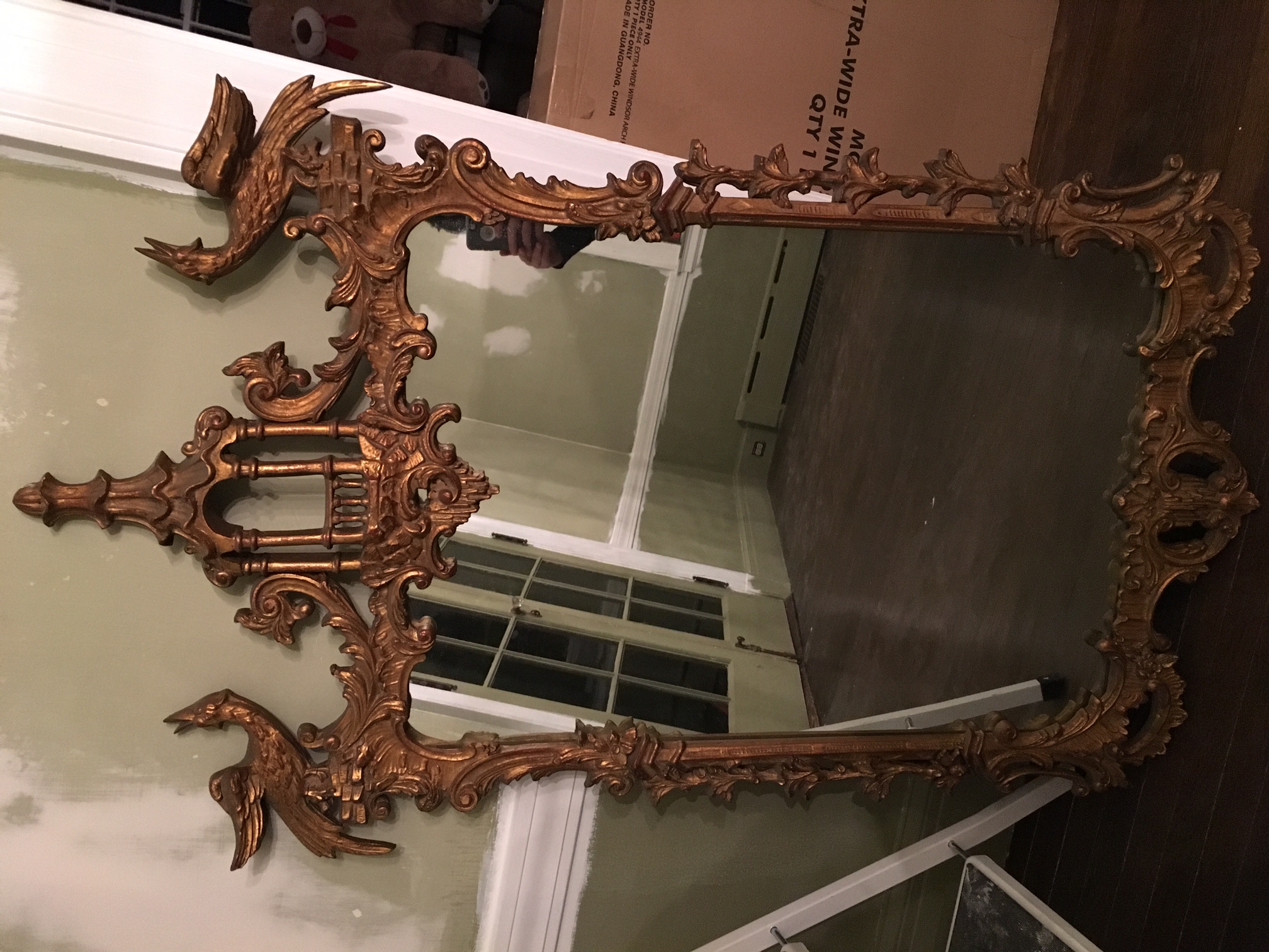 We were left 2 of these mirrors by the previous homeowners. They feel like solid wood with a brass paint finish. We are wondering if they are antique, replica, and if anyone has a value that would be terrific. There are no additional helpful clues on the back of the mirrors. Thank you.