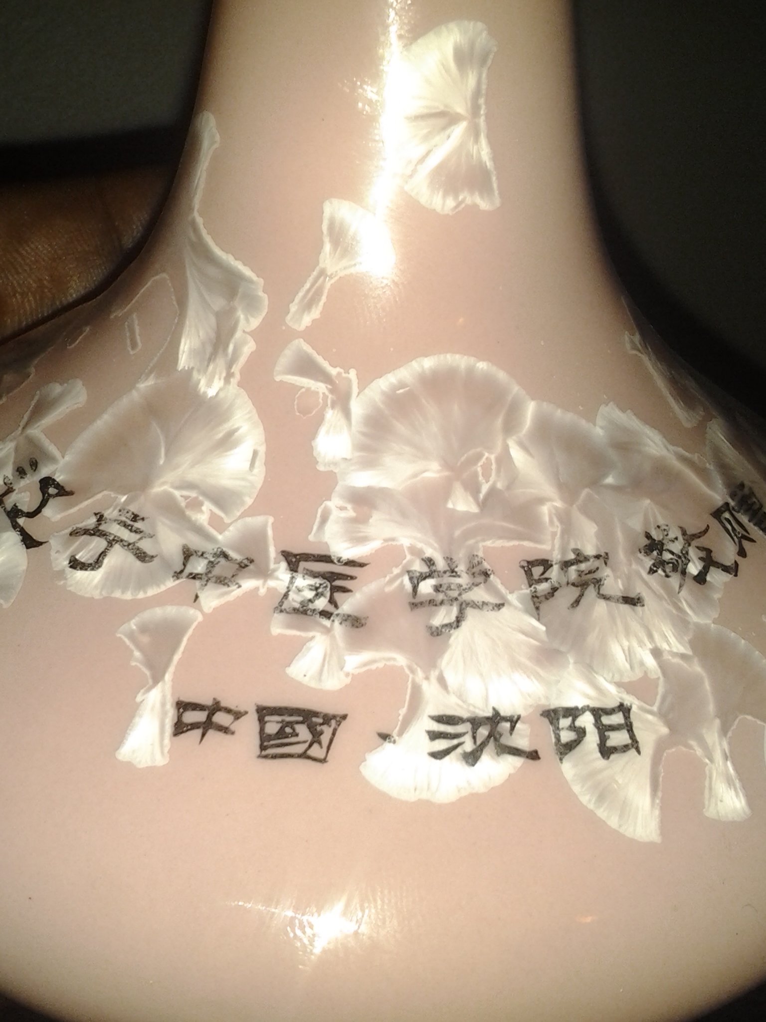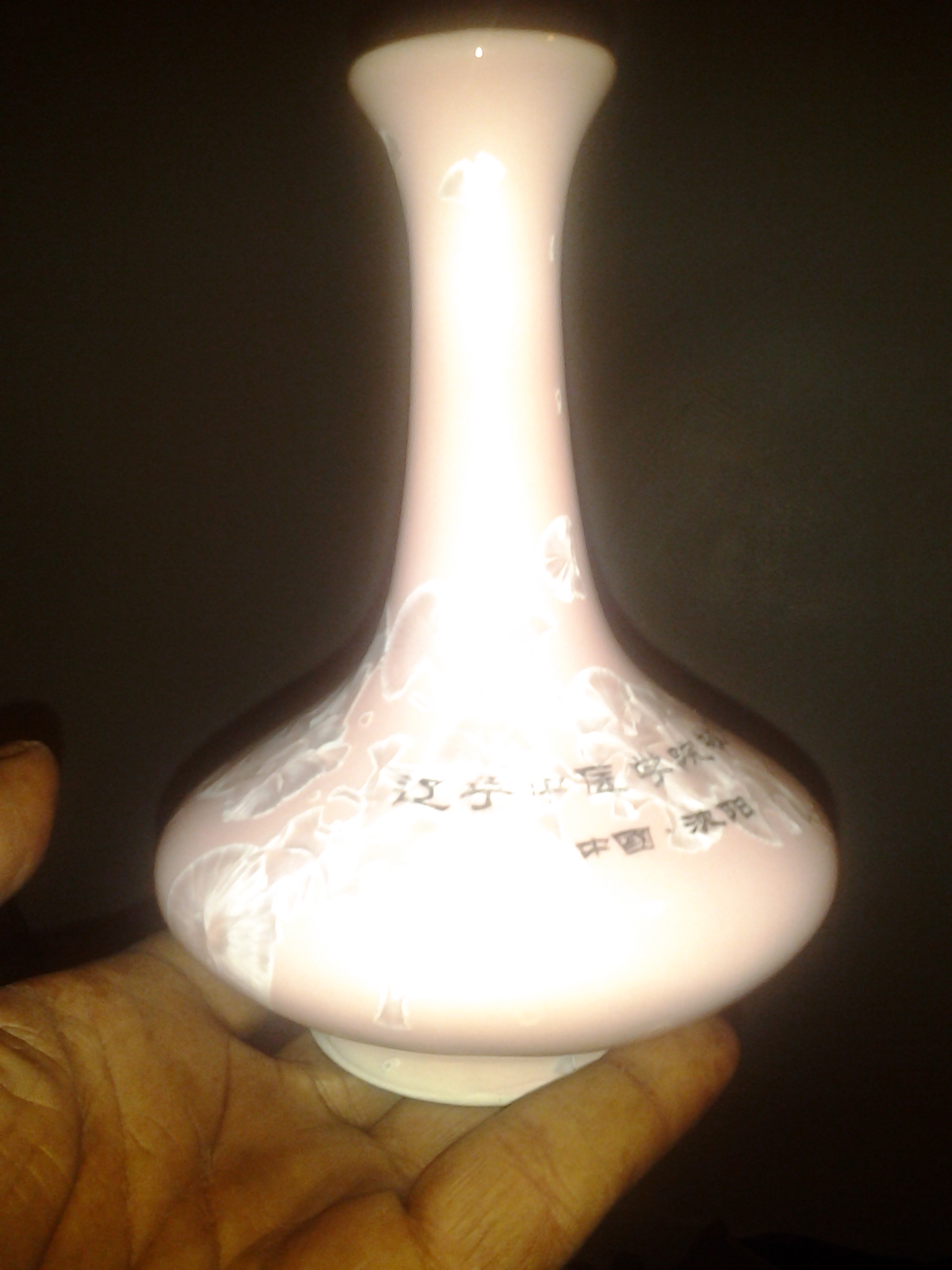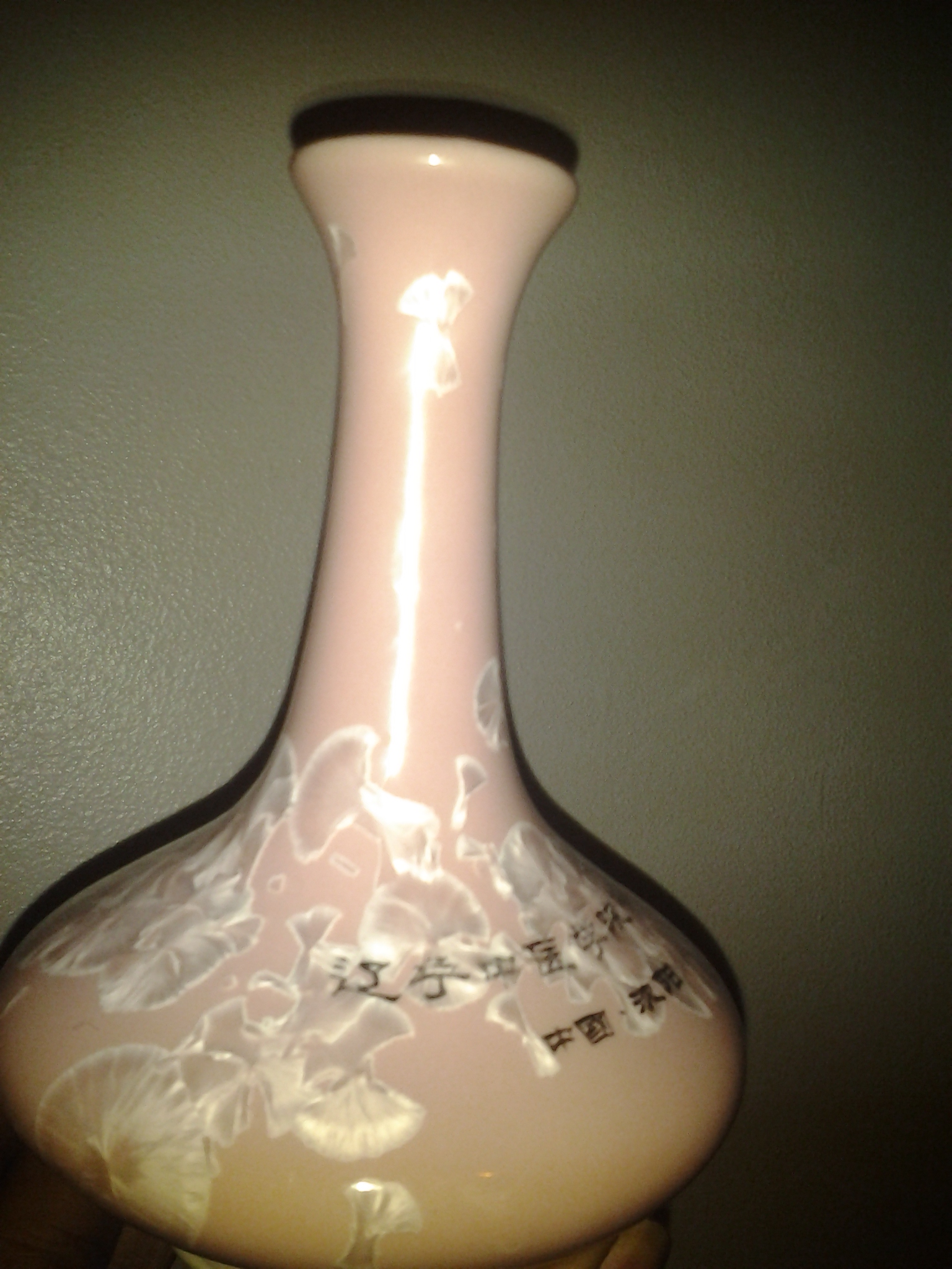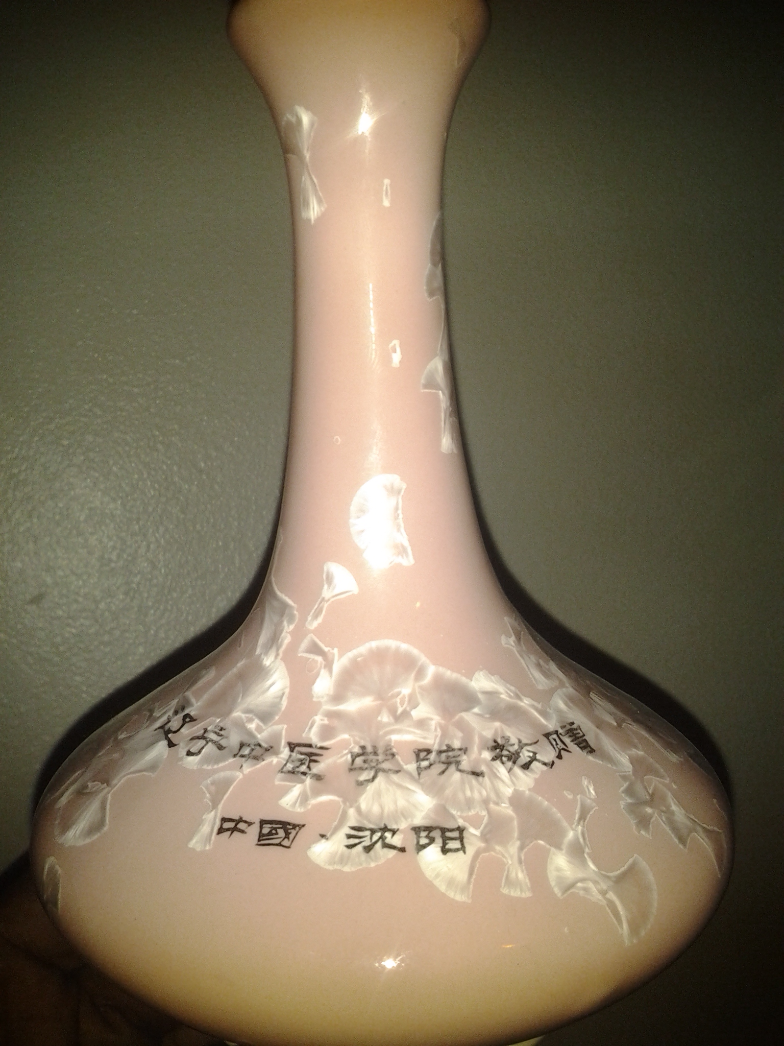 Chinese or asian vase small in pink with gold words engraving on it with some type of chinese letters with blue asian or chinese words on the bottom under the vase
