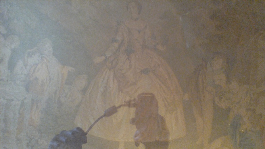 The print (an etching and engraving) is by Jacques Philippe Le Bas (1707-1783), produced after a painting by Jean Baptiste Pater (1695-1736). It is a portrait of a French actress, Marie Anne Botot Dangeville (1714-1796), who was known as 'Dangeville le jeune' (the name used on the print). The print was announced for sale in the 'Mercure de France' in January 1732. In the earliest impressions the actress did not have the ribbon around her neck (as she does in this impression). The long title translated into English is: 'Mademoiselle Dangeville the younger, represented as Thalia, with Spirits dressed as different comedy characters'. Thalia was one of the nine Muses. She is particularly associated with comedy and pastoral comedy and often depicted holding a mask.