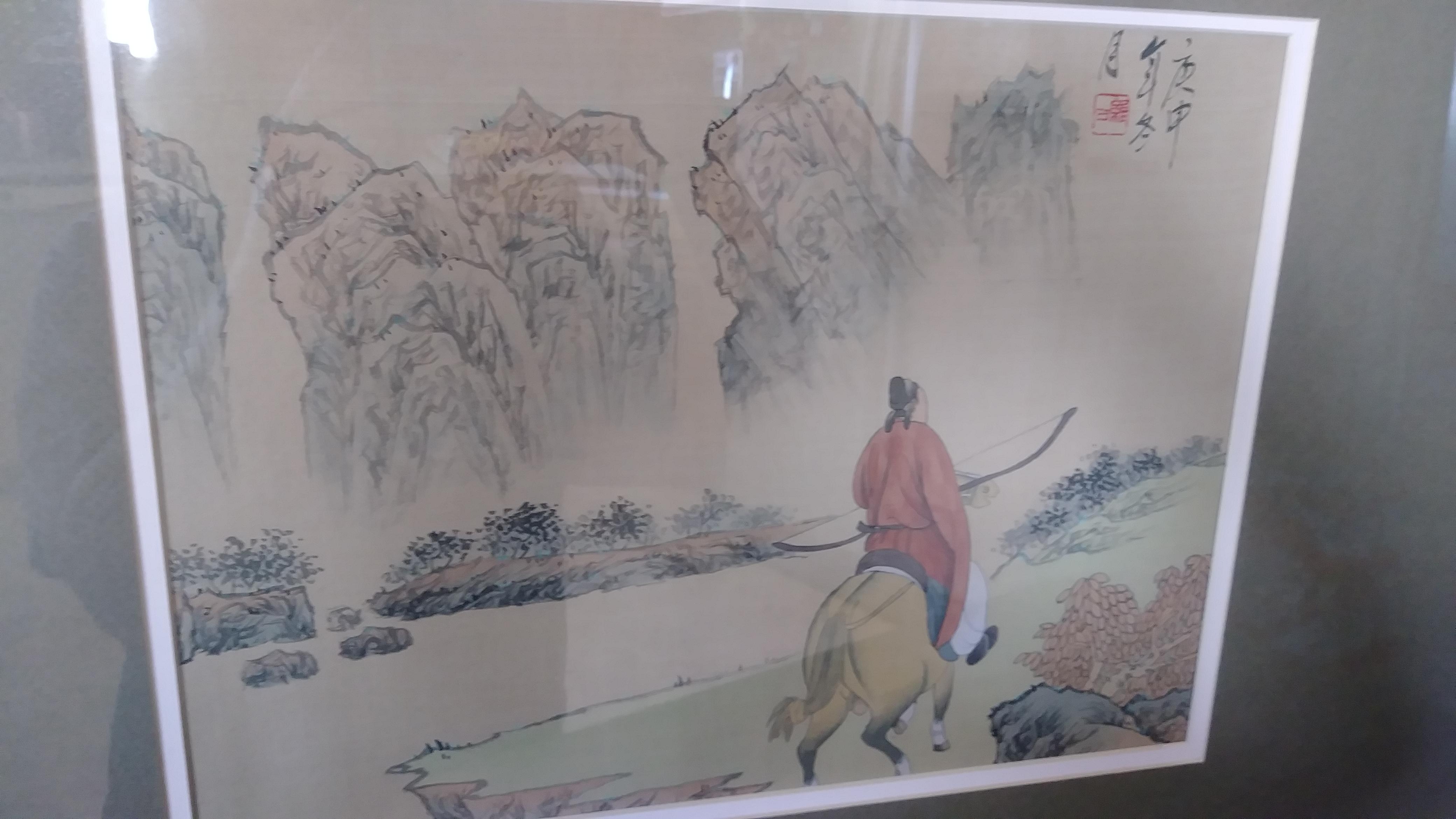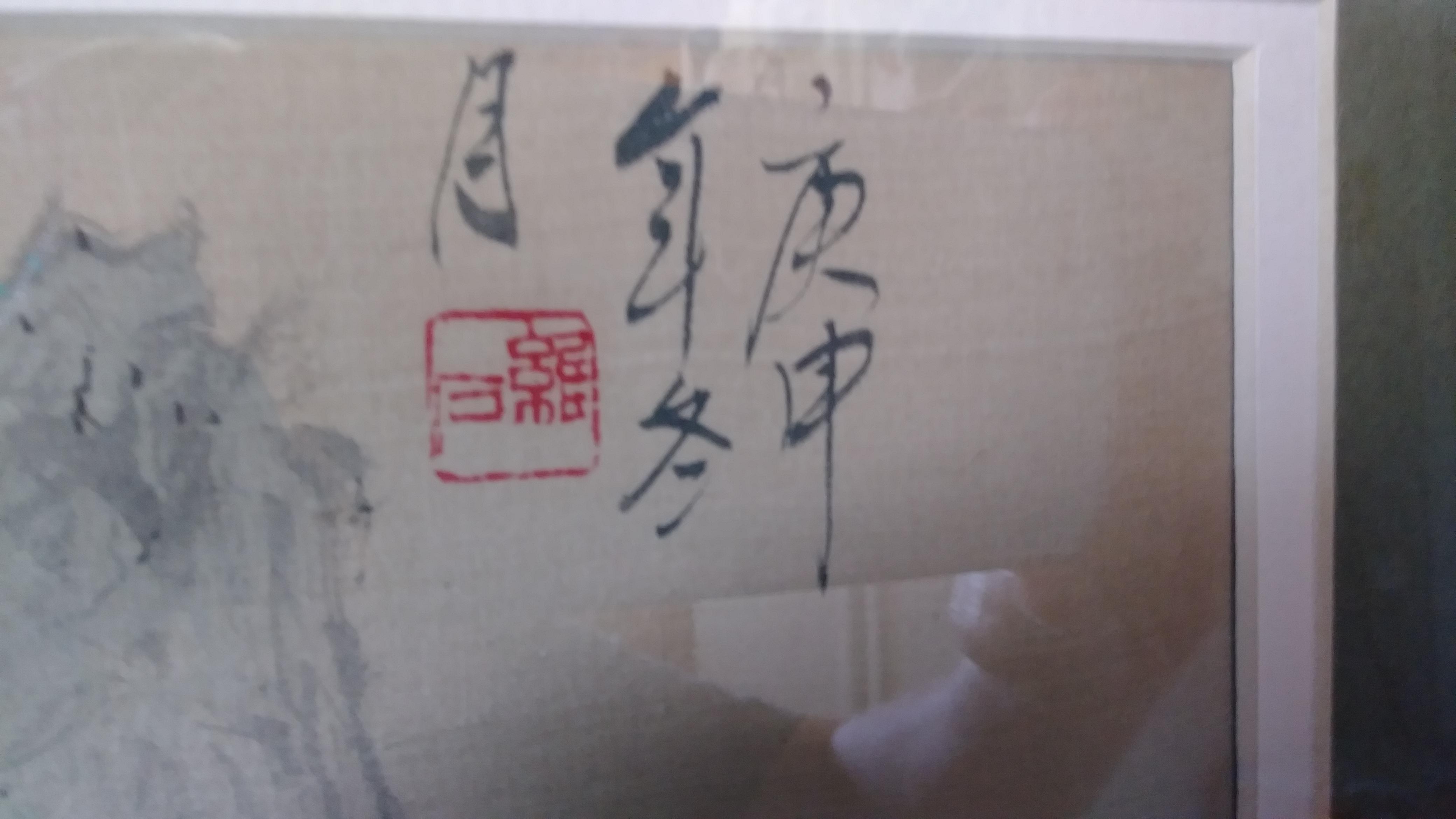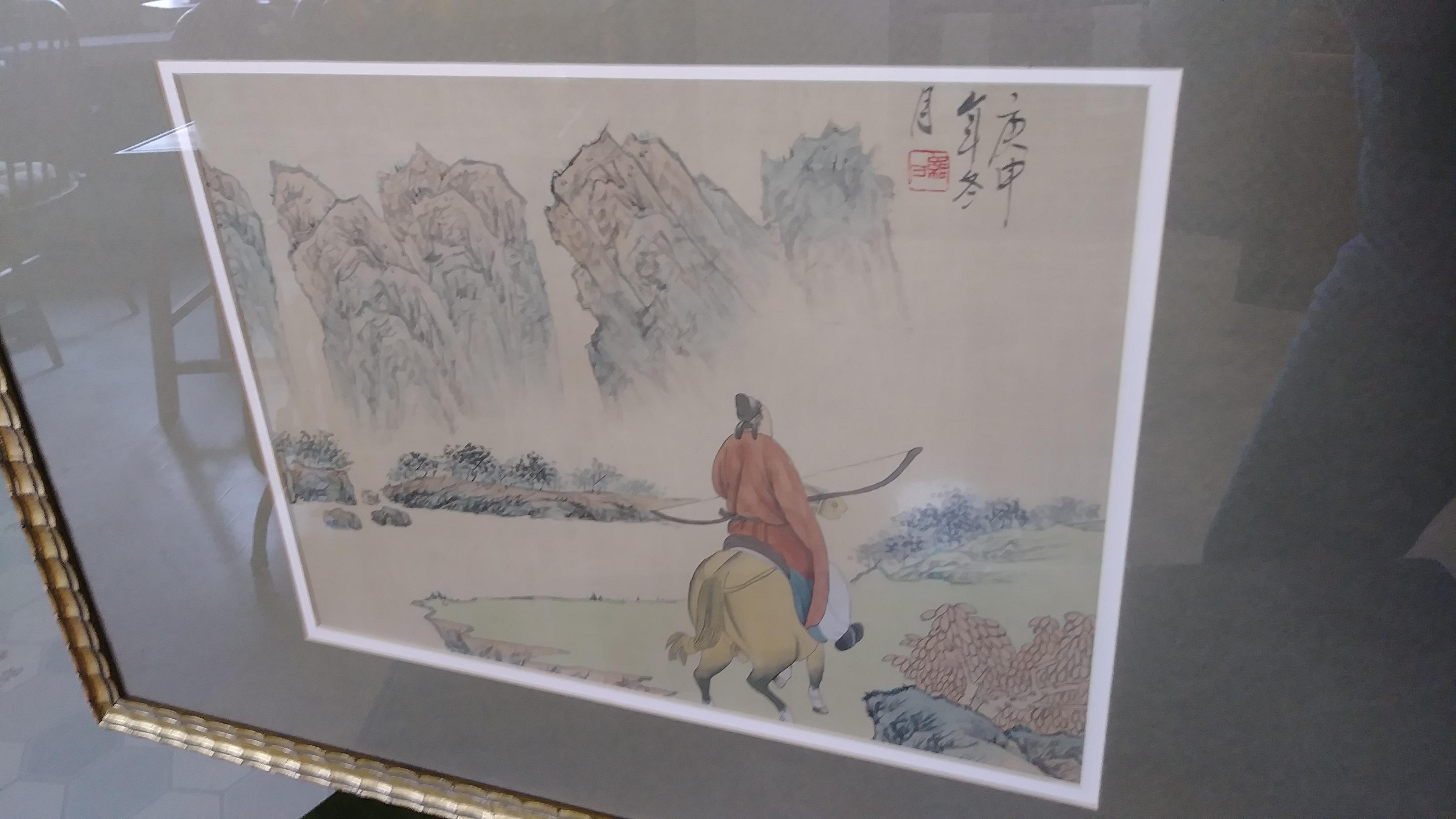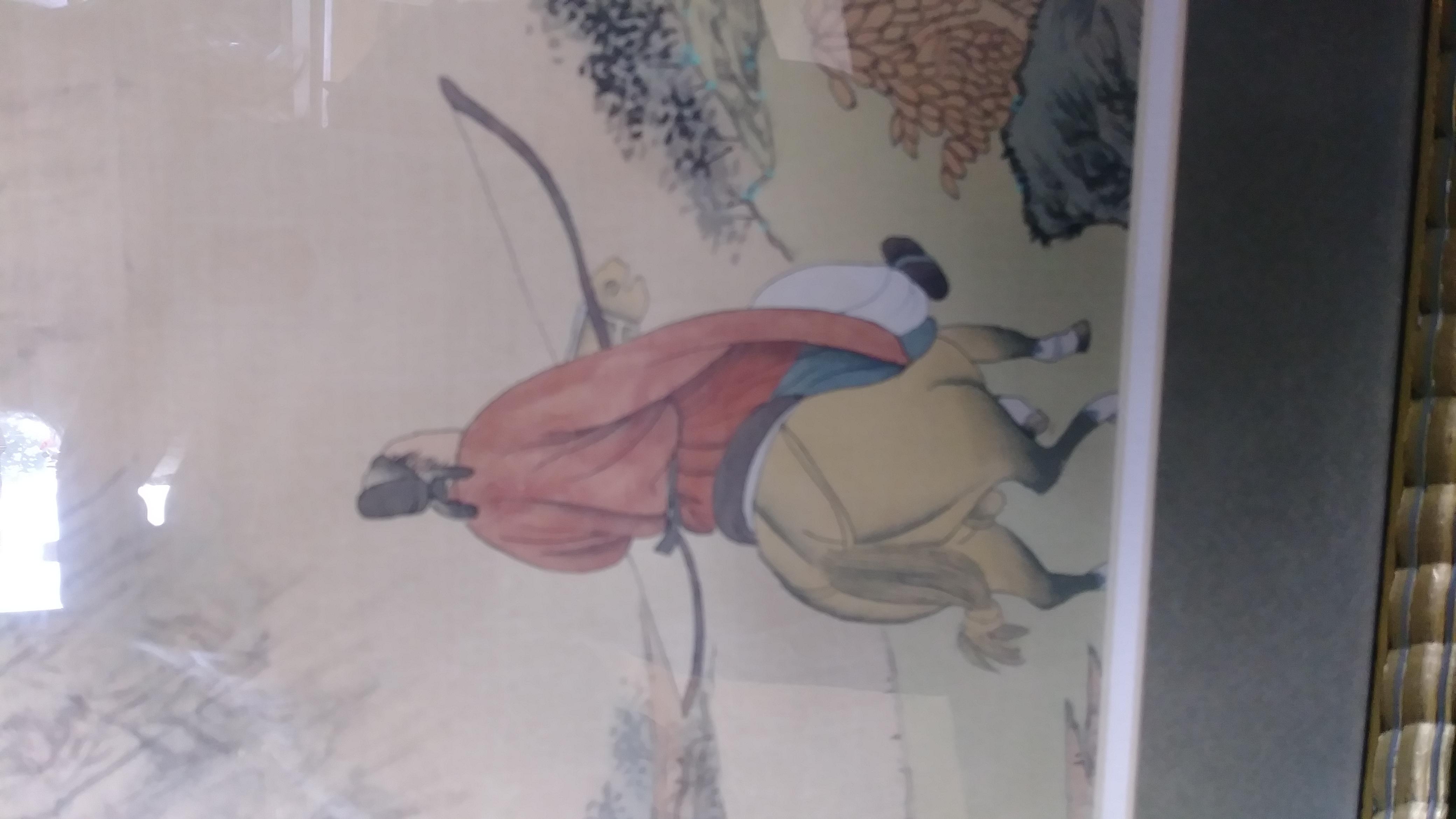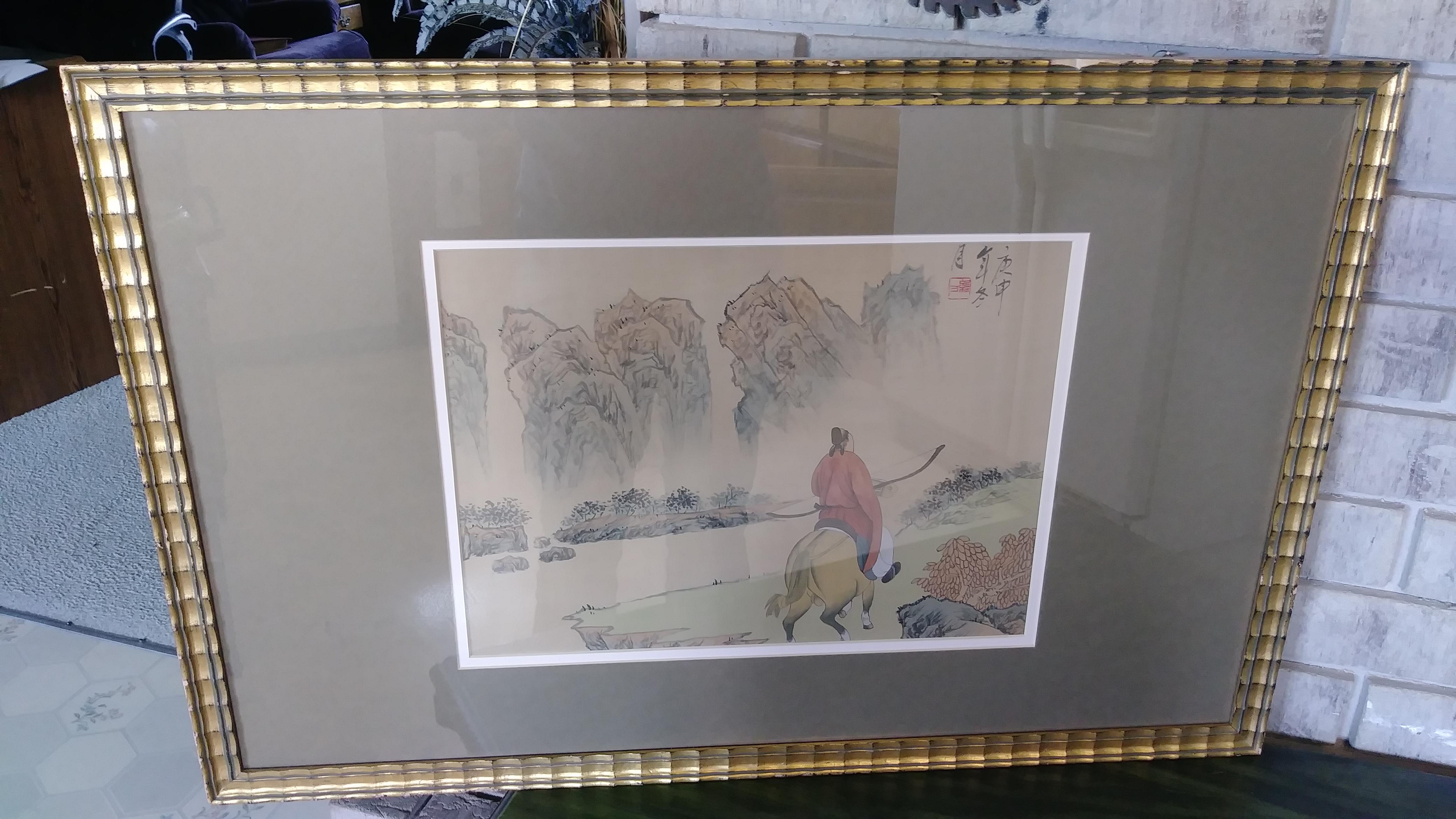 The image measures 15 w x 11 h in the frame it it is 28 x 19 I bought this painting and another like it signed differently at a charity store that came from the bay area in Calif.framed in a gallery in San Mateo, Cal. Looks pretty old as the ph # on the label doesn't give a area code. It looks to be silk and the rider is hunting or a warrior which is of old as he is carrying a bow and riding in old style saddle. This is in very excellent condition. The frame appears to bamboo has a few dings not bad though good vintage condition on the frame and the backing