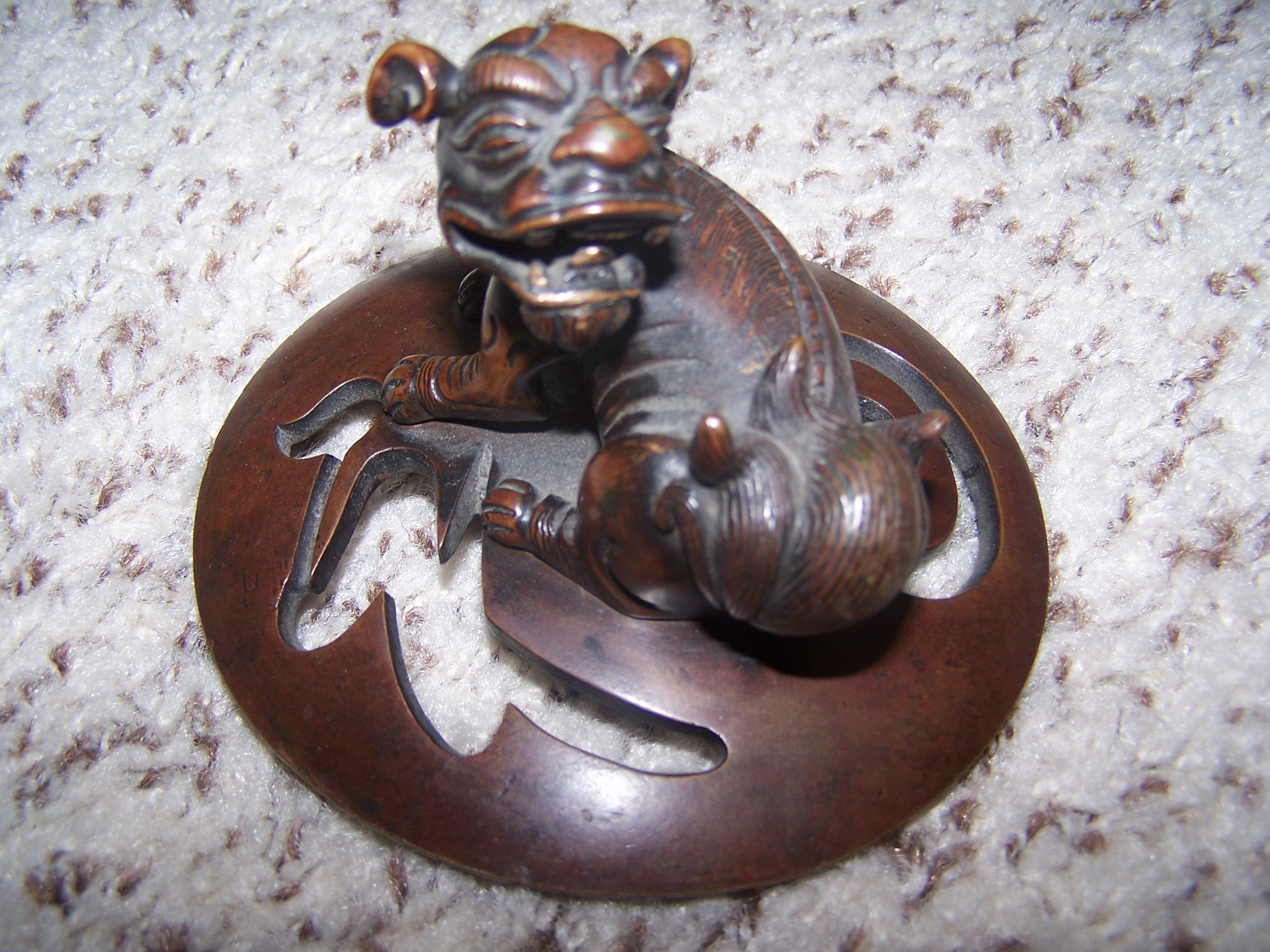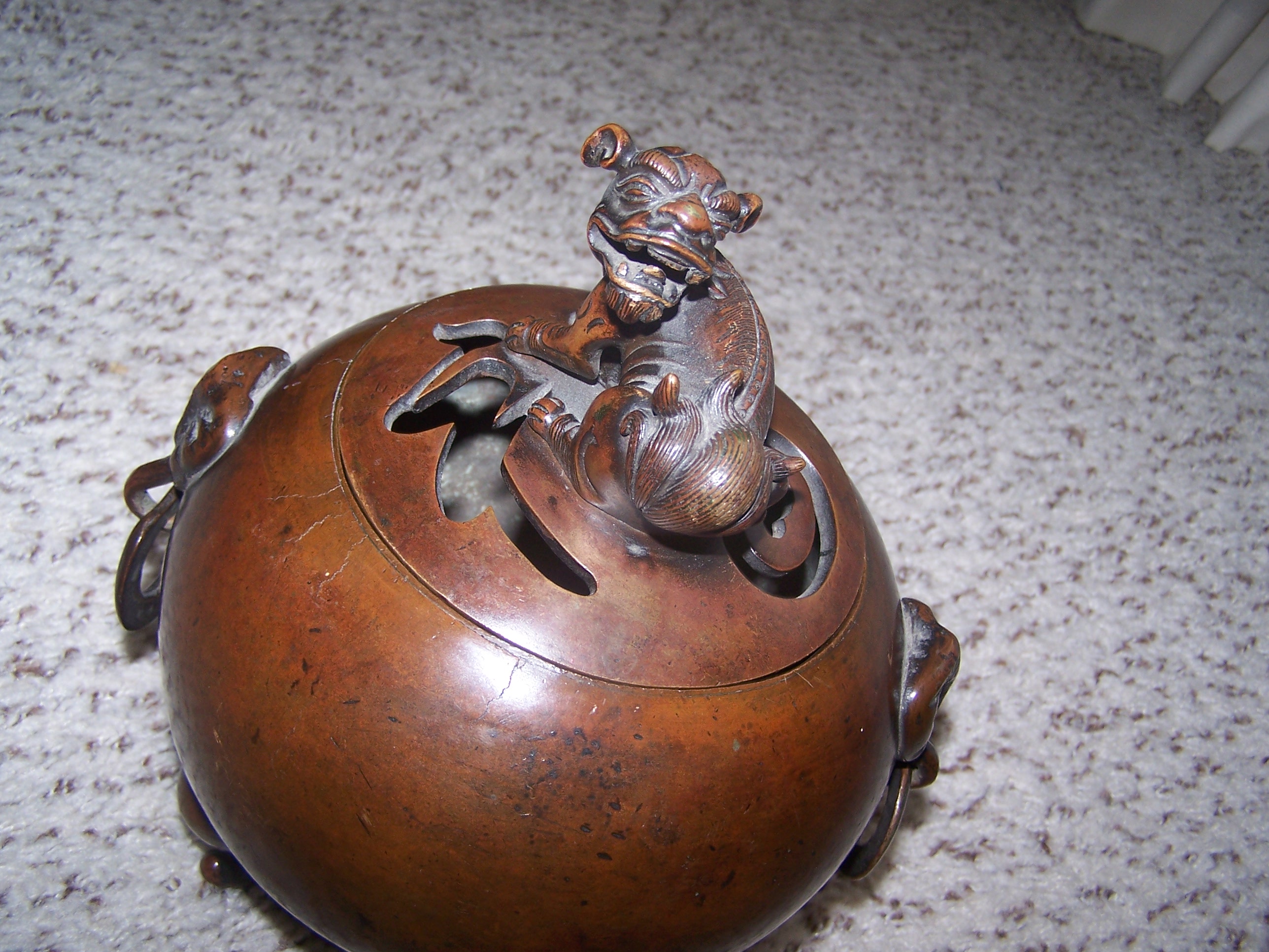 this item is approx 9 1/2" high 7 1/2" wide. Stands on three legs. Has Foo Dog lid. Lid is not perectly cementrical. Has two Elephants as side handles. It is marked as shown in pictures. Brown in color, could be metal or ceramic