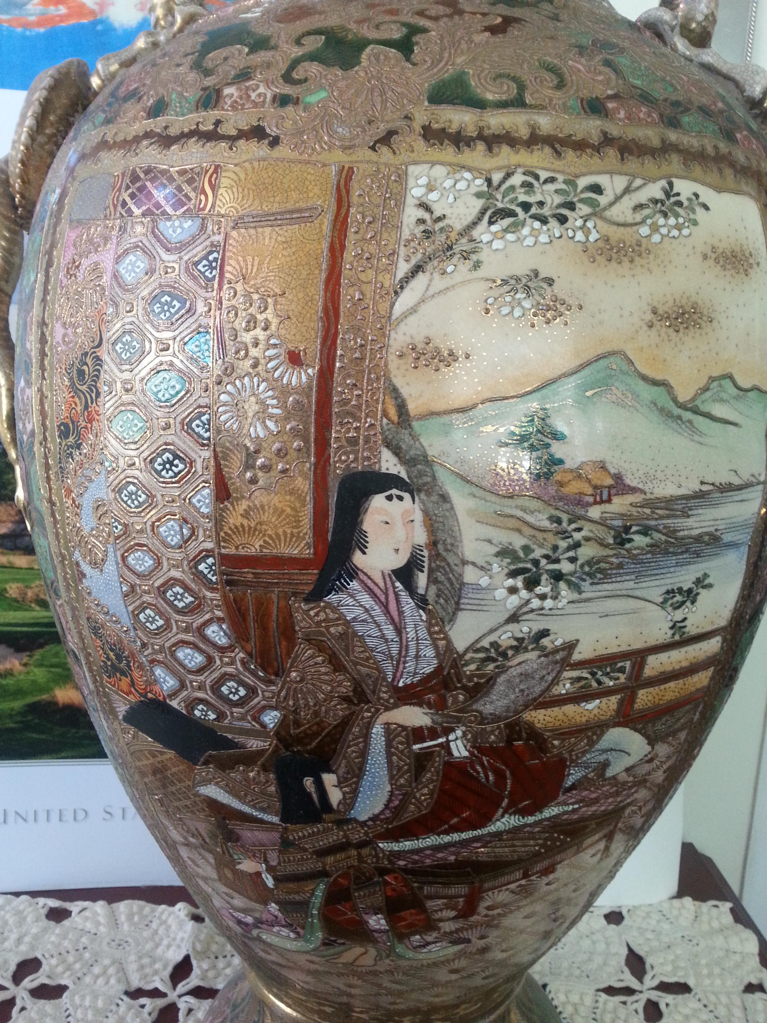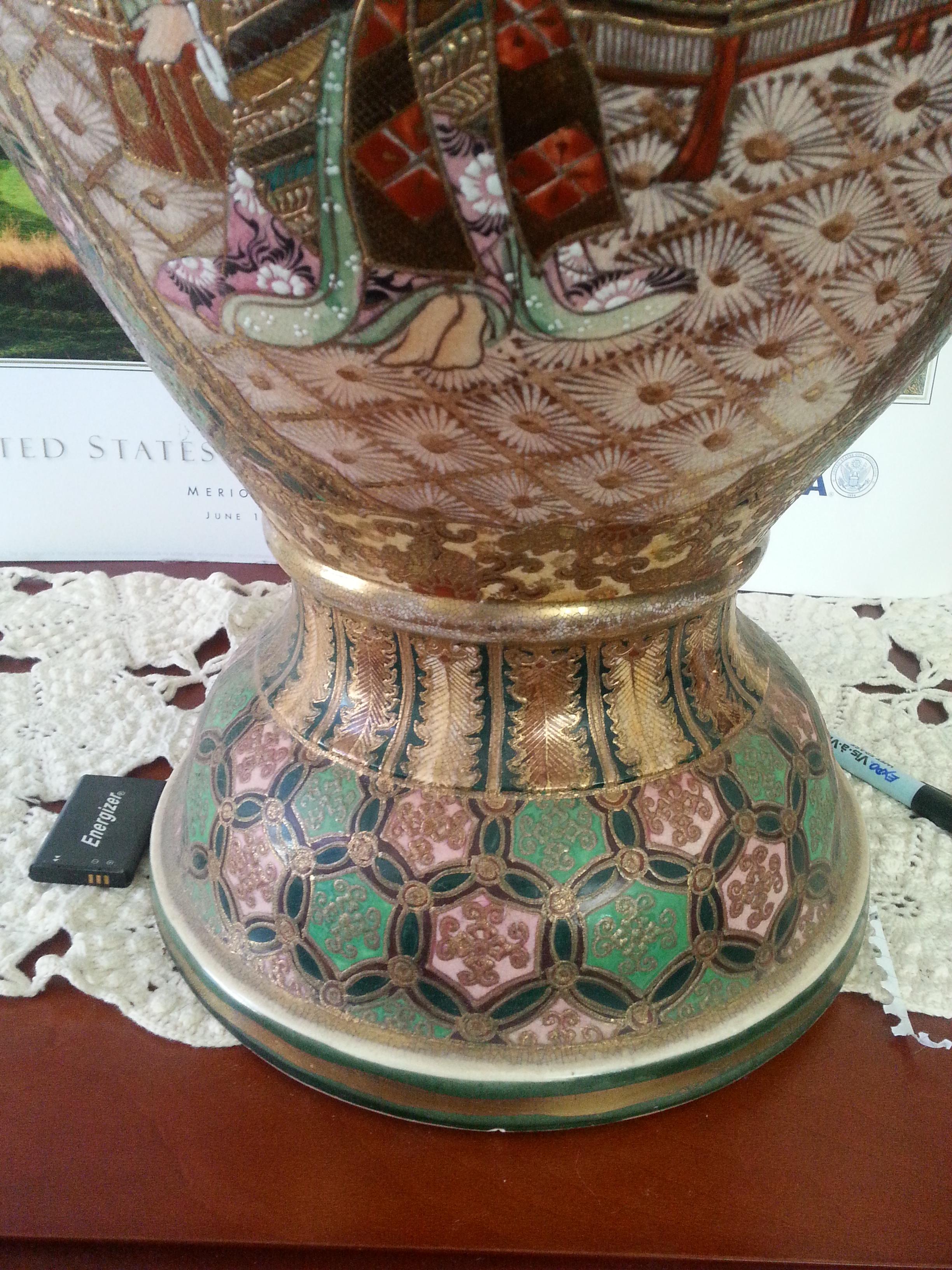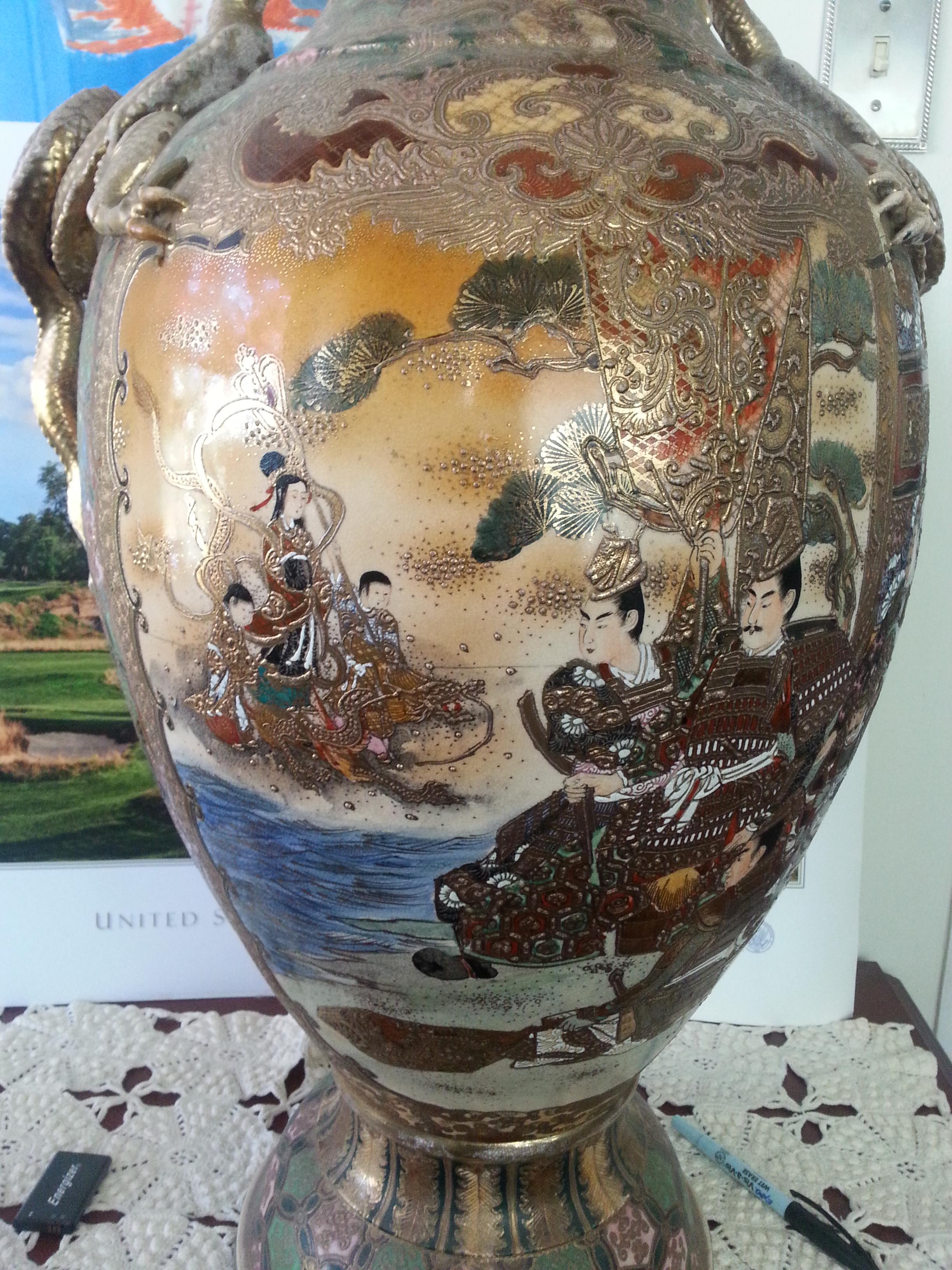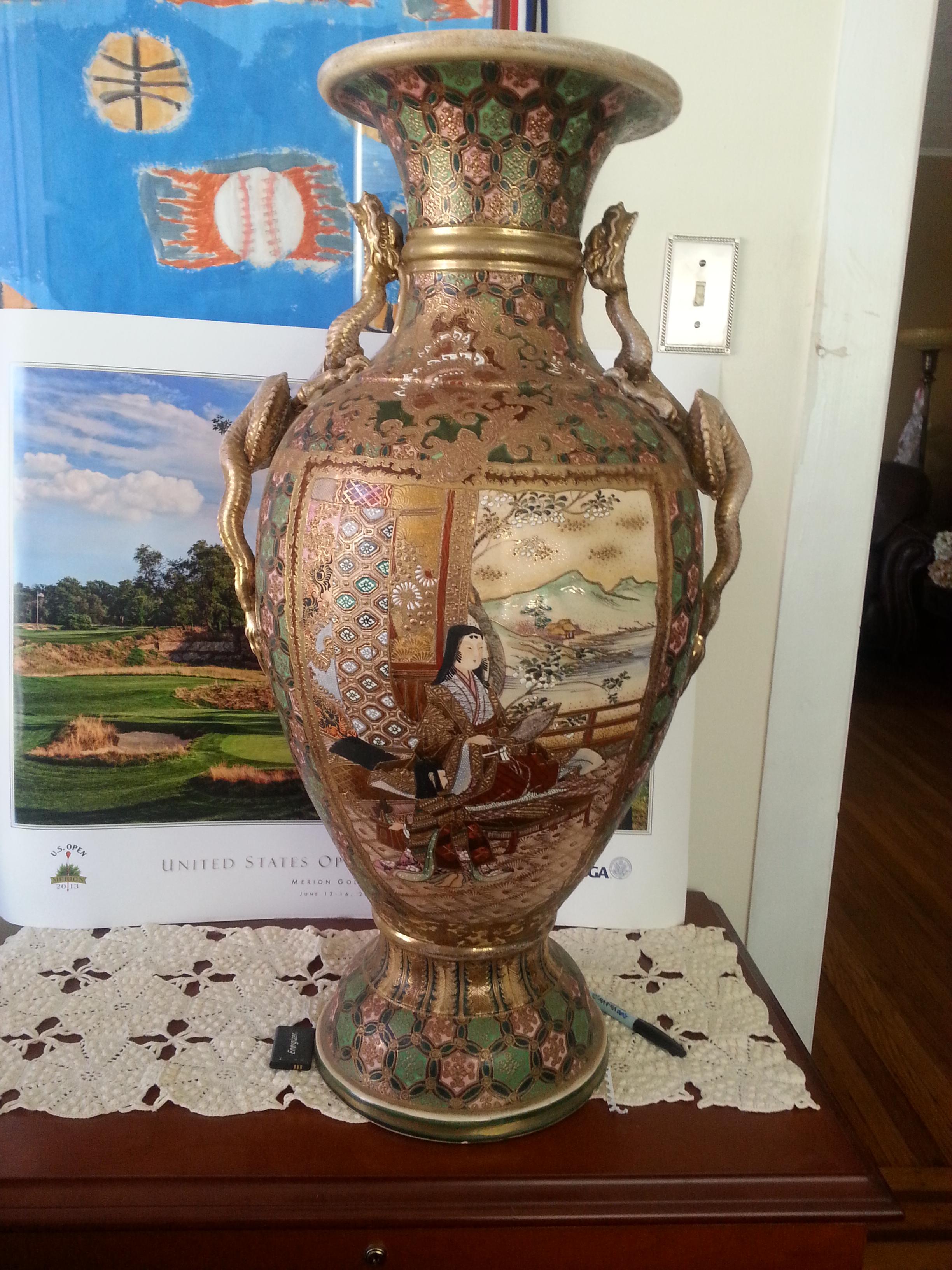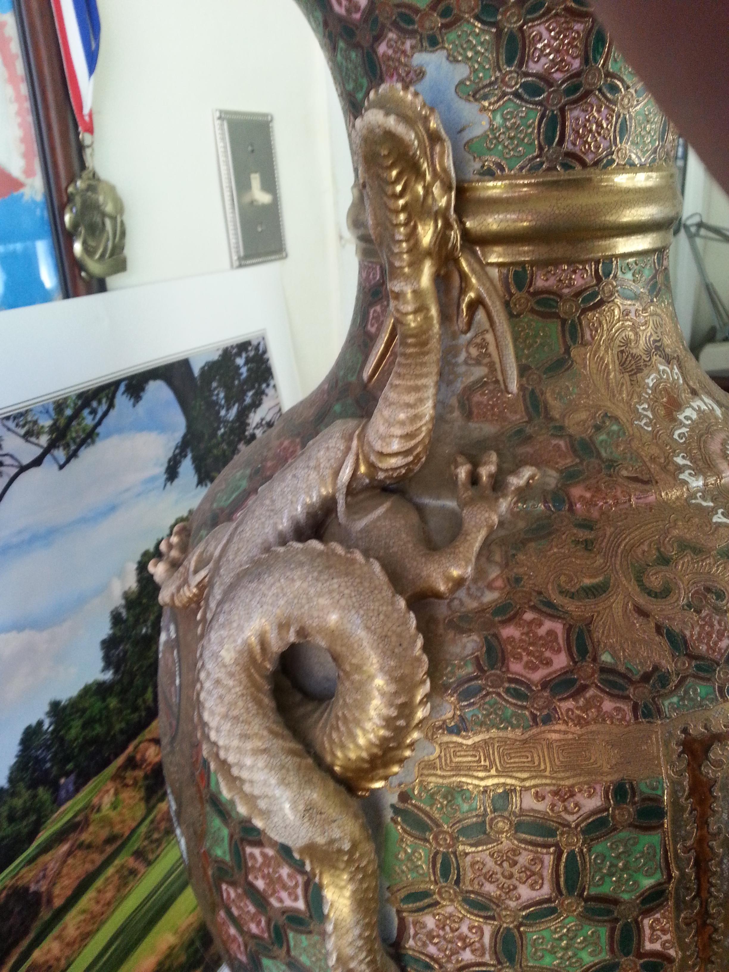 I've been told that this vase was a chamber pot for the Emperor's Roycl Court, but I have no proof of that.  It sits 30.5 inches high, and there is damage to one of the Dragon heads.  It's glued on.  Besides that it is in fantastic condition.  There is no visable markings