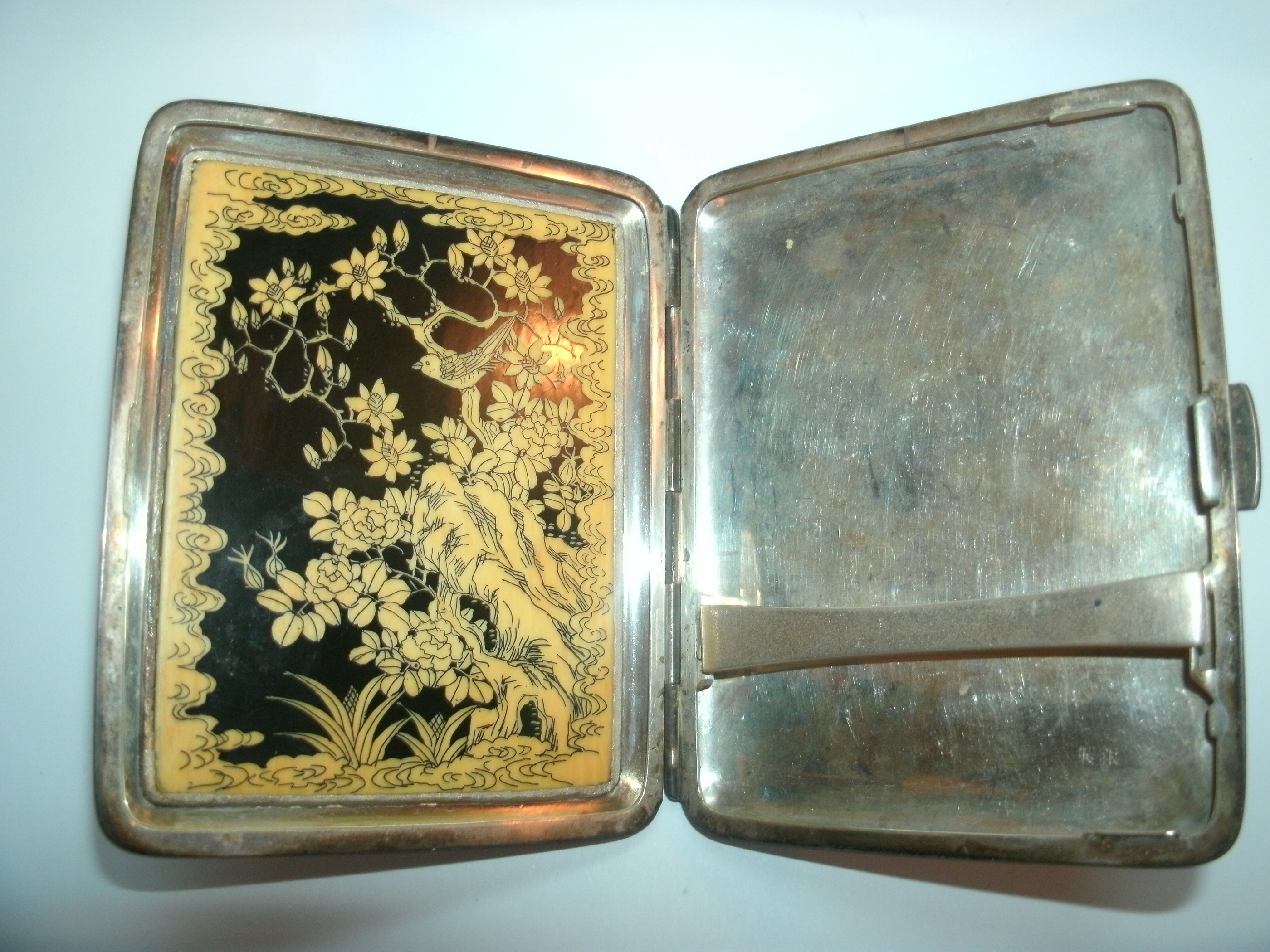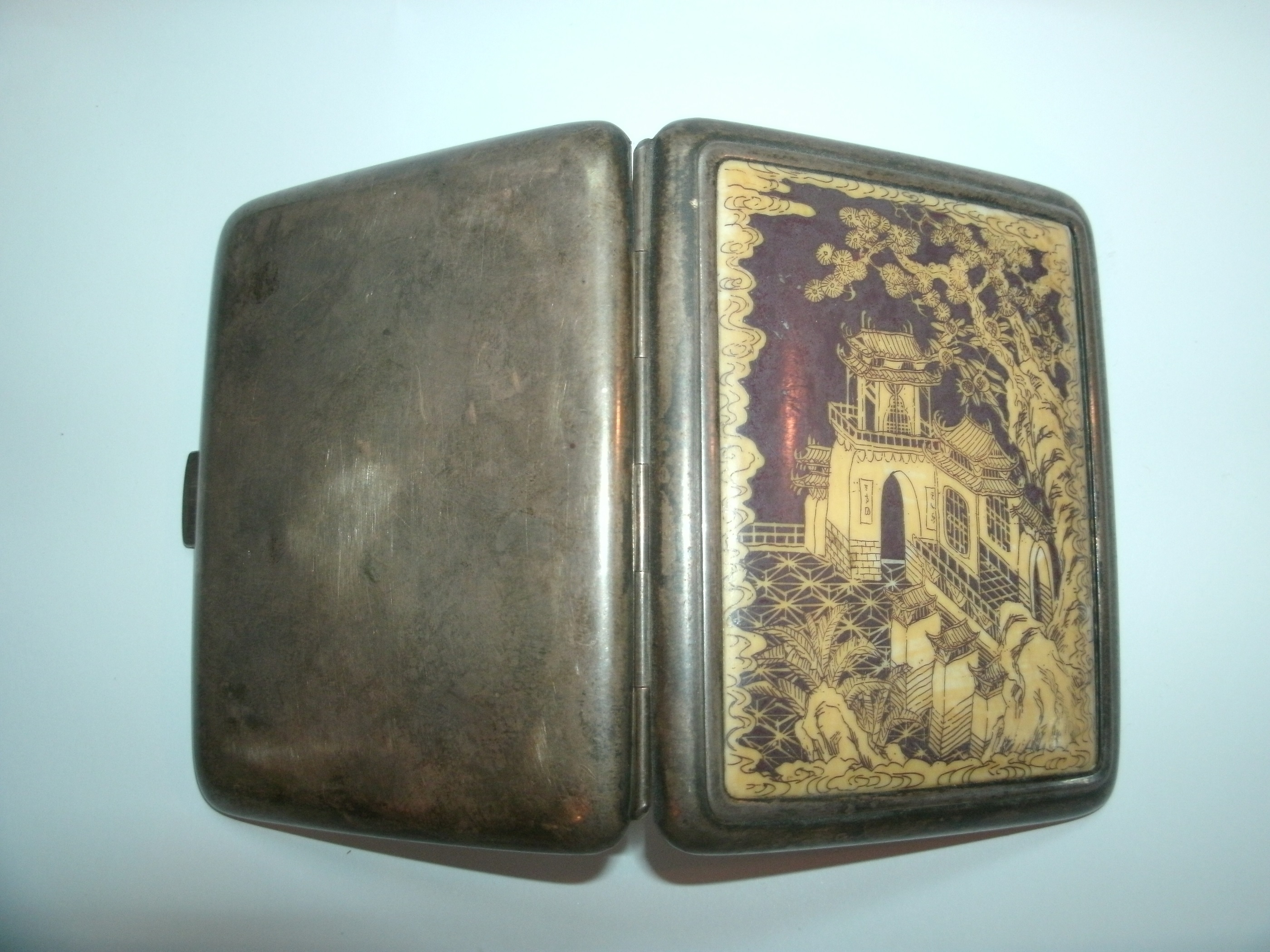 2) As far as the case, I believe there's a slim chance the inlay is ceramic, for silver cases and that period crafts people would have used an ivory, early plastic, or bone inlay. However, without feeling and looking closely at the item I could not authenticate which one. Here's what I do. If you have a UV light, turn off the lights in a room and hol dthe light to the inlay.The UV light will make natuarl (like Ivory and bone) a lighter color and then synthetic materials (plastics) darker. The simple (non-reccomended test) is to heat up the end of a needle and press it to the white material. If the material burns easily and gives off the smell of burnt plastic it may be a synthetic material. If it leaves a small black mark, and gives the smell of burning hair chances are it's ivory or bone. Ivory is a banned material so any Ivory obtained before the ban in the 1980s is fair game, and it limited in supply so Ivory materials make things more valuable.
