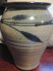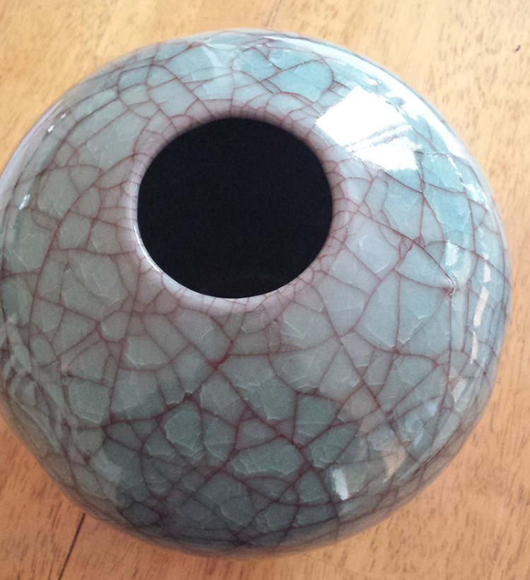 The vase is a blue green color. About 8 inches tall with 7 inch diameter.
