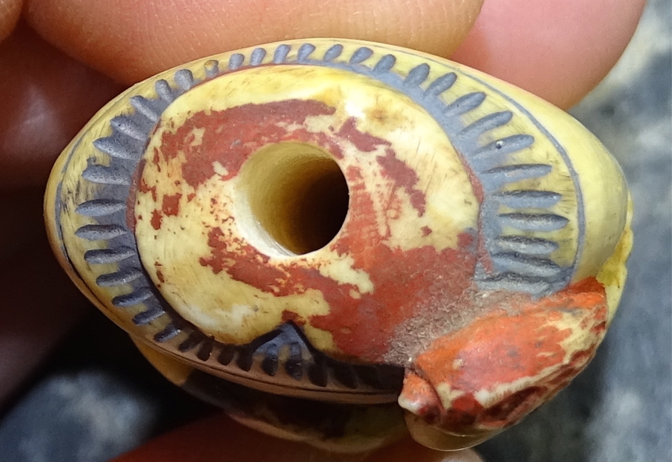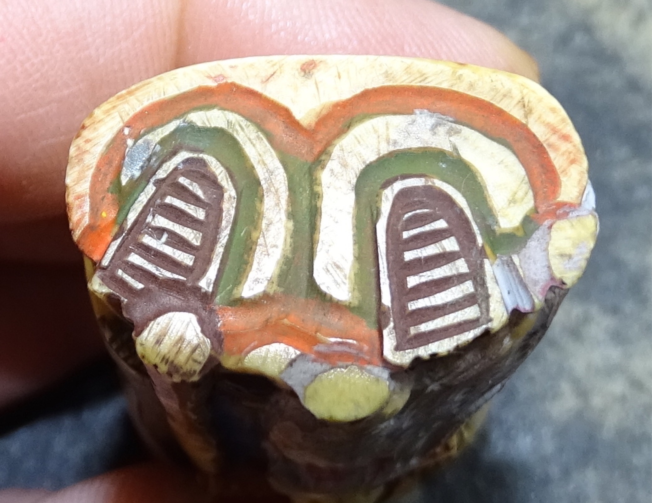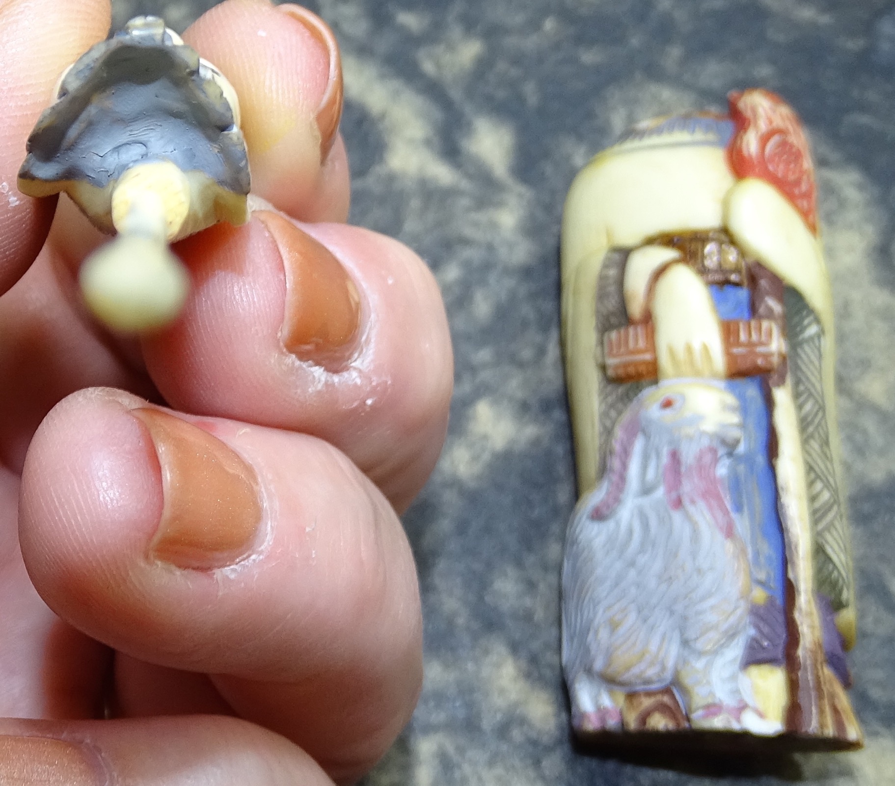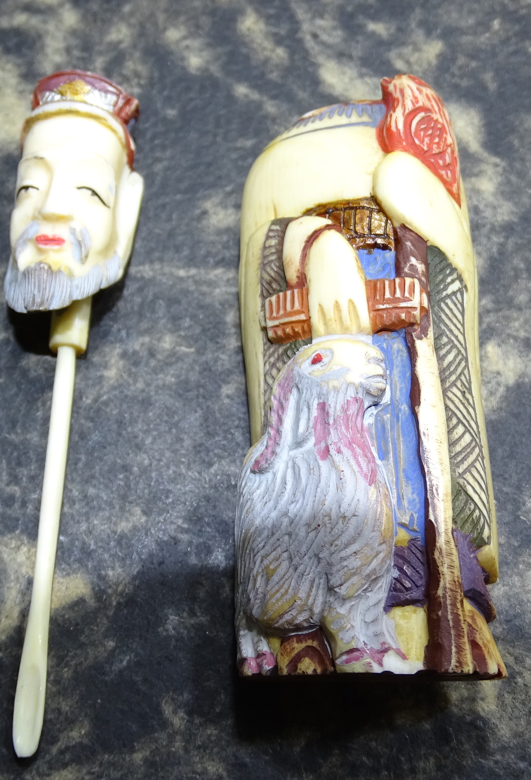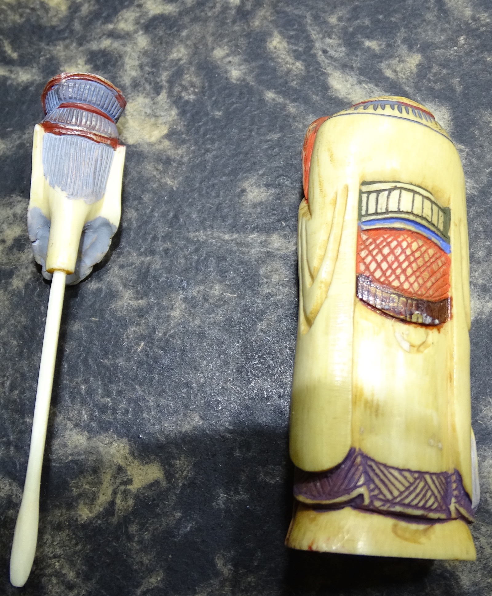 Ivory ( Schreger lines with loop) carved figure of I believe an emperor. A little over 4 inches tall and 1 3/4 " wide. The figure's head is easily removed and attahed to the head is what looks like a small spoon also made of ivory. The figure appears to be hand painted but paint appears old.