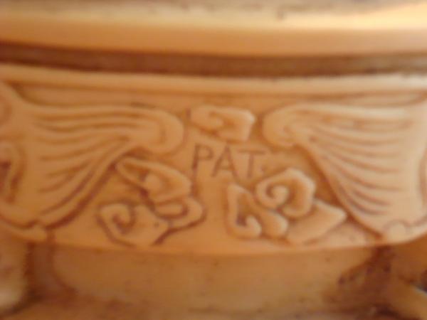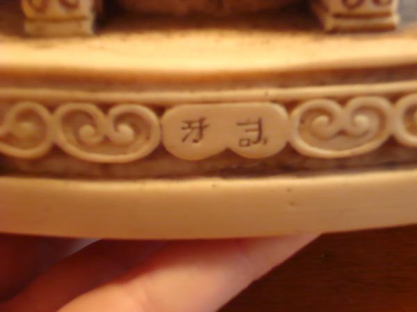 Two statues (doubtful to be bookends) appear to be hand carved. There are two asisan characters below their feet on the front (unsure what the characters mean) that are the same, so I doubt it says "king and queen" or anything of that nature. Both words appear to be handwritten because there are apparent differences. The "Emperor" is wearing a hat with a ball on top, sporting a traditional goatee - sitting on a throne covered with dragons and flowers. He's holding a long set of beads in his left hand. His garments are covered in dragons. It also appears he's wearing some type of cape. The "Empress" wears the same style hat with the ball on top and a long set of beads. Instead of dragons, her throne is covered with Eagles and flowers and her dress is covered in flowers. She holds a feather in her right hand. Both statues have the same carving on the back "PAT."