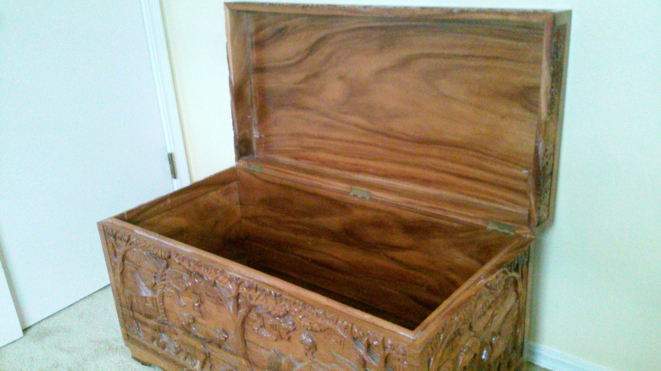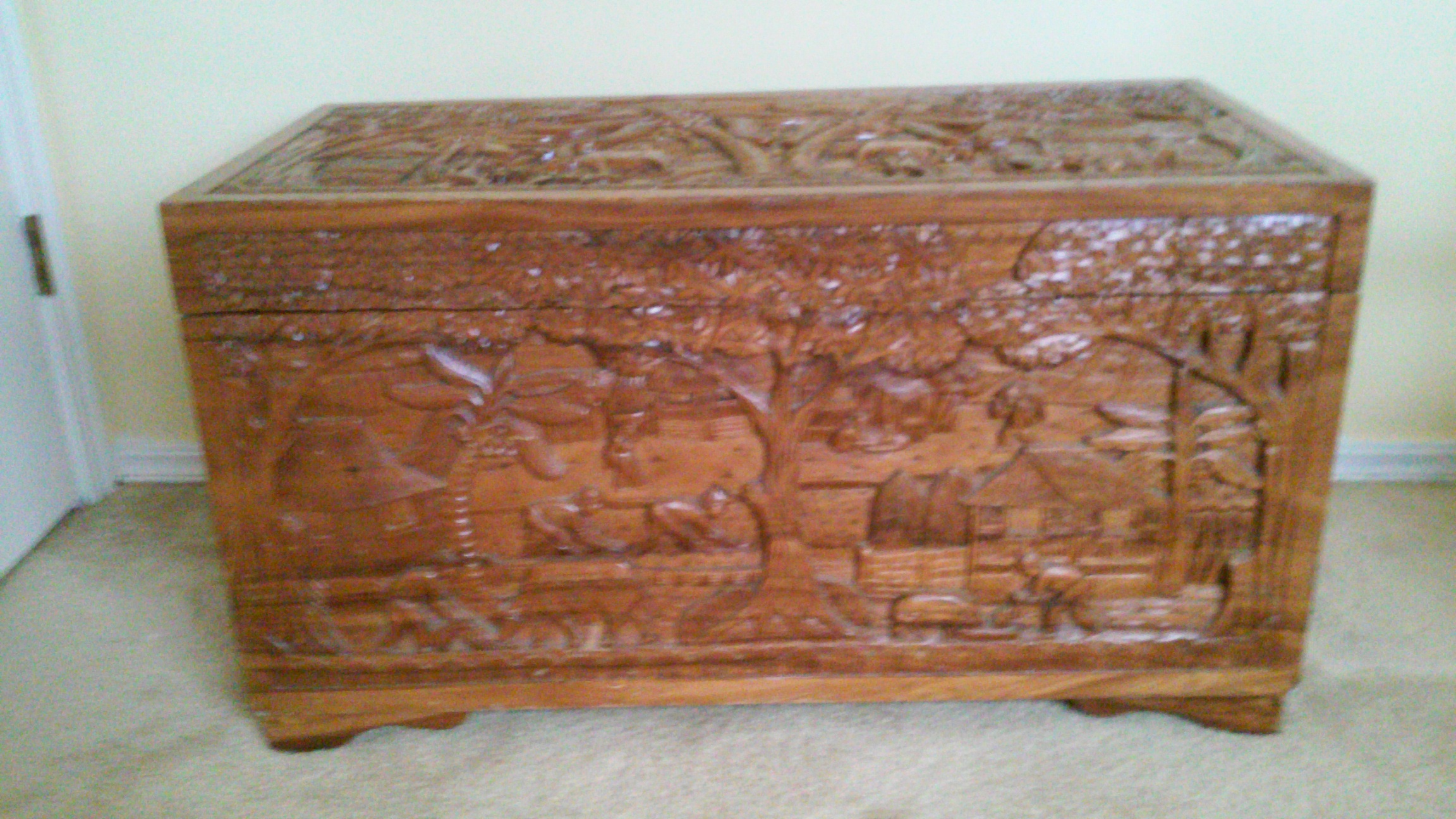 I purchased this hand carved trunk in the Philippines over 30 years ago. Was told it was made of Philippine mahogany. It measures 36wide20high18deep. Its in relatively good shape for having traveled around the world.
