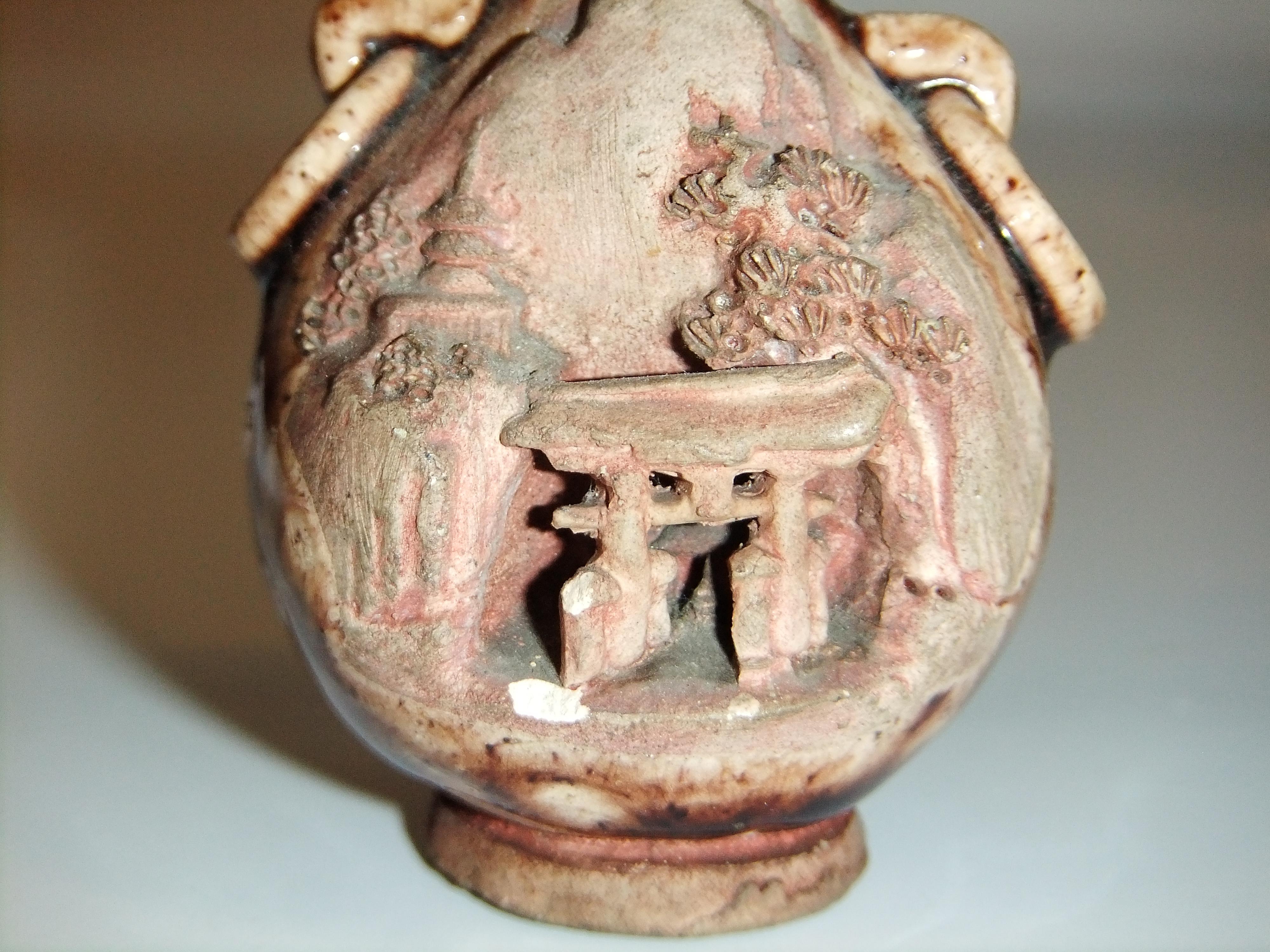 Medium some kind of clay with a glaze on both sides and back. The front is carved of either temple doors with something like a spiral inside. Off to the upper left side of carving is another temple.
