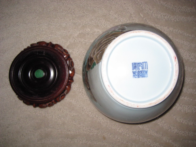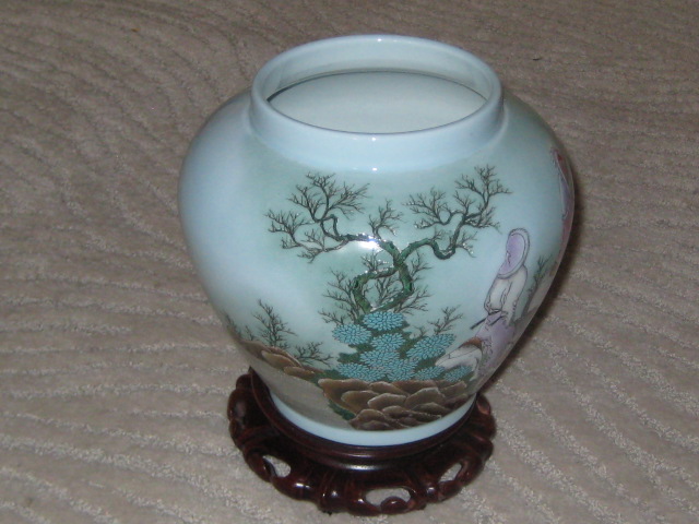 Re: ASIAN VASE - ANTIQUE PORCELAIN OR CERAMIC & CARVED WOOD