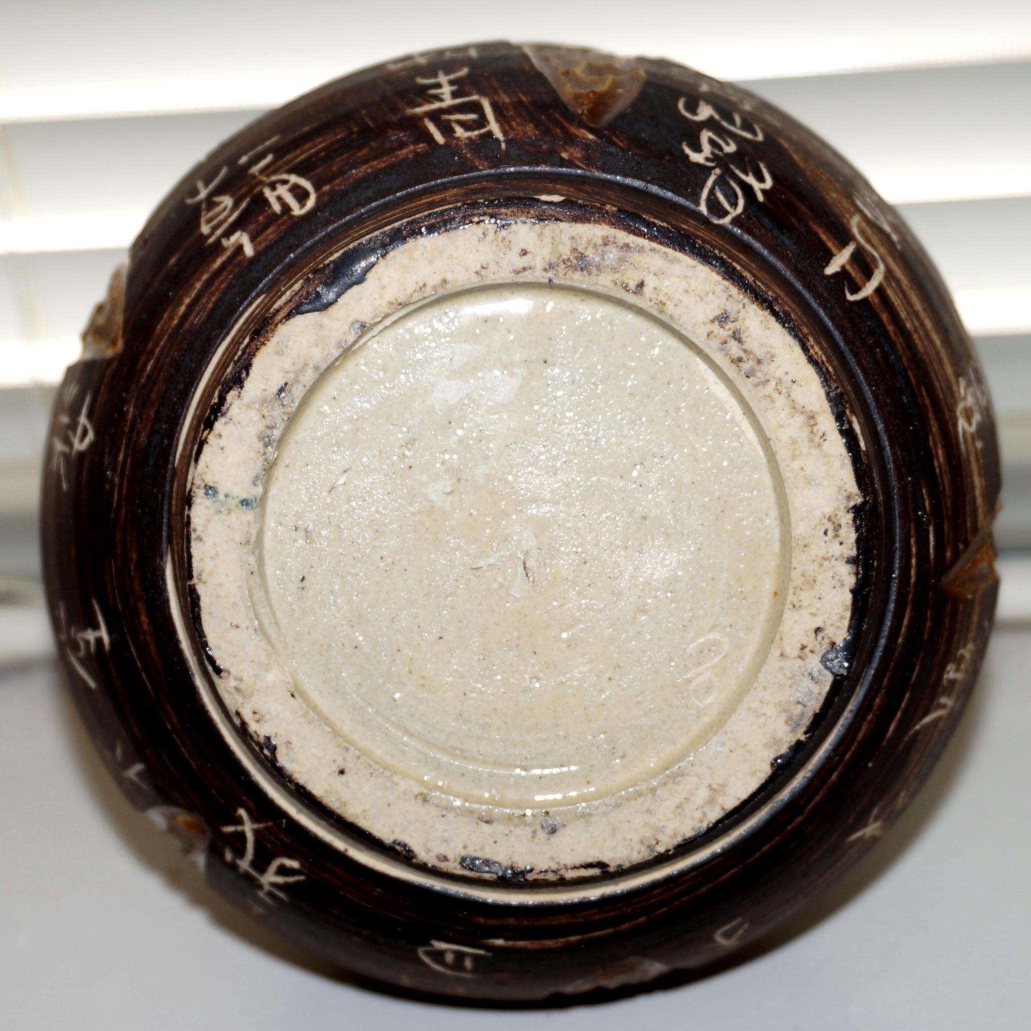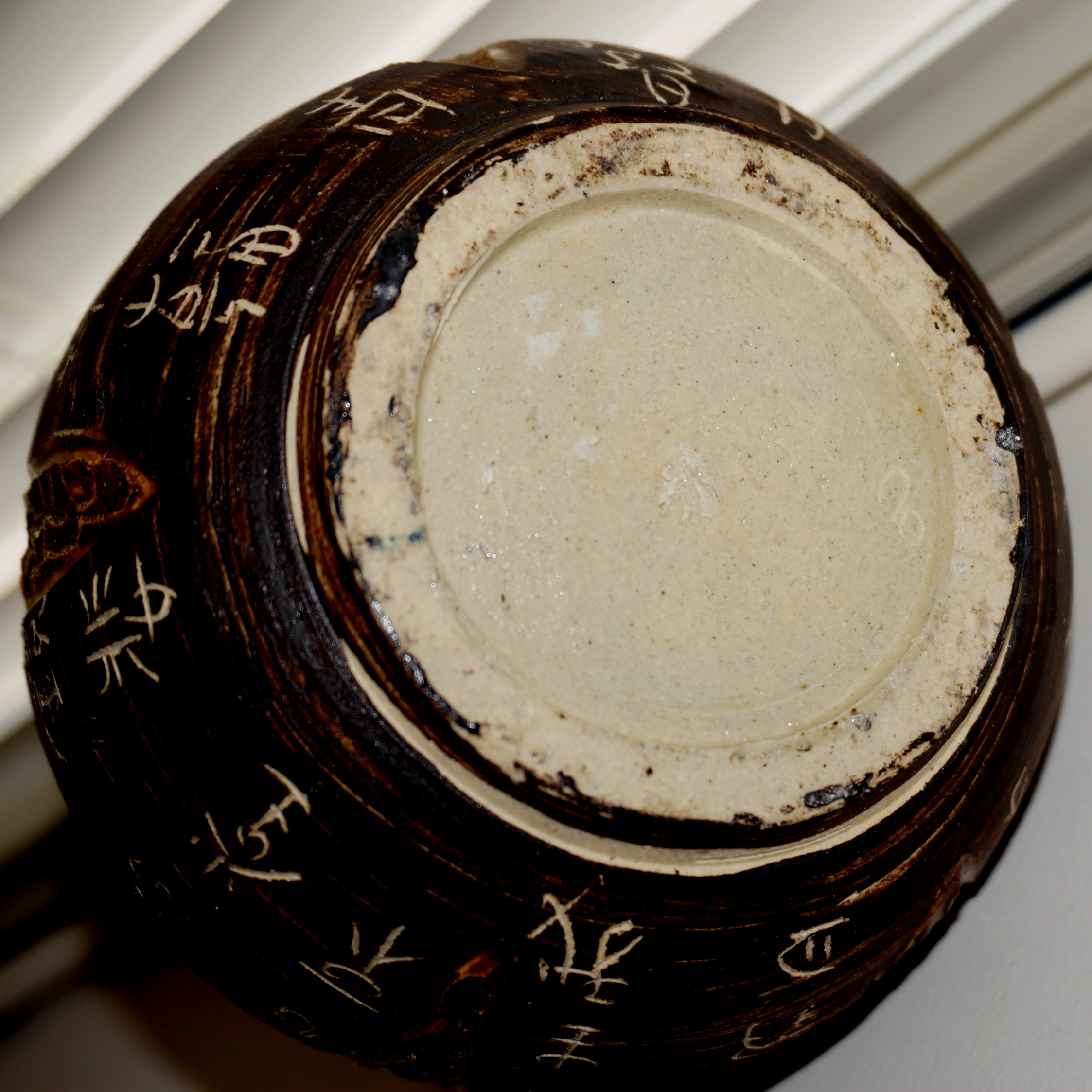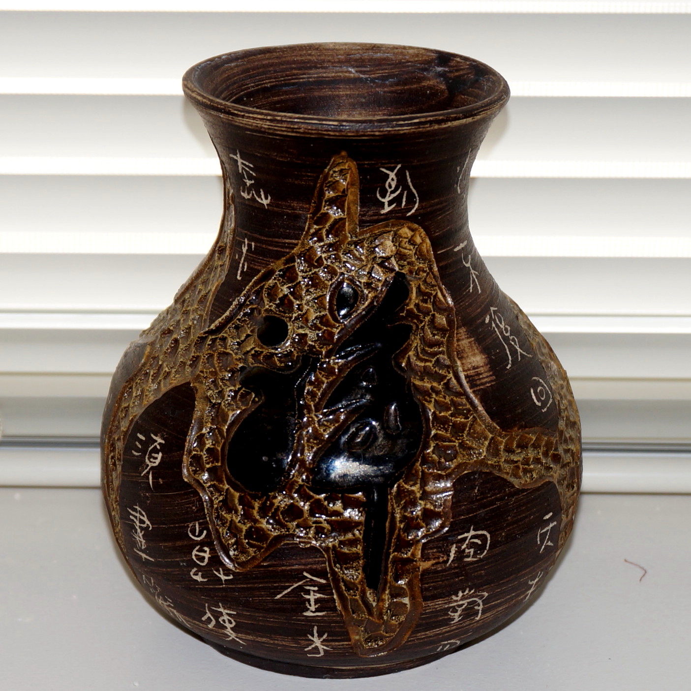 I have a really unique Asian vase that I have no clue to whether it is Chinese, Japanese or what type of decoration it has. It is quite lovely with incised or carved design some which is glazed and some which is not. There appears to be a signature on the bottom or at least some symbol that looks kind of like an 8. The vase stands around 5 5/8" tall.