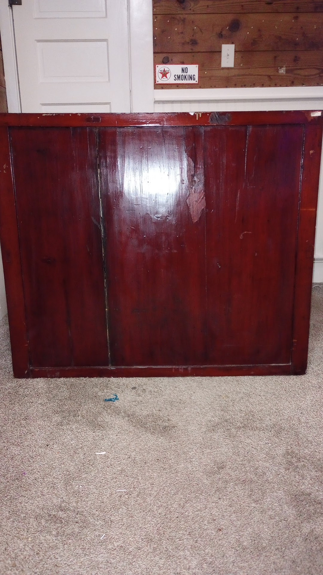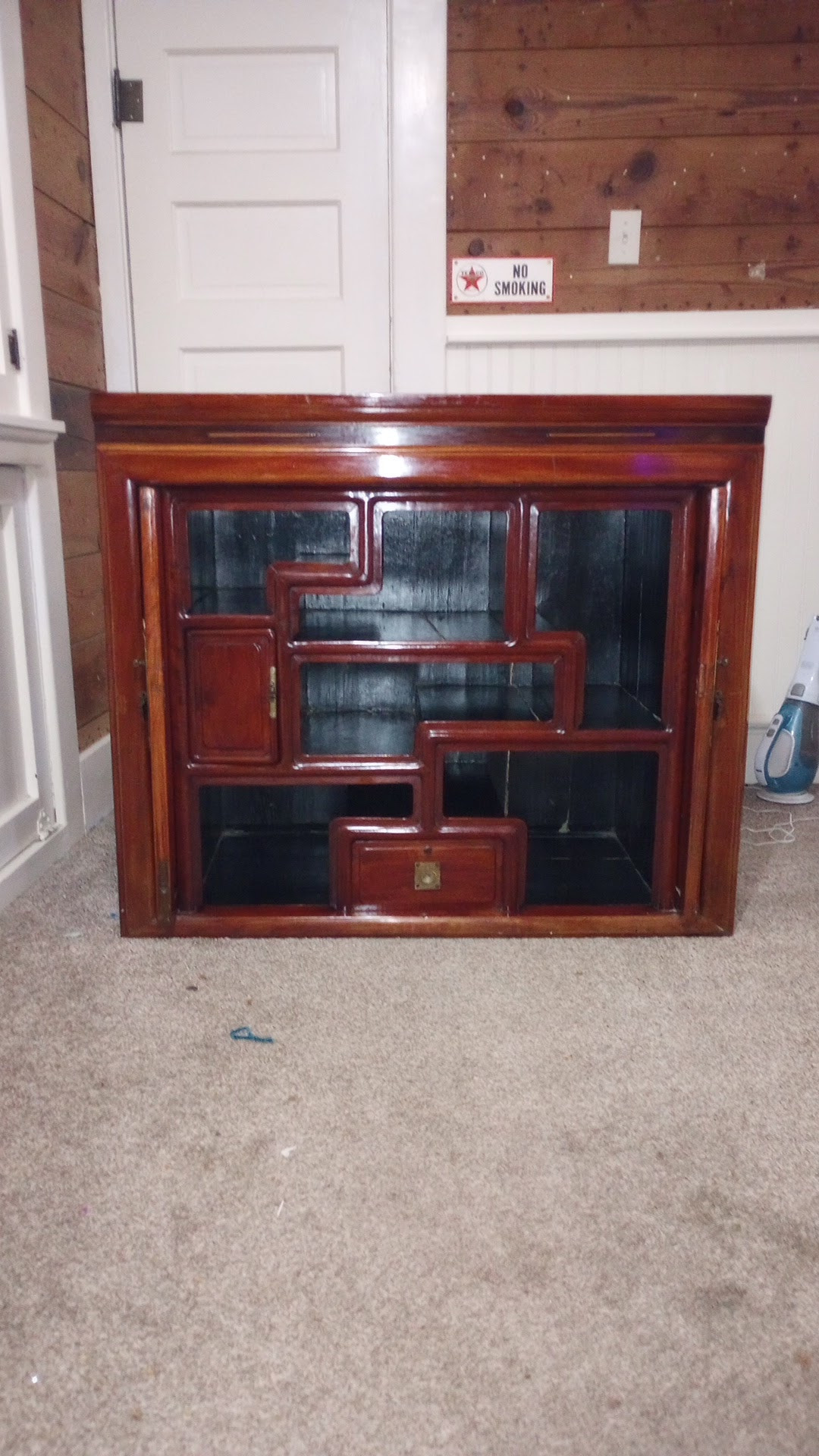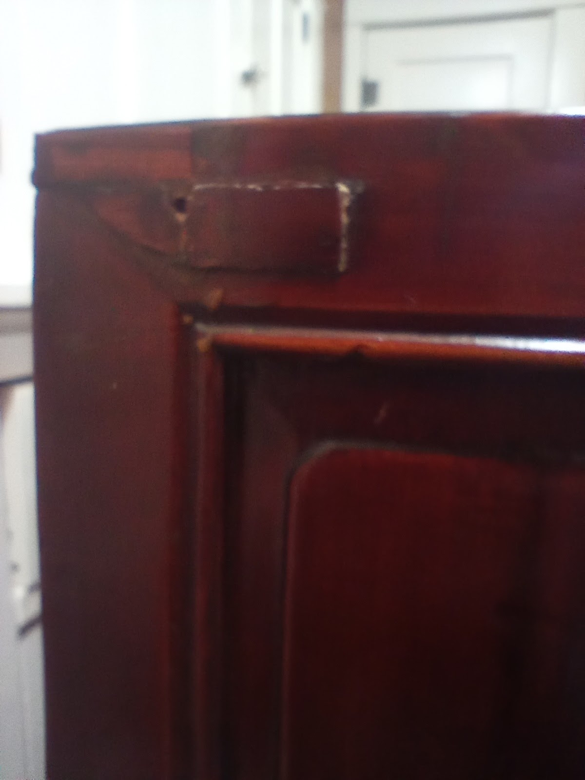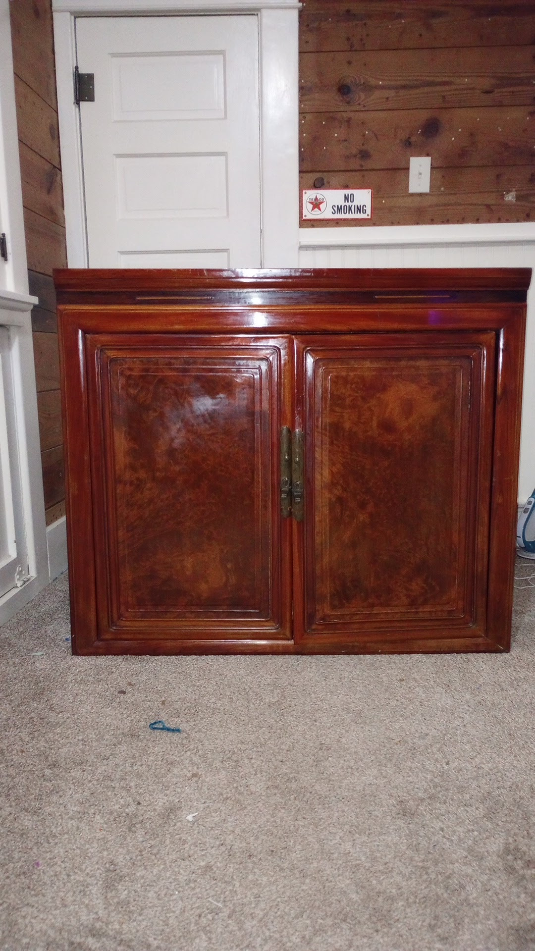 I call it a cabinet, but I'm not sure about that. It has the pocket doors, it's all wood, and there is not one screw or nail in the whole thing! I think it is not varnished because I tried to wipe with water and red came off. So I used feed n wax. It's about as tall as a dining table.