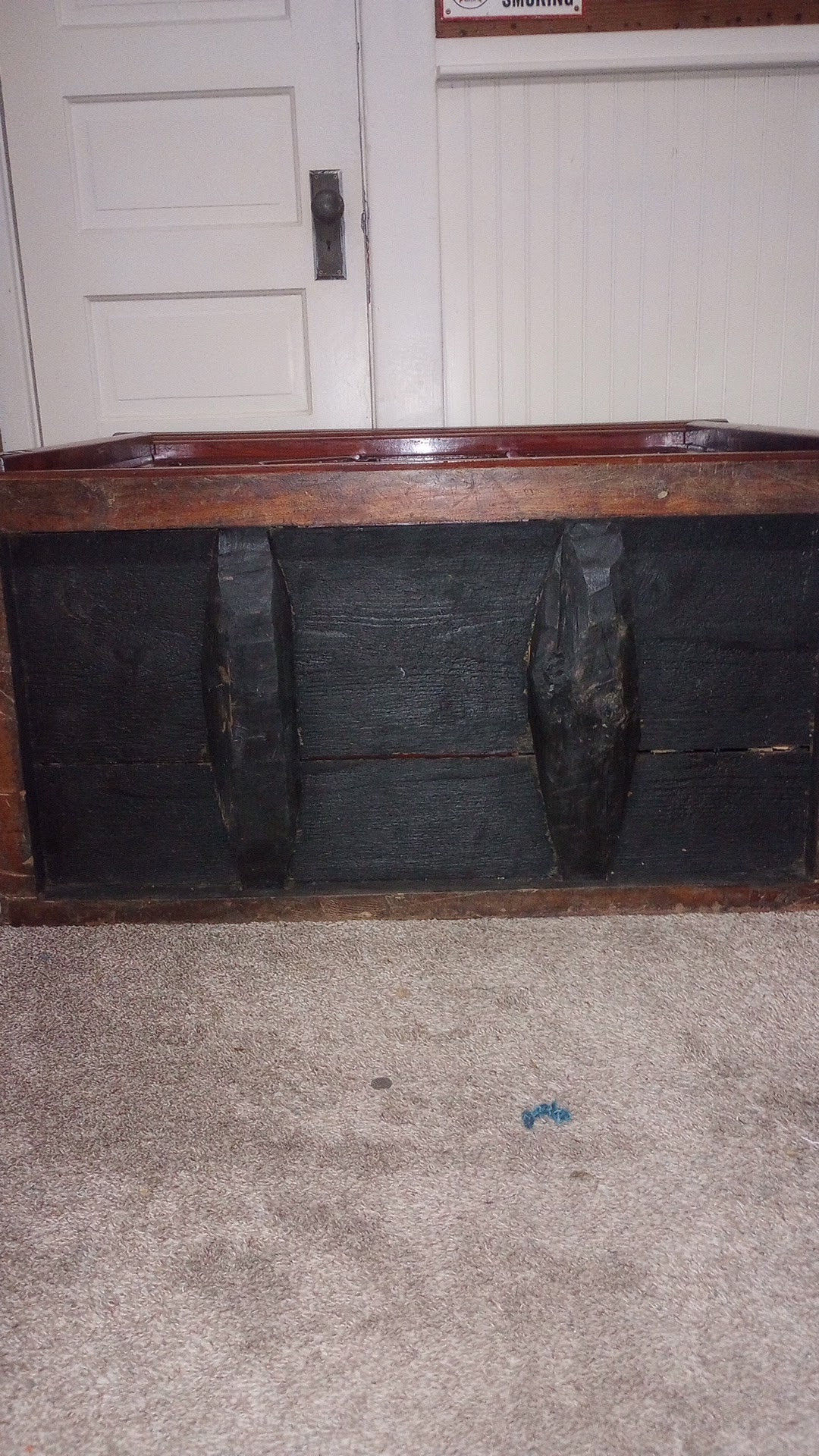 The lack of metal fasteners and use of mortise and tenon joinery (visible on the side details) strongly indicate traditional handcraftsmanship, albeit likely from the 20th century given the hardware and overall construction.