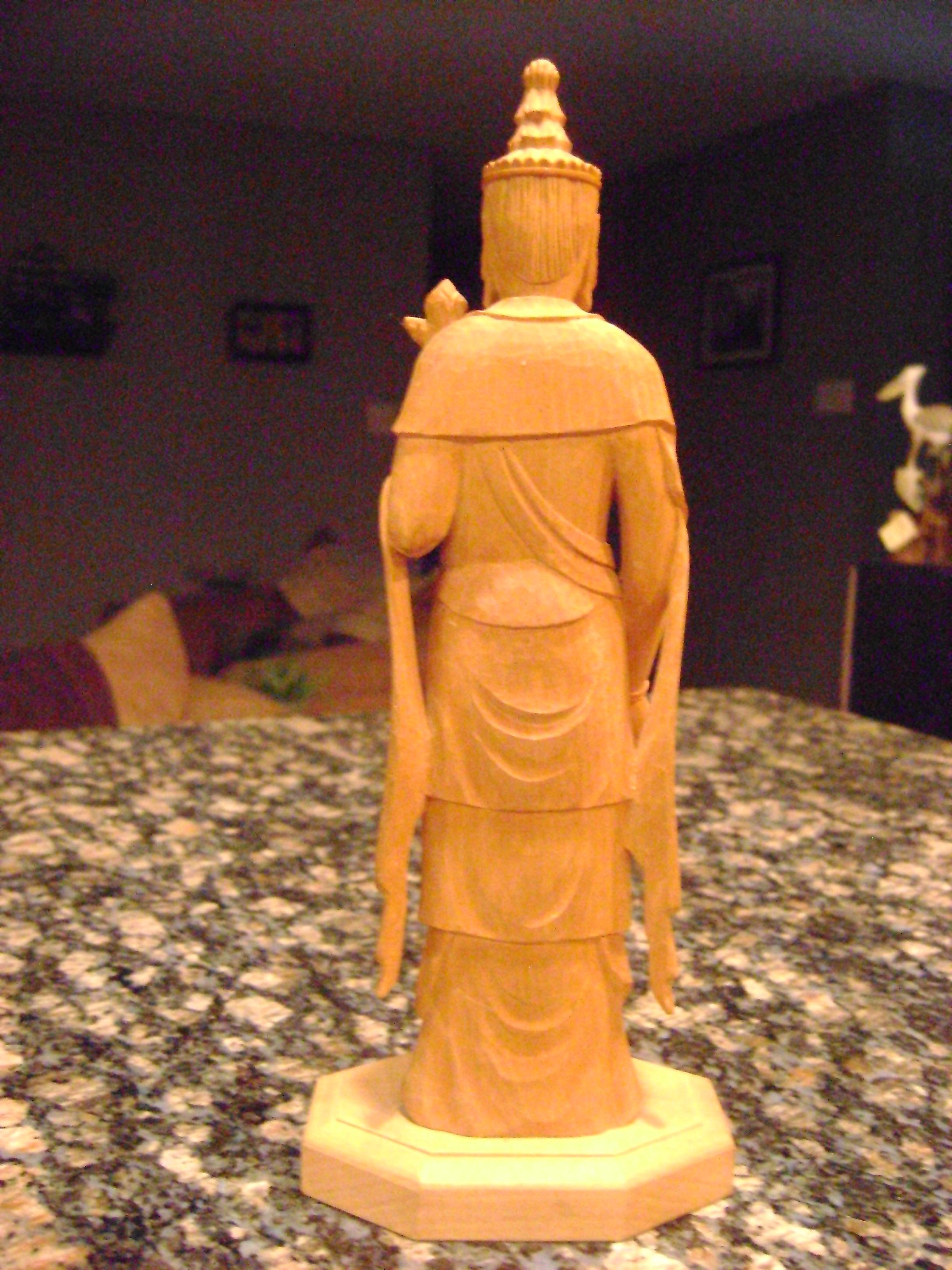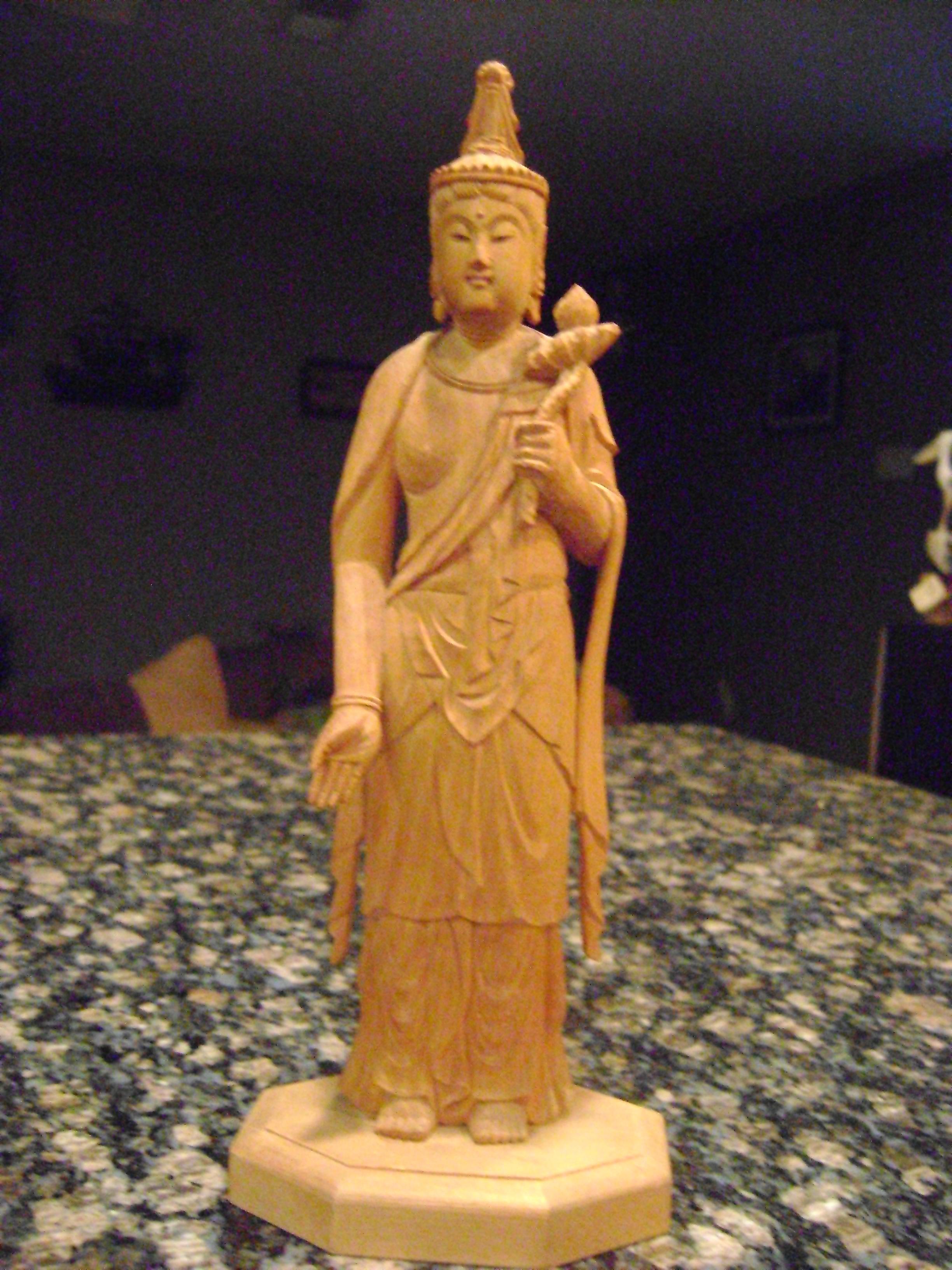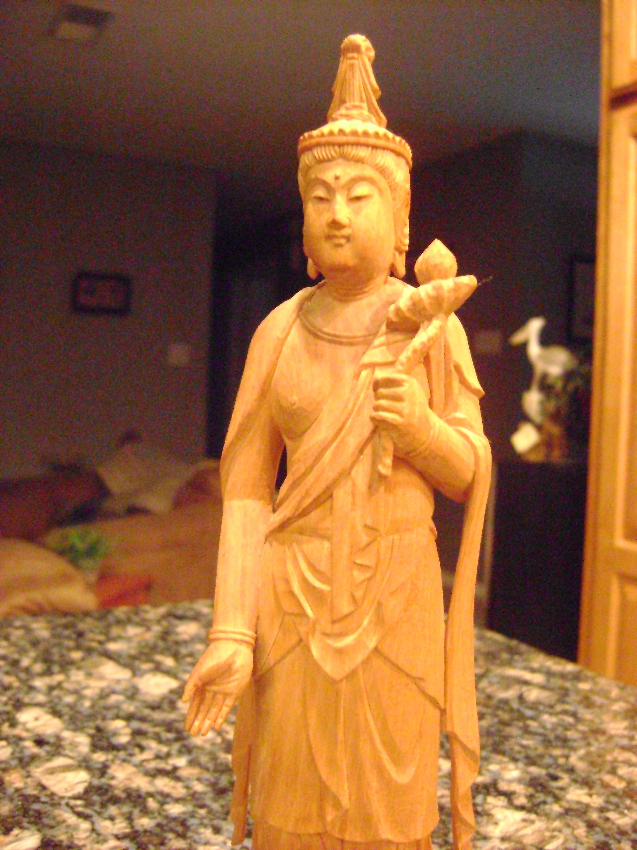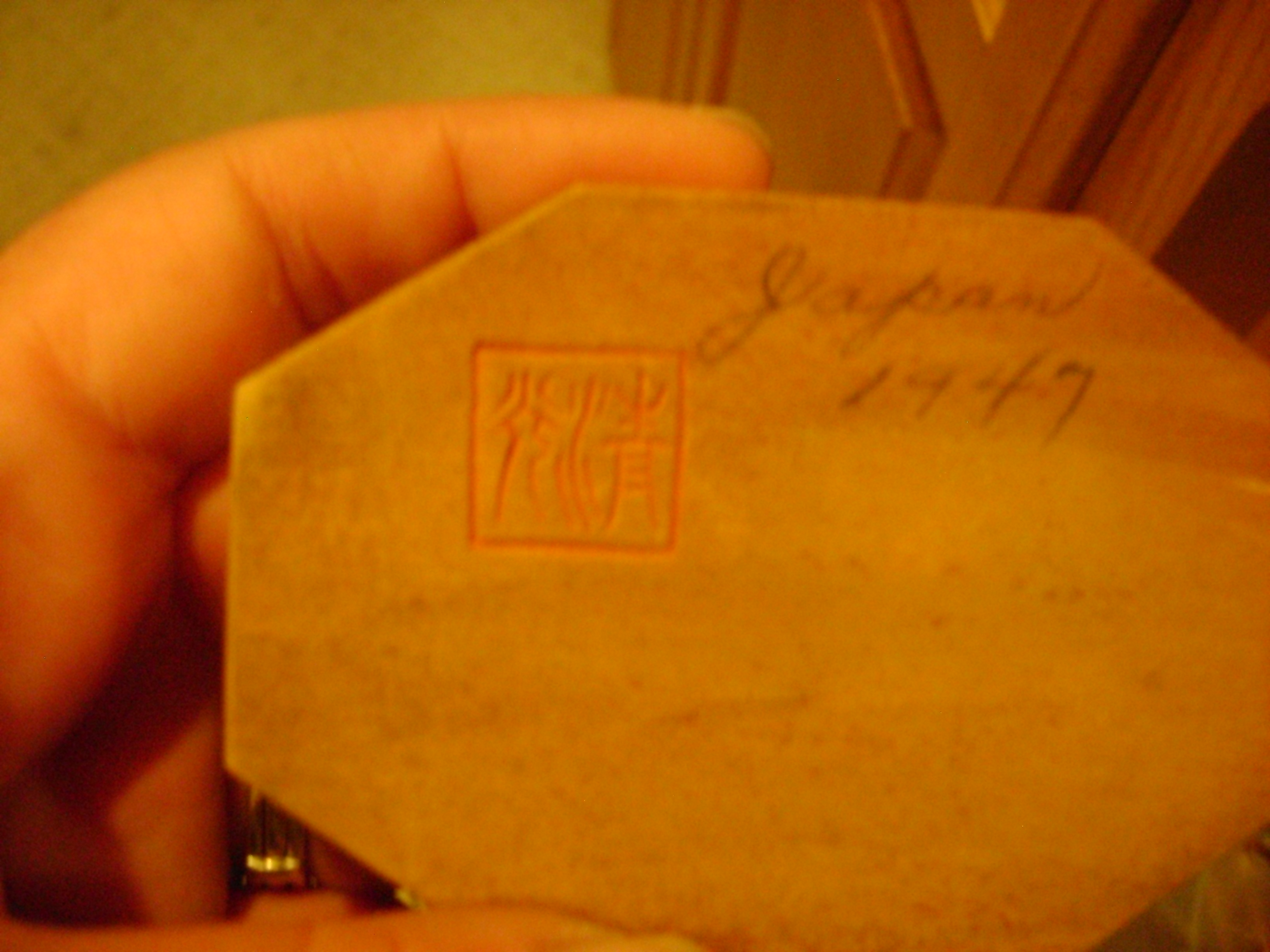 This wood carving is 8 3/4 inches tall and very lightweight. I bought this at a garage sale. The son of the man who owned it told me his dad bought it in Japan during the occupation. Japan and 1947 are writen in pencil next to the mark. The carving and carved mark on the bottom do not strike me as Japanese, possibly Thai or Indian.