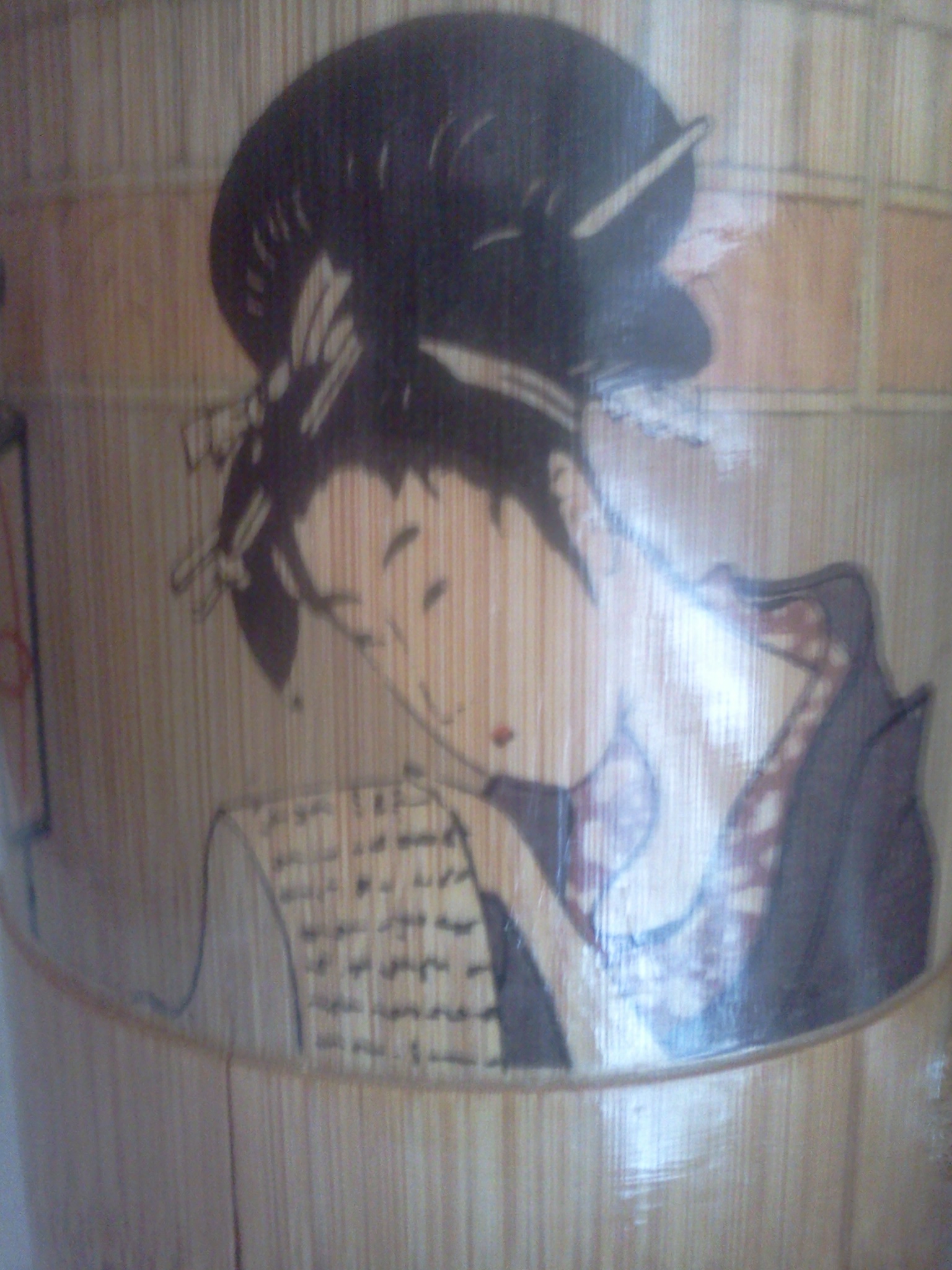 > wood with a single handle about .5 inches thick. The cup has a geisha