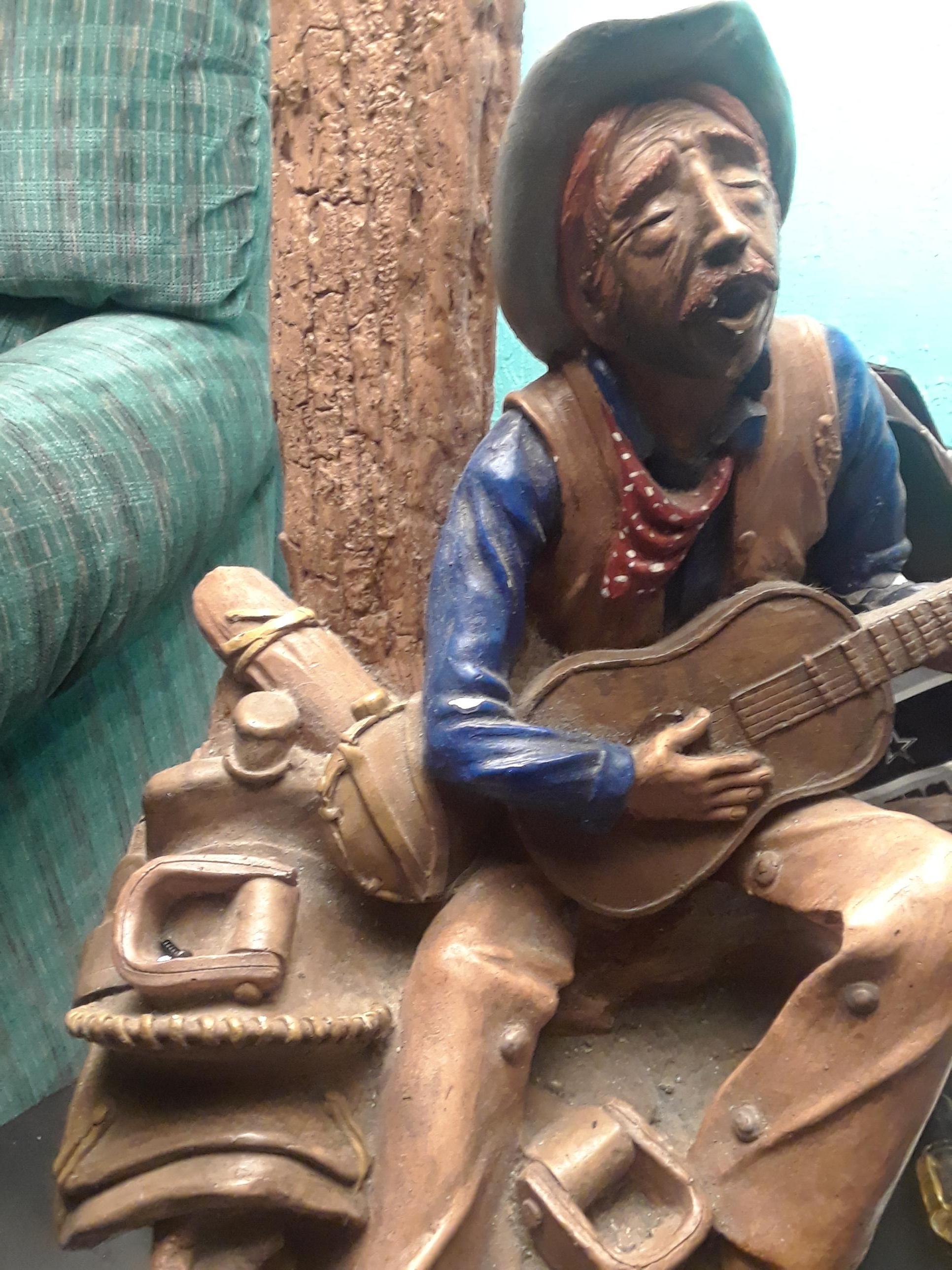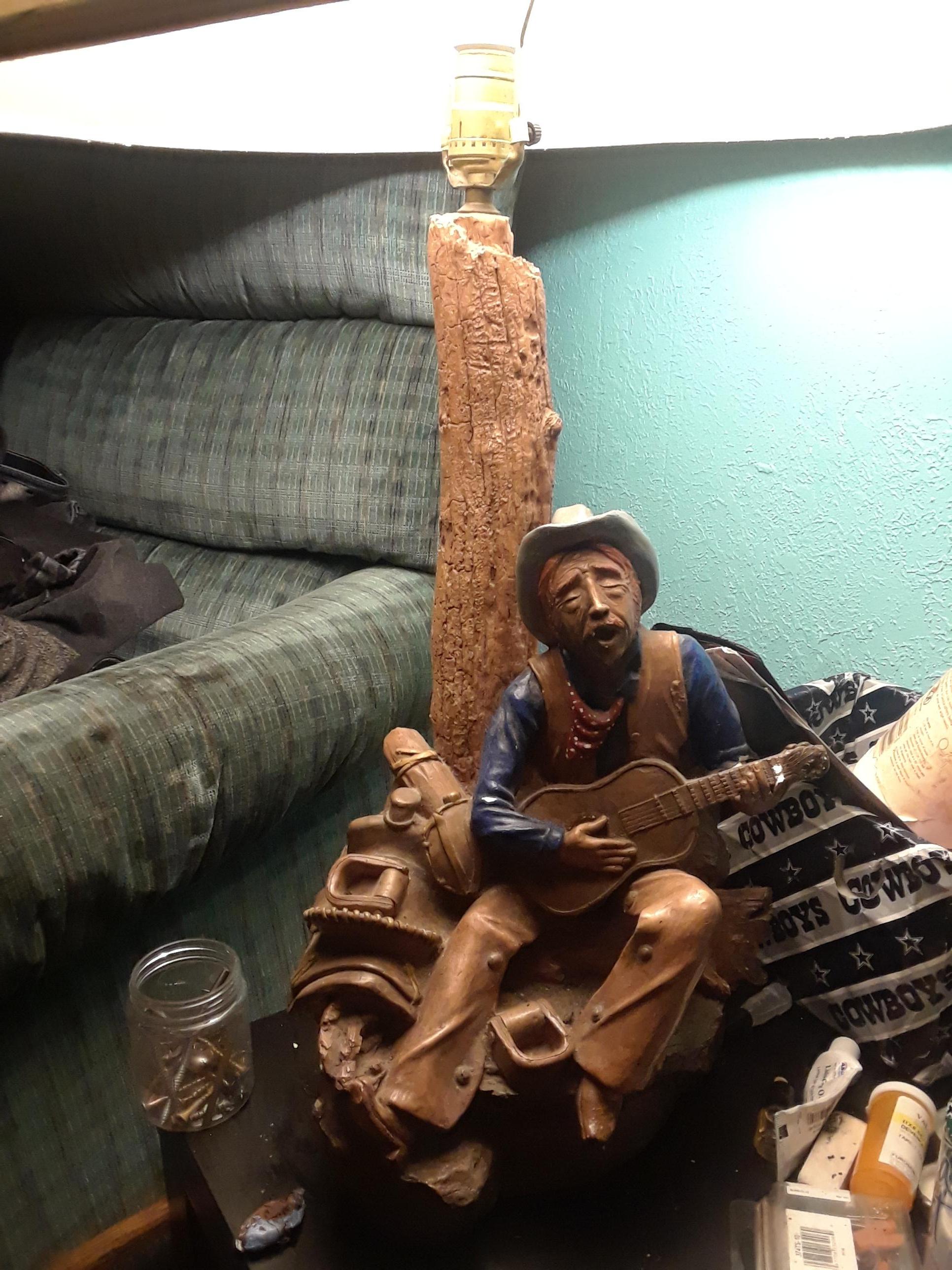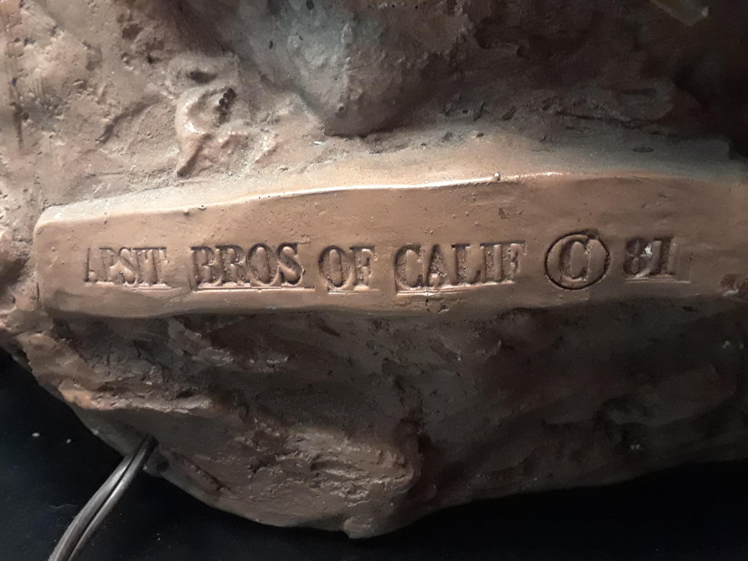 This is a lamp I have. He is about 2-2 1/2 ft tall and 1 ft wide (approximately) and heavy. He is sitting on a log next to a horse saddle and a fish net (or banjo) hosding a guitar. On the side is carved "Aspit Bros of Calif c 81" but i cant find this lamp anywhere. Please help me.