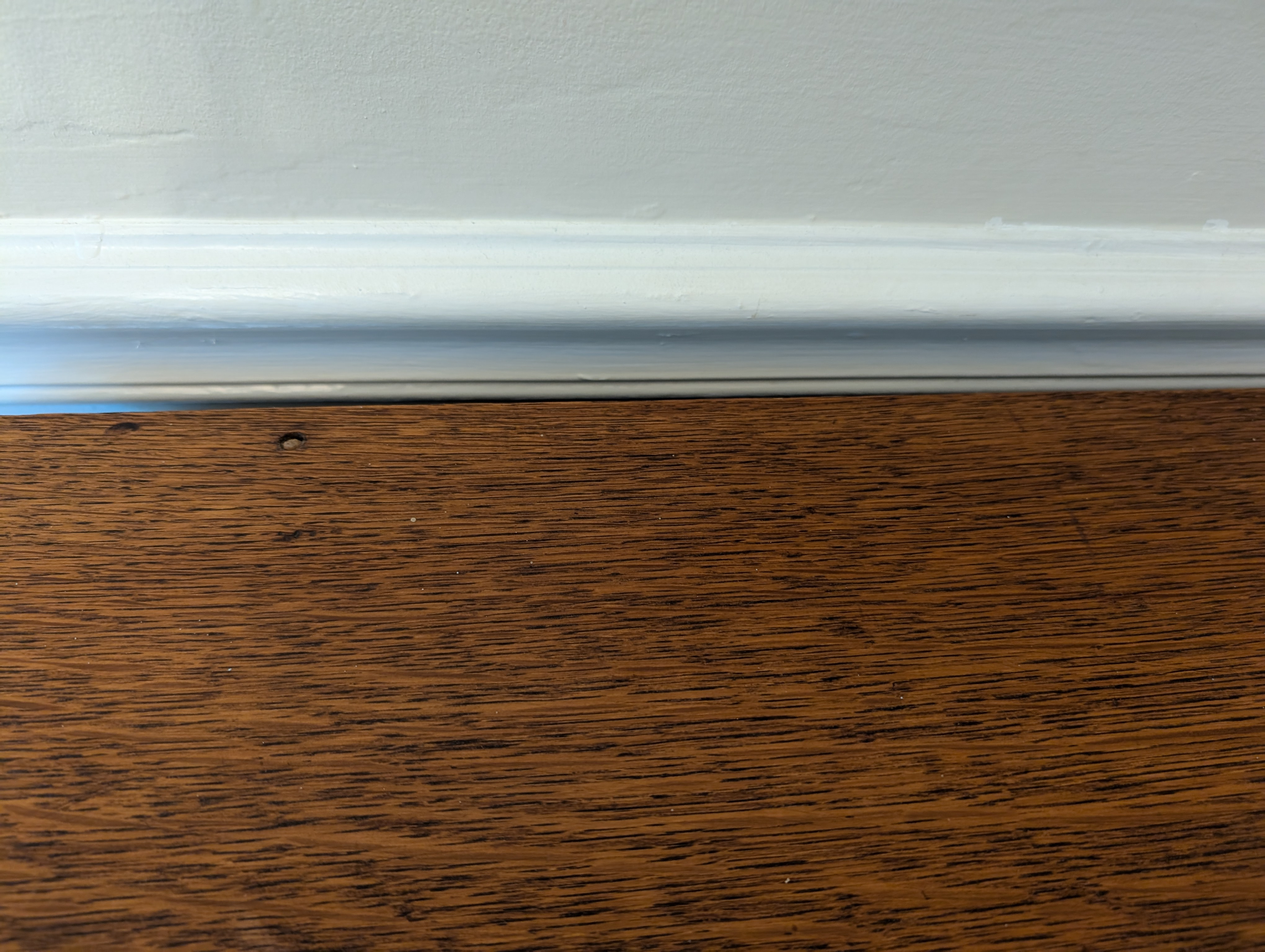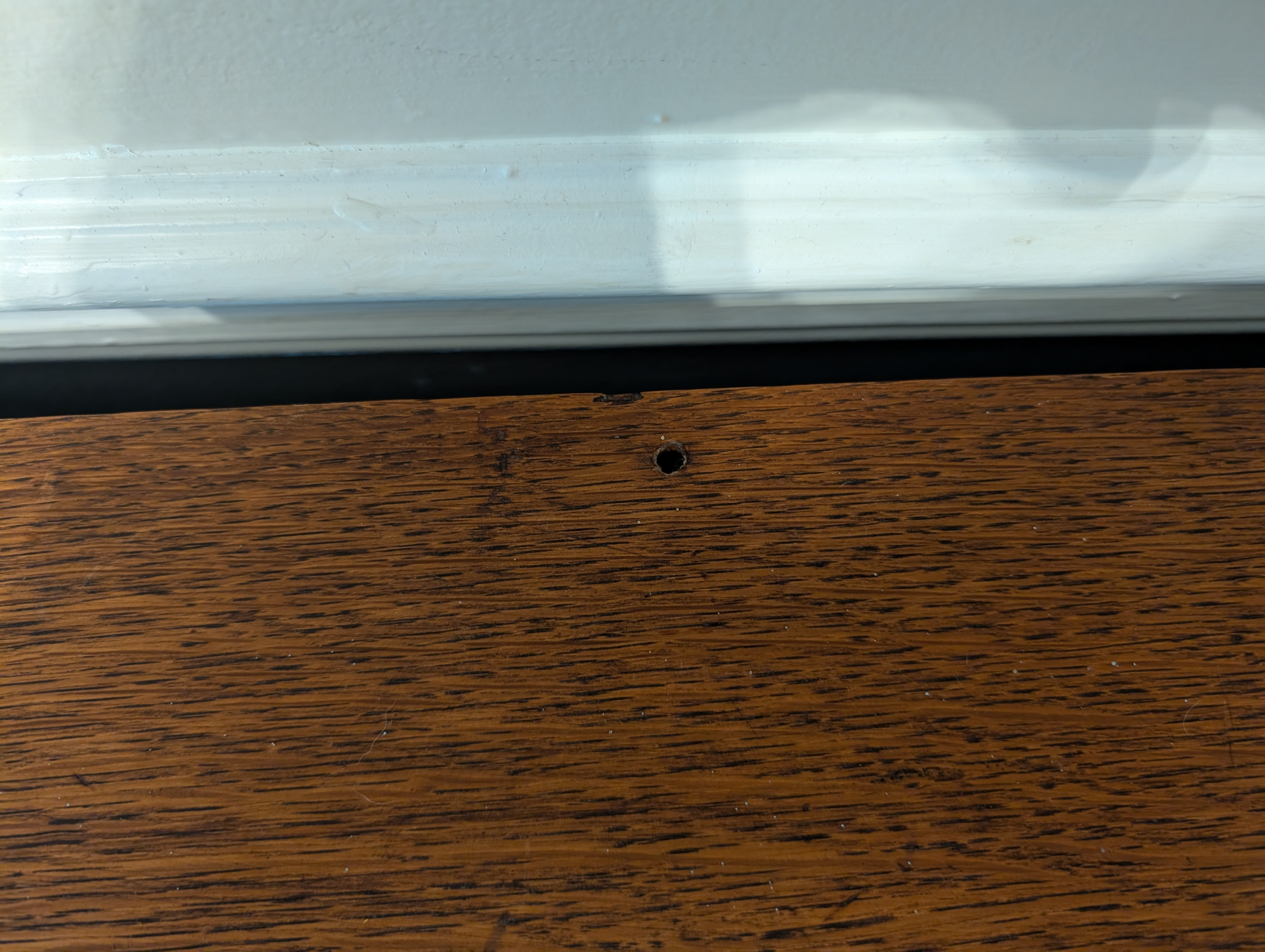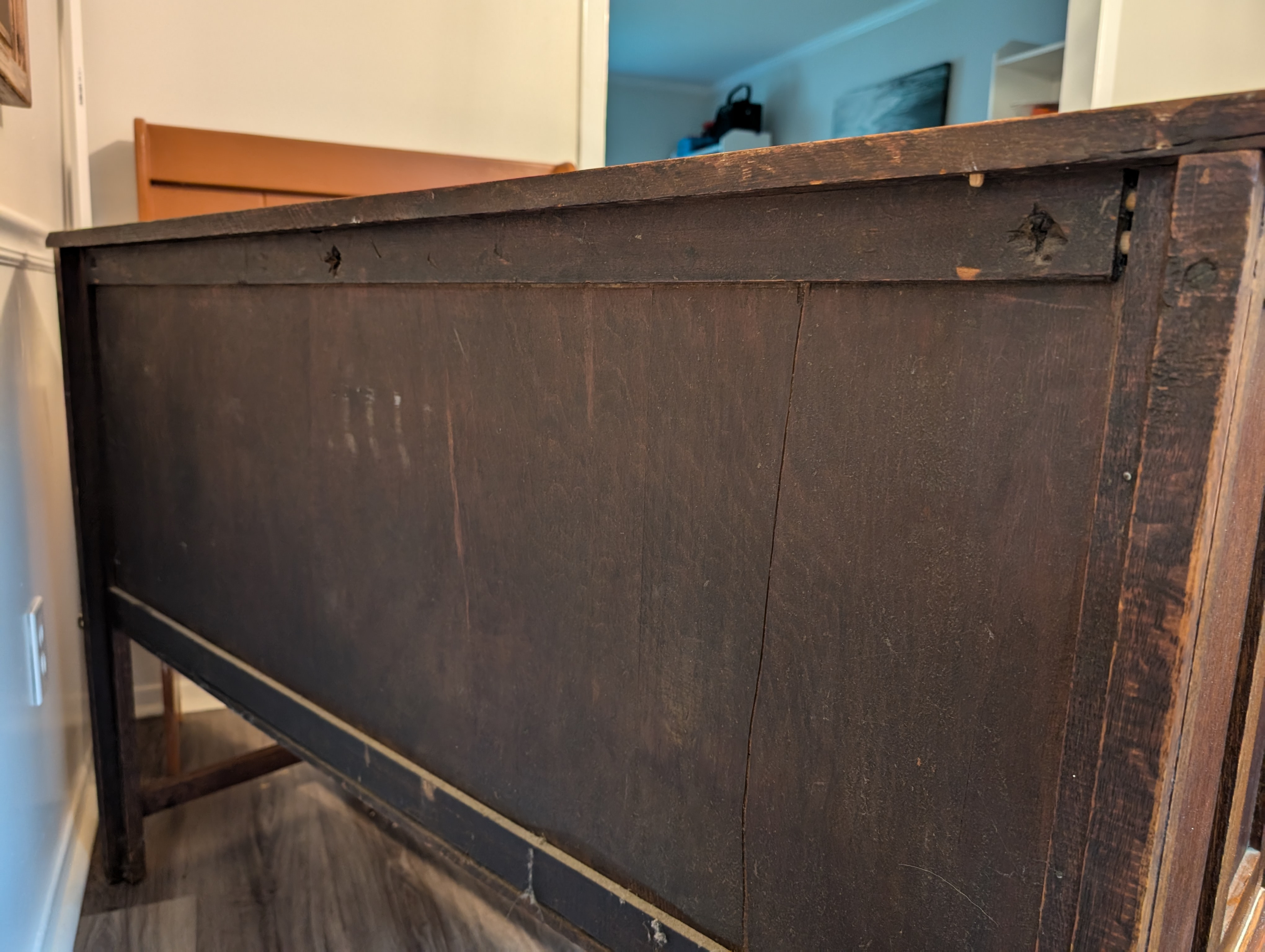 The craftsmanship, particularly the dovetail joinery and wood selection (quartersawn oak), points to factory-made quality from the Arts and Crafts to Colonial Revival transition period. The holes and wear on the top suggest it originally had a plate rail or gallery back, which is now missing—common with furniture that has been re-used or refinished over the decades.