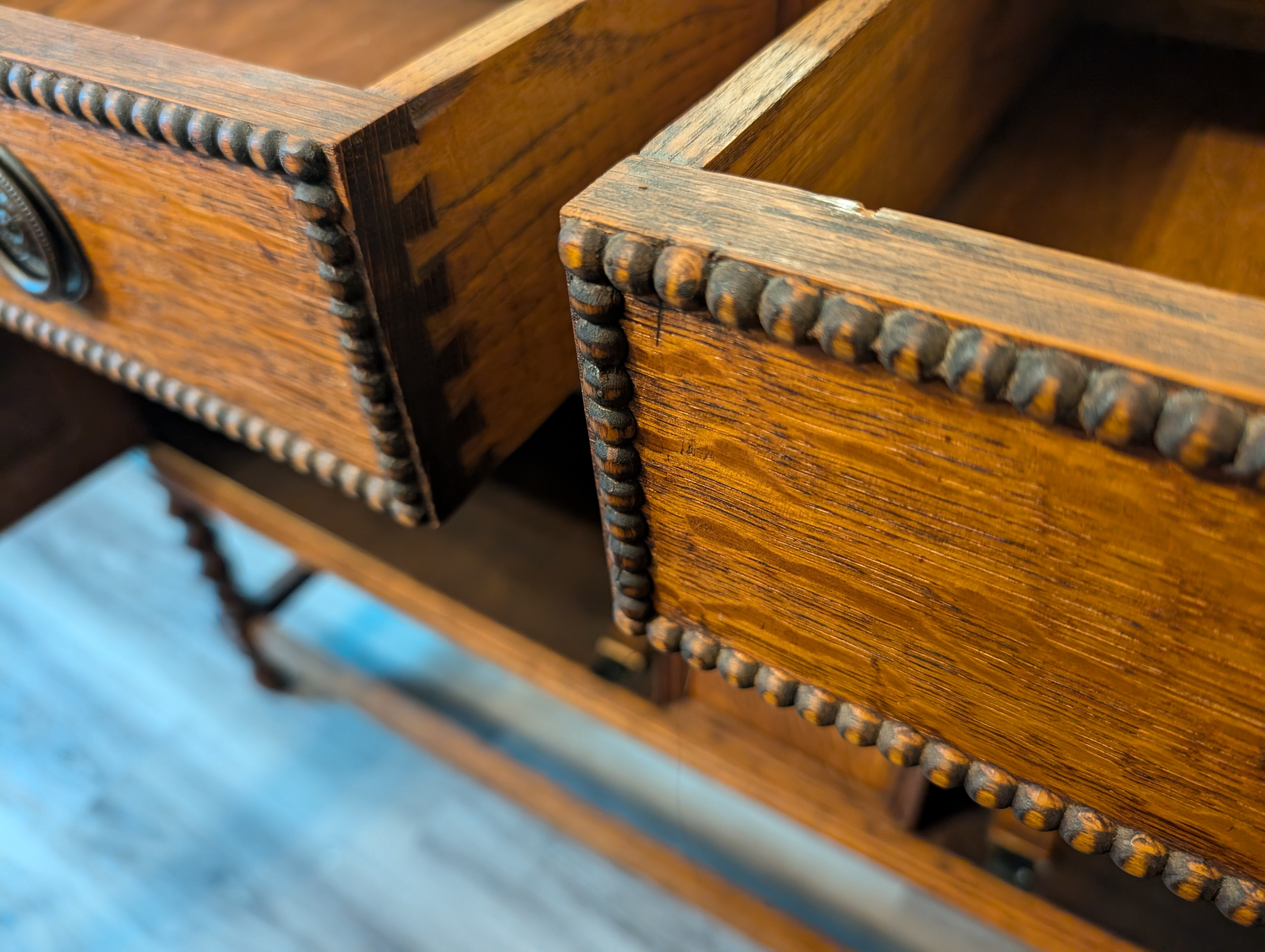 This piece is a fine example of Jacobean Revival furniture, a style that surged in popularity in the early 20th century (especially during the 1910s–1930s) in both England and the United States. Inspired by 17th-century English Jacobean furniture, these revival pieces featured heavy oak construction, geometric carvings, and spindle or barley twist legs—seen prominently here.