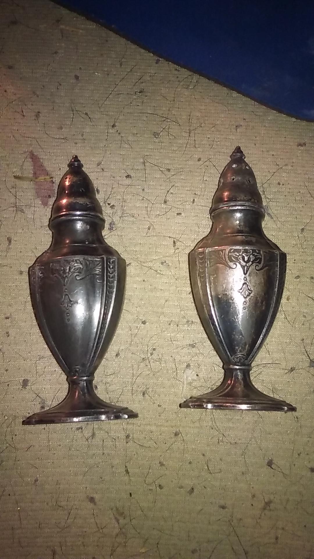 These are silver plated and were mass produced items, values for silverplate salt & peppers like this very modest, most sell for a couple of dollars at Thrift/Goodwill shops.