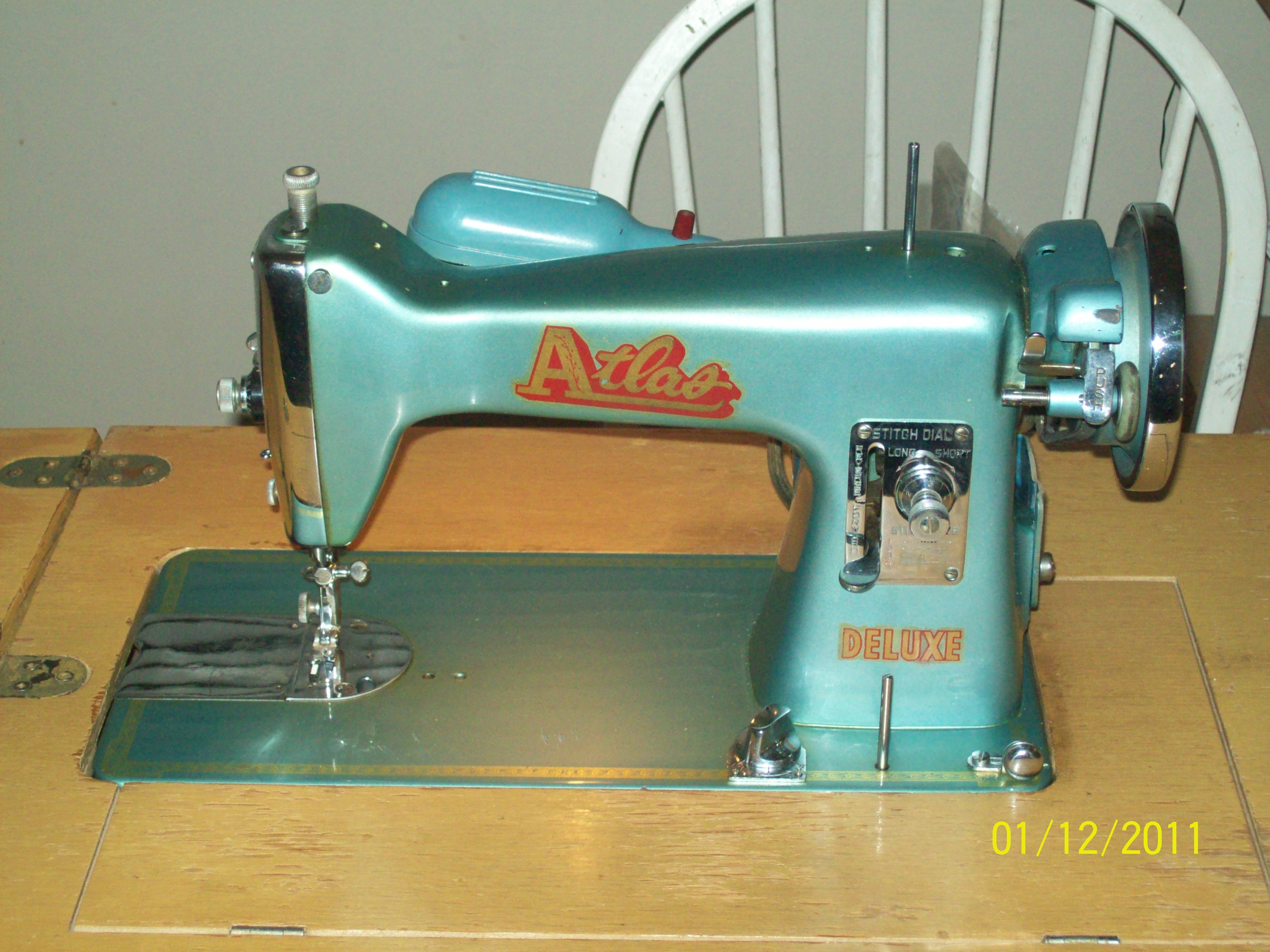 It is in its original compartment. It has a knee petal and it works. I have seen an Atlas Deluxe before but ONLY in pink. In the picture is a pair of sears electric scissors.