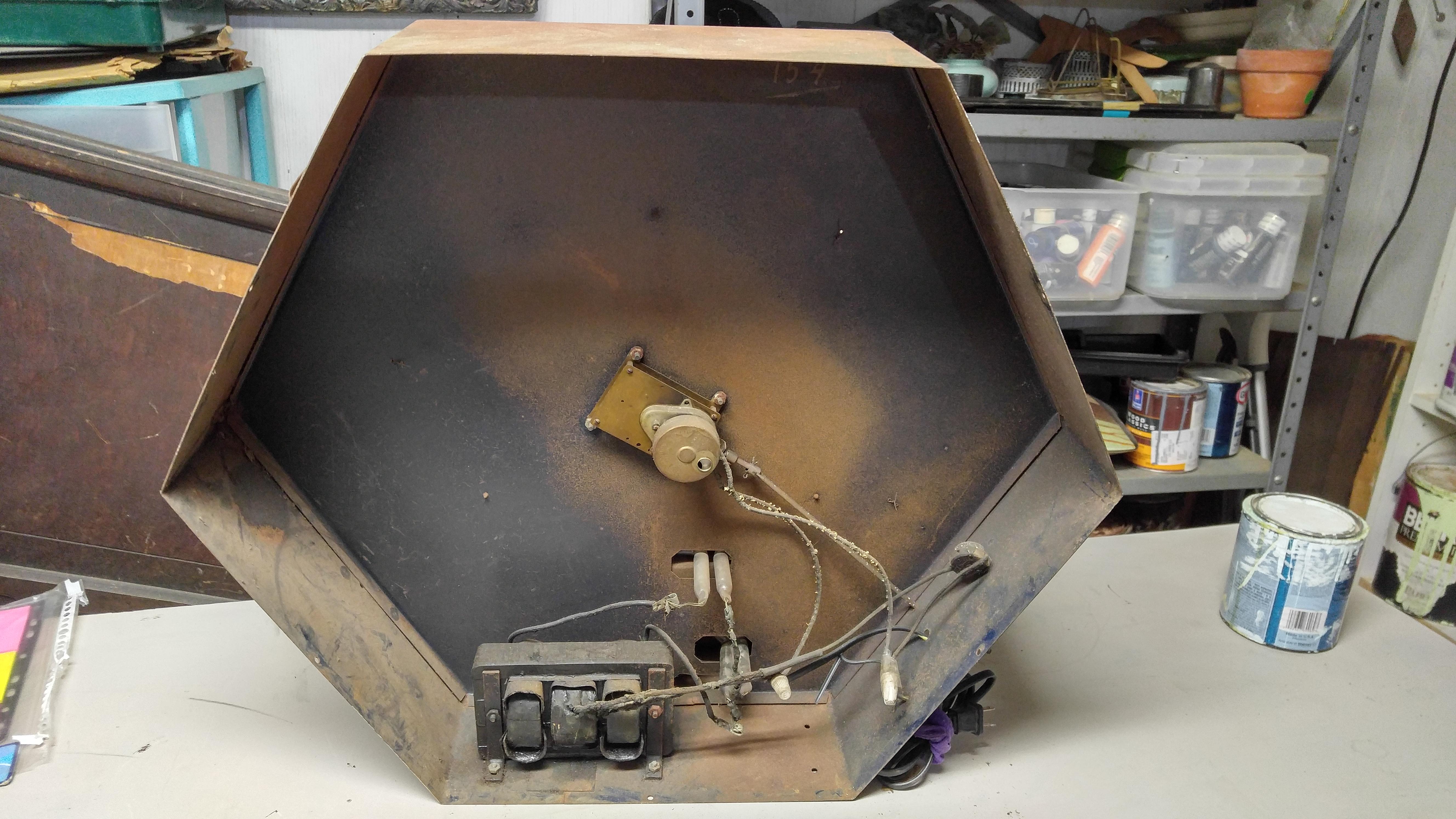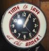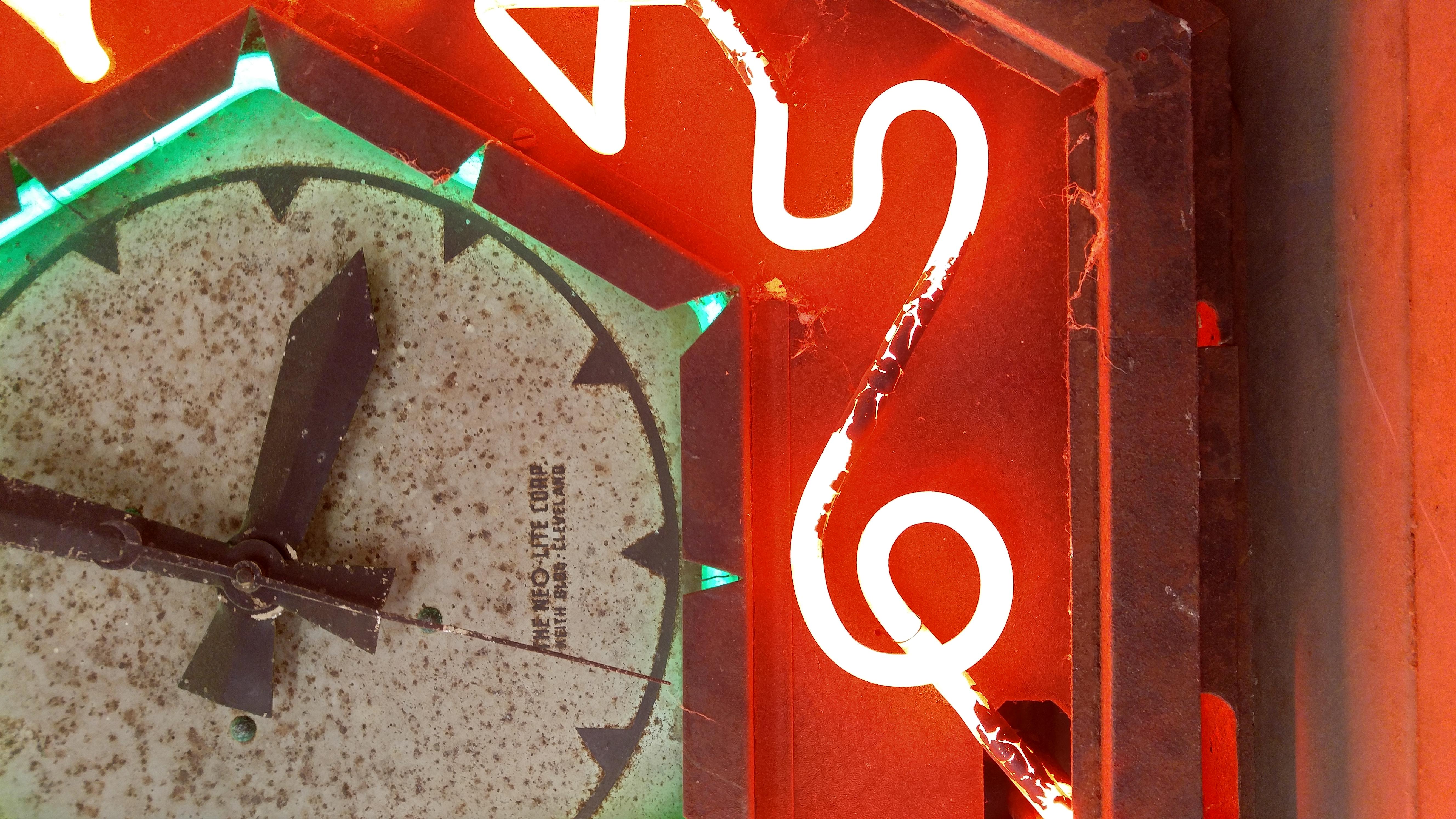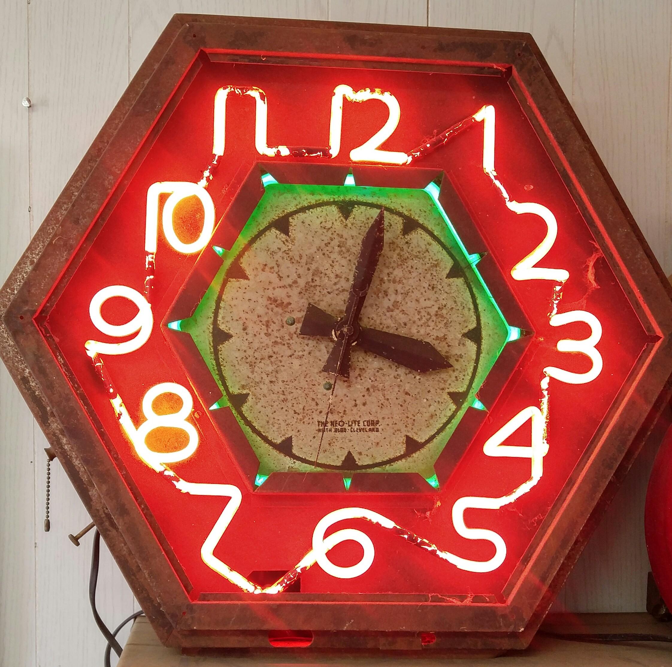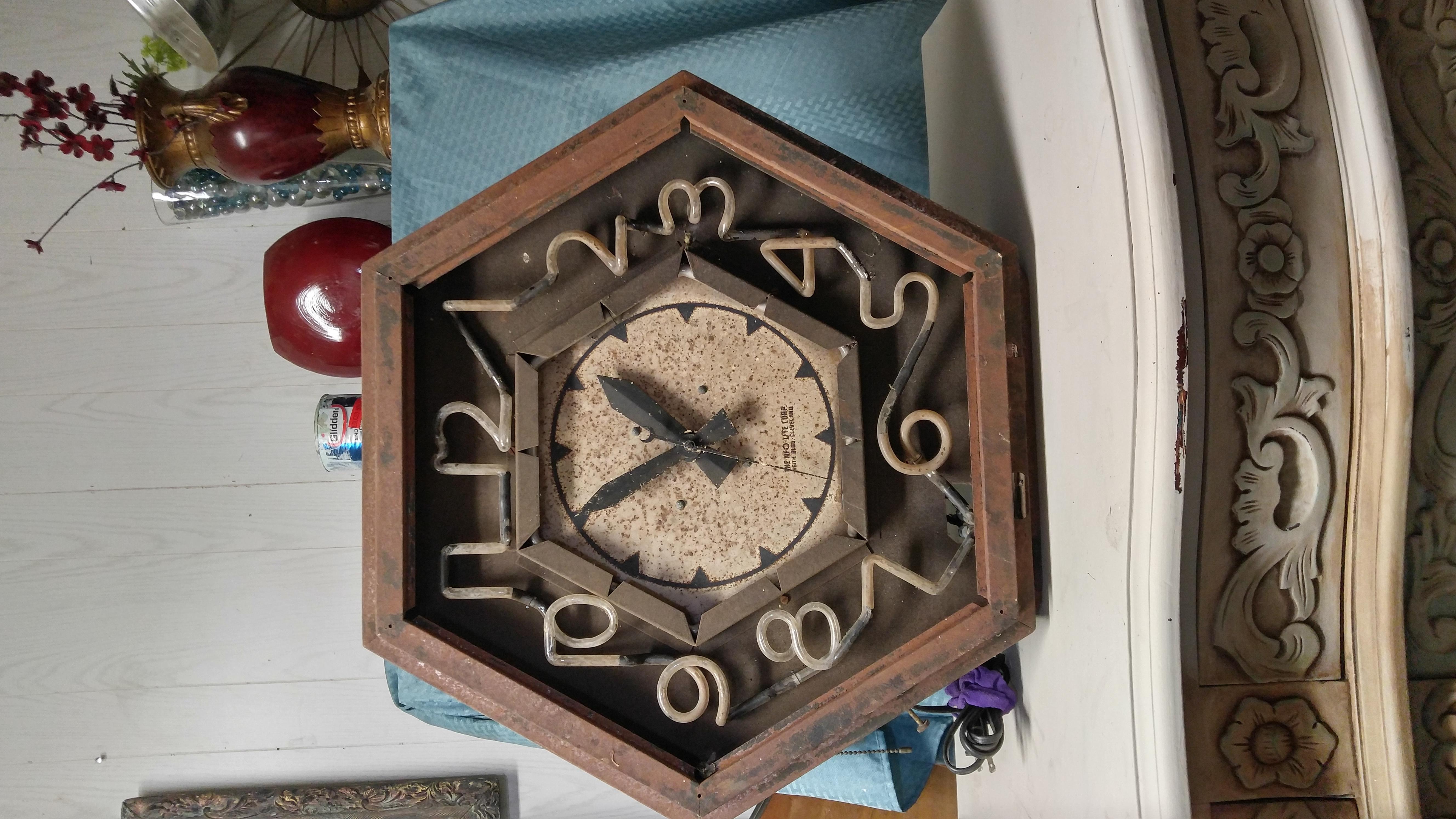 All original Attentioneer Neon Clock by Neo Lite Corp. All neon intact and working except outer neon. Metal clock case is rusty. See photos