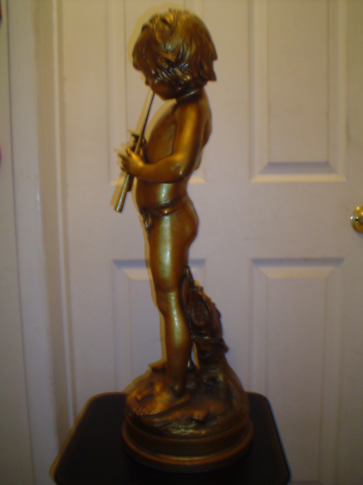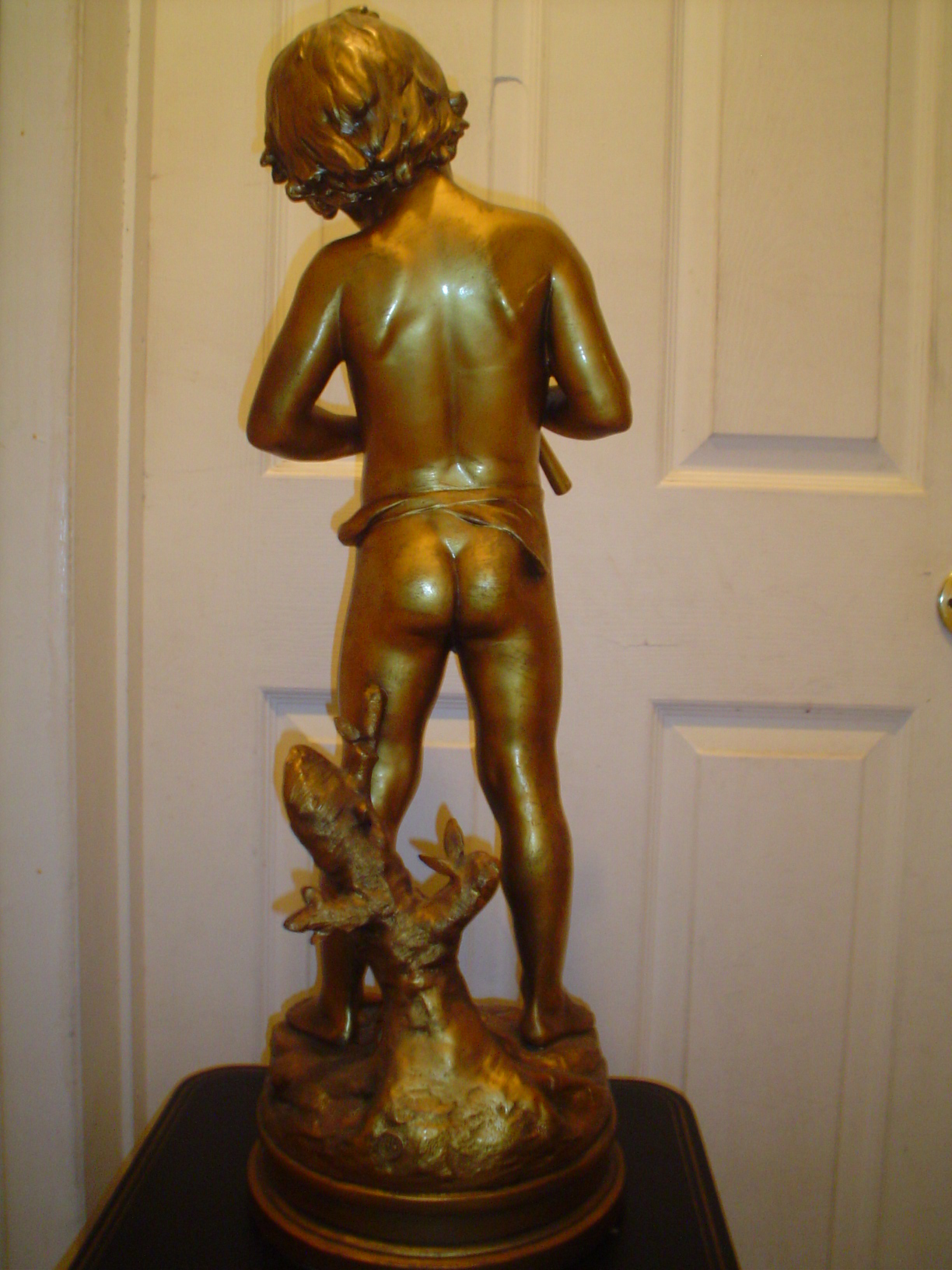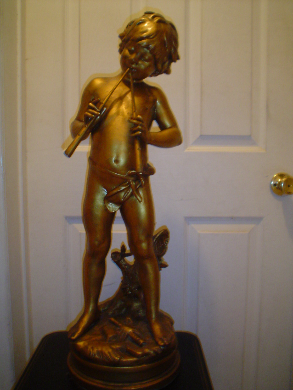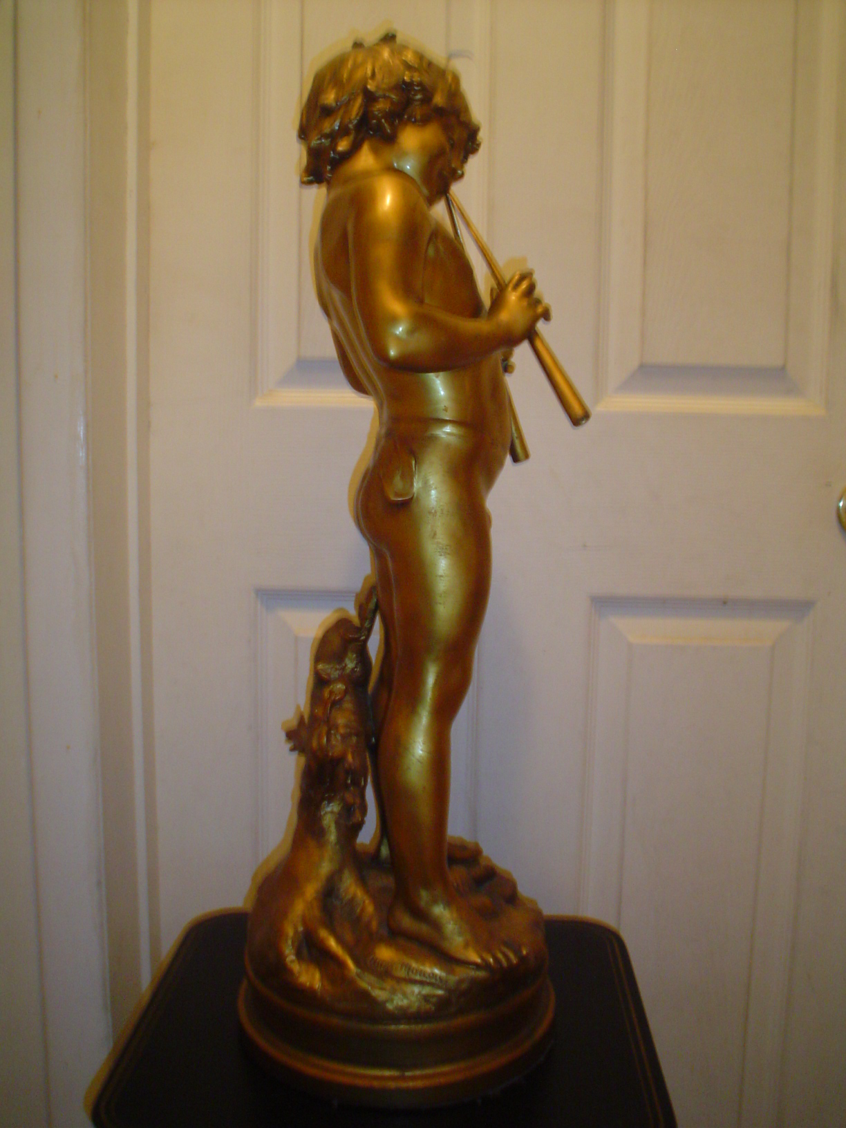 I have a 30" tall bronze over spelter signed Auguste Moreau statue of Pan playing his flute.It has a fluer de lis over 2 flags,made in usa foundry mark.Not numbered.I believe it to be J.B. Hirsch.It's in very nice condition and heavy.My late mother received it as a wedding present in the 50's? Any info on this would be appreciated.I'm especially curious about it's value.Places in Massachusetts or New Hampshire,or Vermont,Ct, RI that would give me a fair price for it?Auction houses?Not interested in shipping it anywhere.