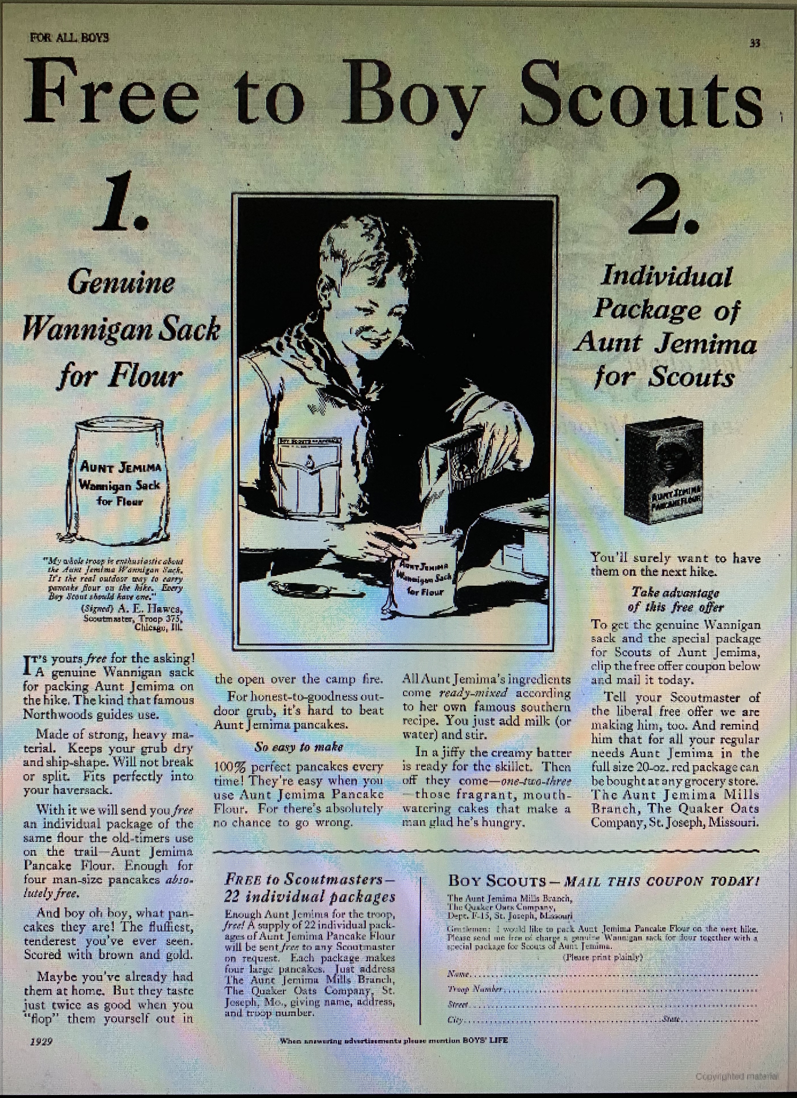 Aunt Jemima Wannigan Sack for Flour. I can not find any other information about this except for 3 issues of the Boy Scout magazine from 1929. I can not find any other listings or photos of current items similar. This one is in great condition.