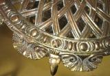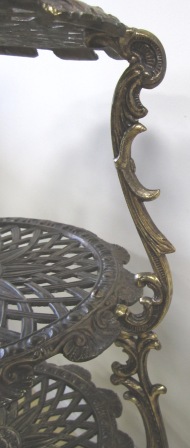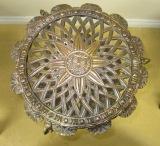 A lovely brass item: three tiered ornate end table or jardiniere (plant stand). The cast brass filigree work on tiers and legs makes this quite the showpiece. Has been referrred to as an Austrian table. The stand comes apart by unscrewing the fancy knobs makes it easy for shipping or moving. This item has patina!