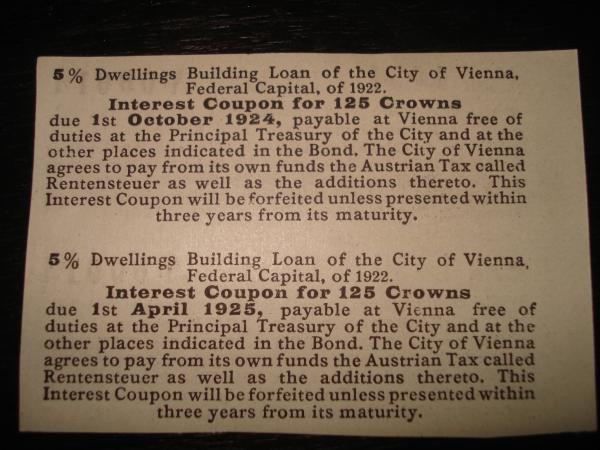 5% Dwellings Building Loan of the City of Vienna, Federal Capital, of 1922. Interest Coupon for 125 Crowns due 1st October 1923, payable at Vienna free of duties at the Principal Treasury of the City and the the other places indicated in the Bond. The City of Vienna agrees to pay from its own funds the Austrian Tax called Rentensteuer as well as the additions thereto. This interest coupon will be forfeited unless presented within three years from its maturity.