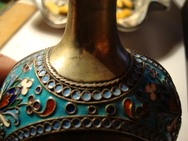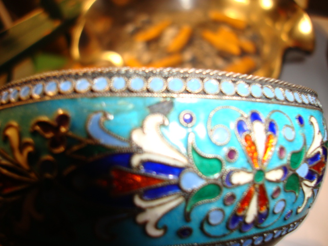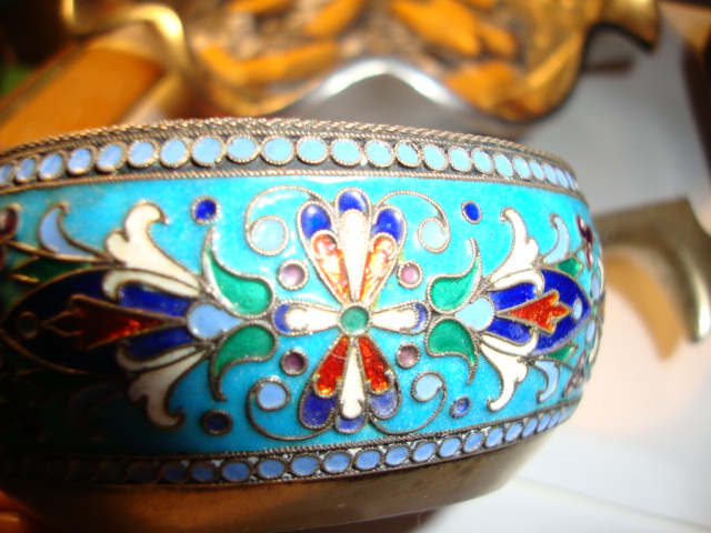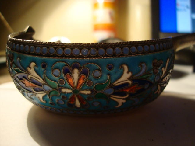 An authentic Russian kovsh made in 1895 almost pure silver with enamel has a small chip. I recieved it from my father I know that all my life it sat in his shadow box .I'm guessing he brought it home from the war he spent time in Austria and Germany during the war. It's a charming piece no dents just one small chip