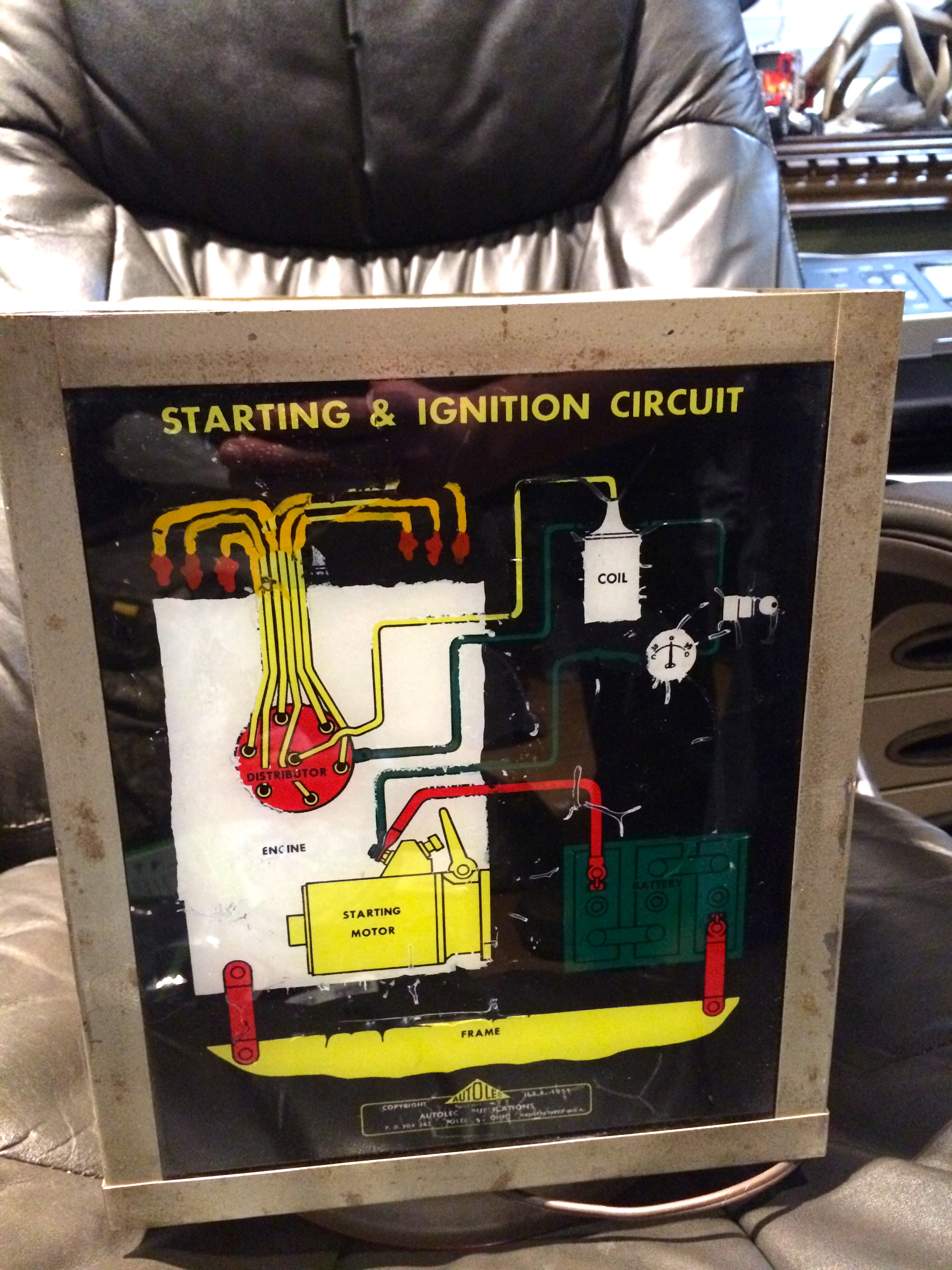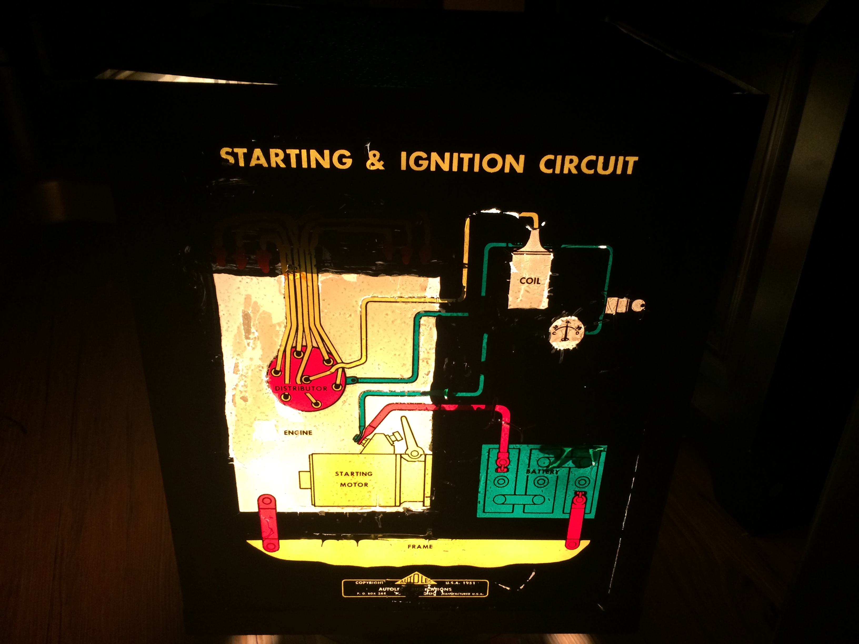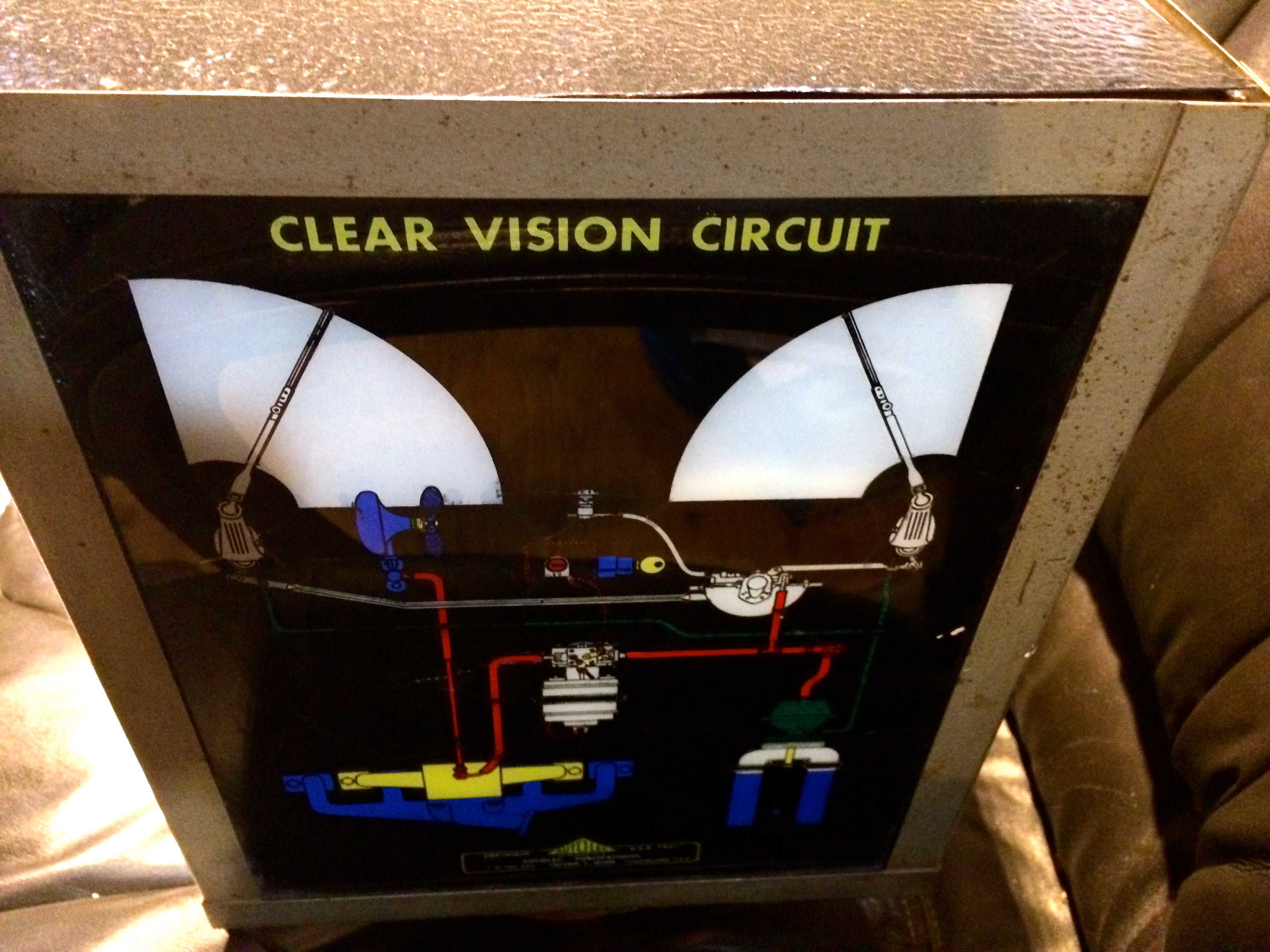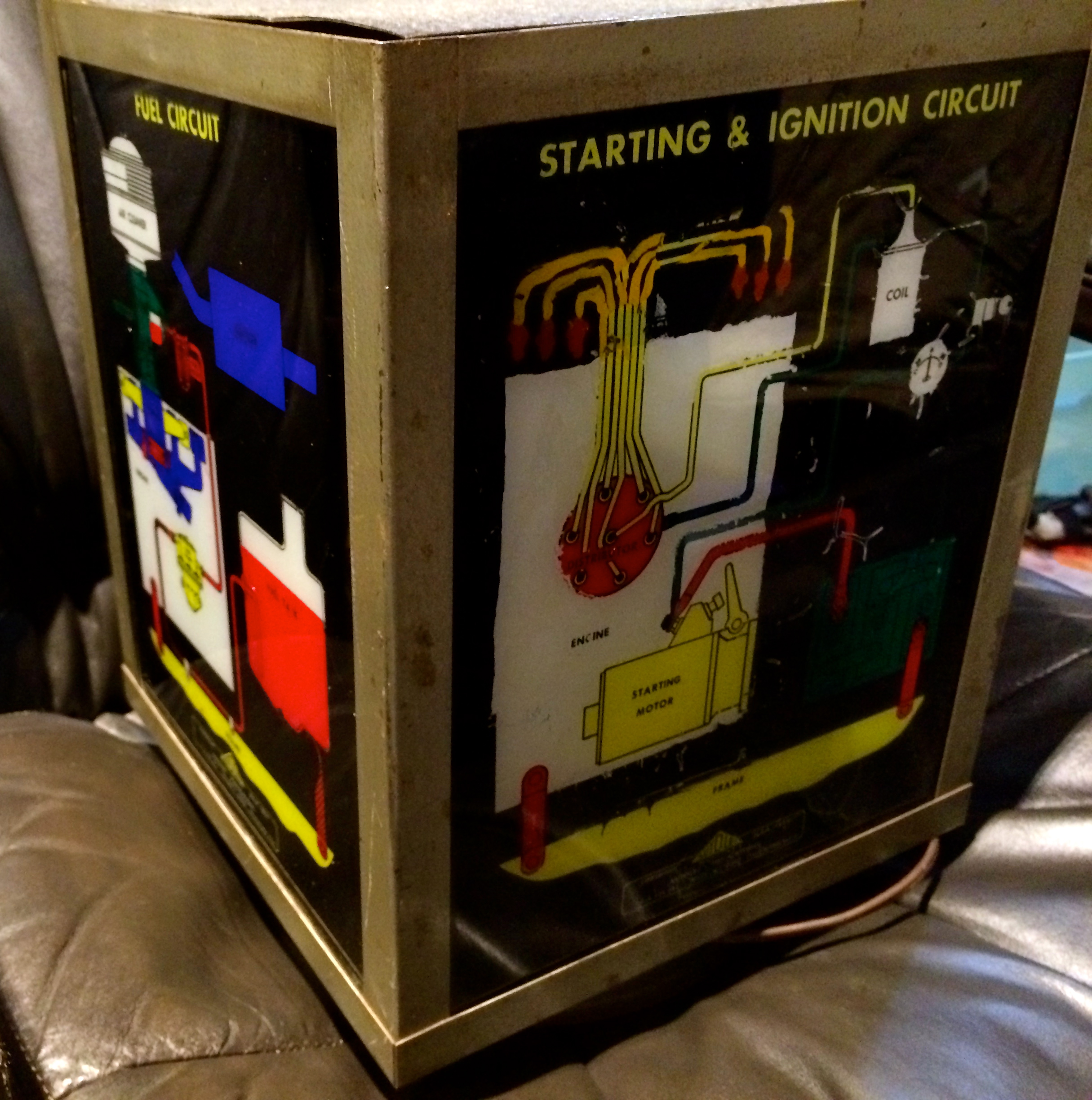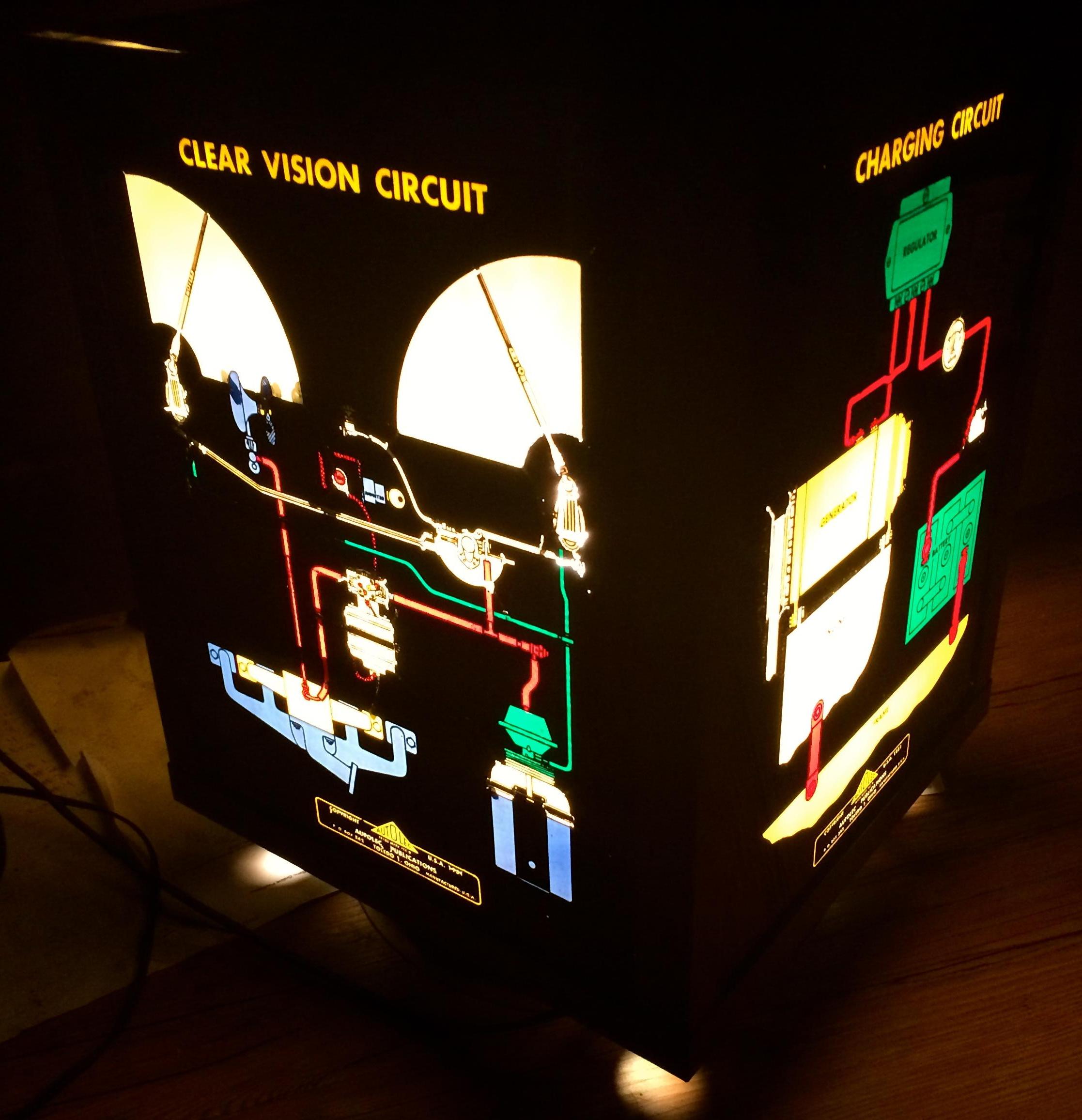 I cant seem to find anything on-line. It is in pretty good condition and works. Measures 13 5/8 tall by 10in wide. It is four sided all glass with metal frame, with a different diagram on each side, "charging circuit", "clear vision cirtcuit"," starting and ignition circuit", and "fuel circuit" . It has a removable tin top to get to the light bulb. Bottom has a metal base, that rotates. All the colors are bright and vibrent . I figure it was a display for a parts store.