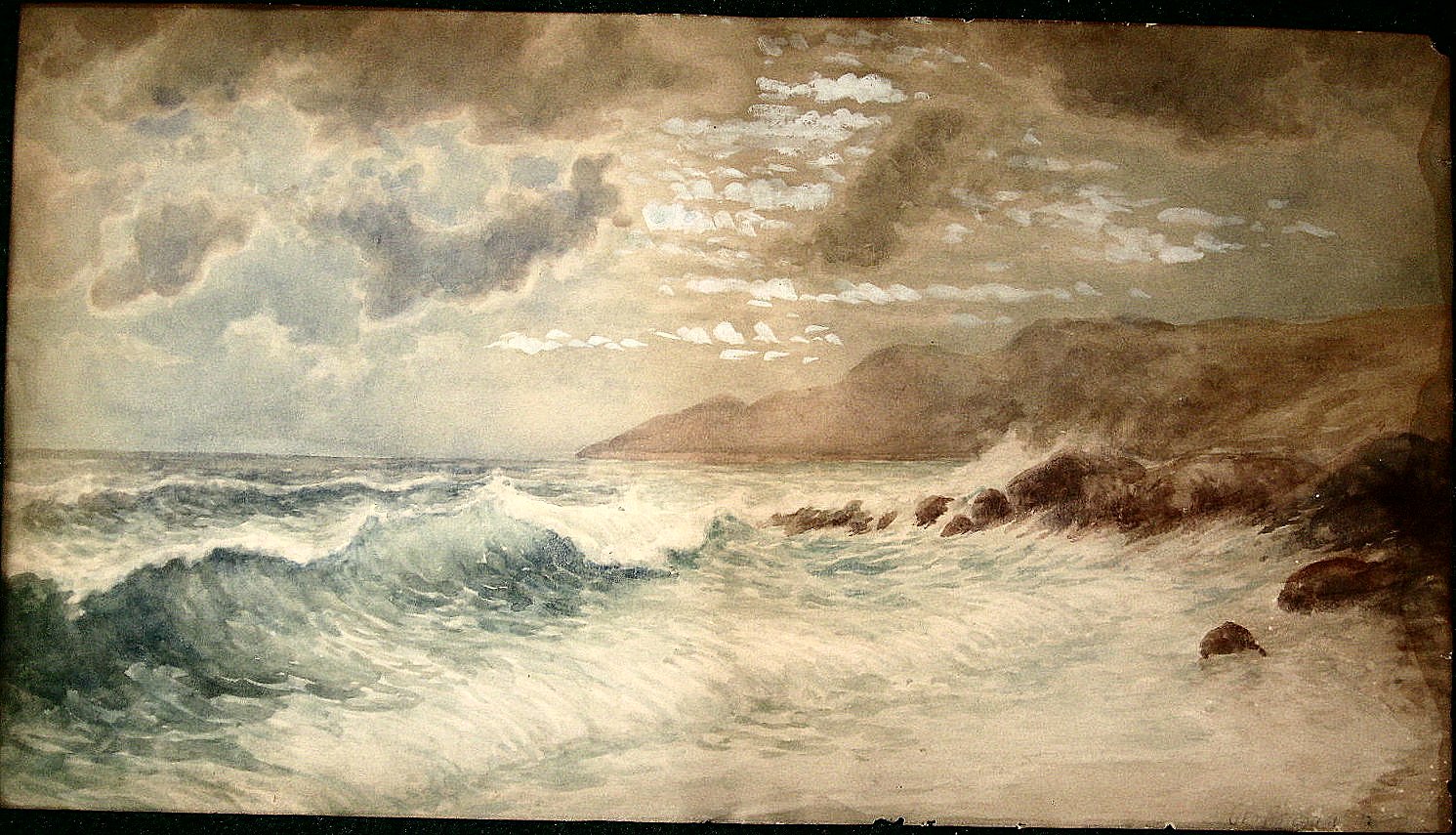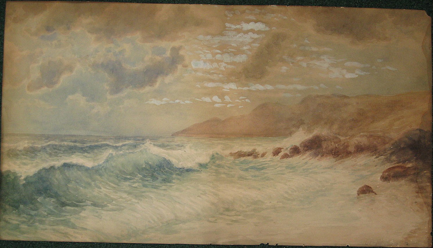 The painting is of a bay scene with high waves on an apparently stormy day splashing against a rocky shore.