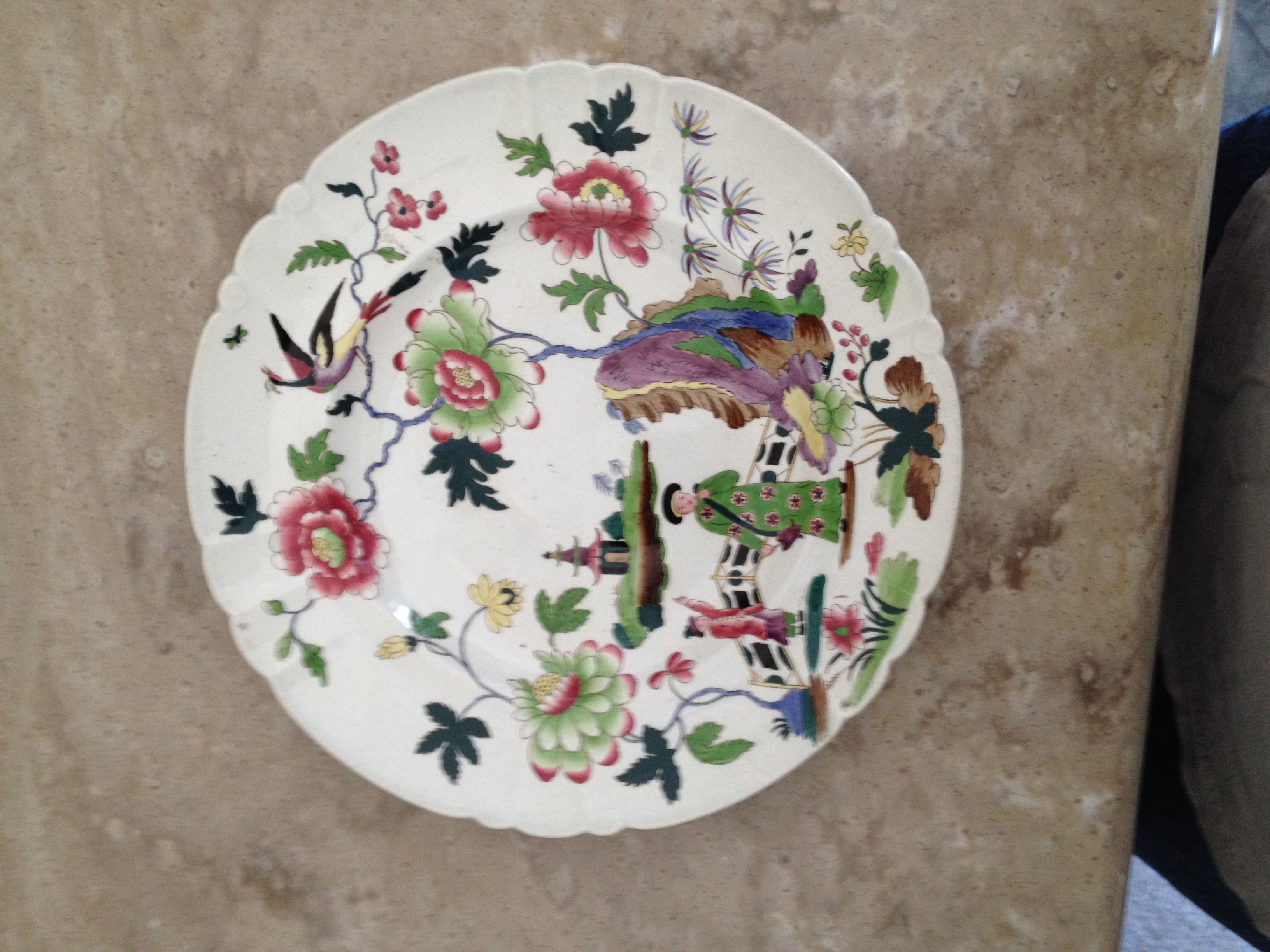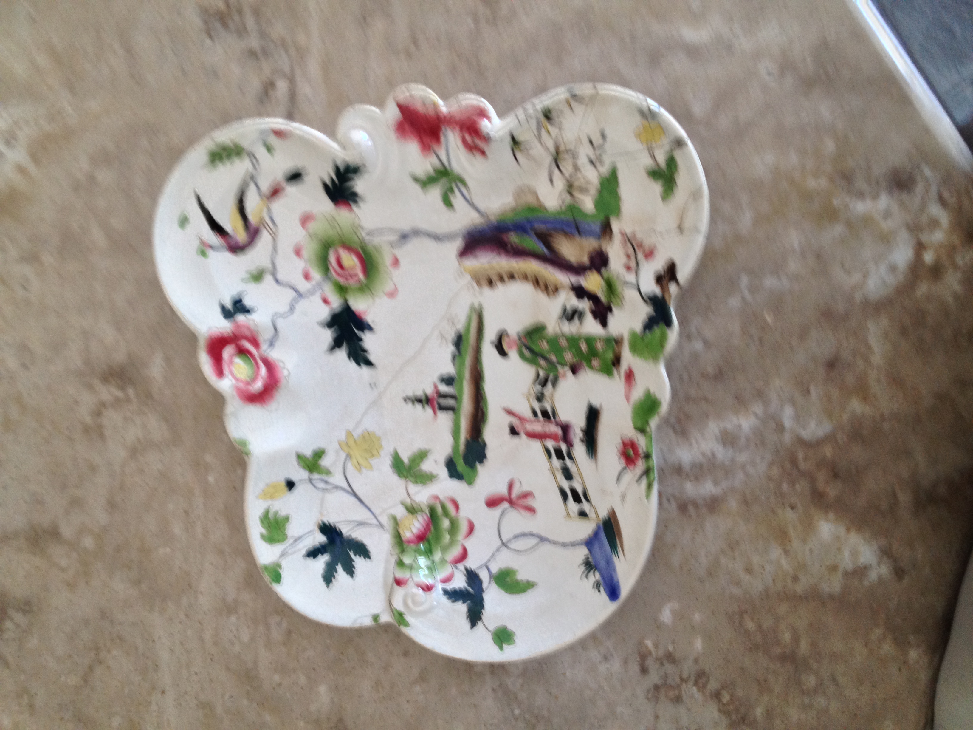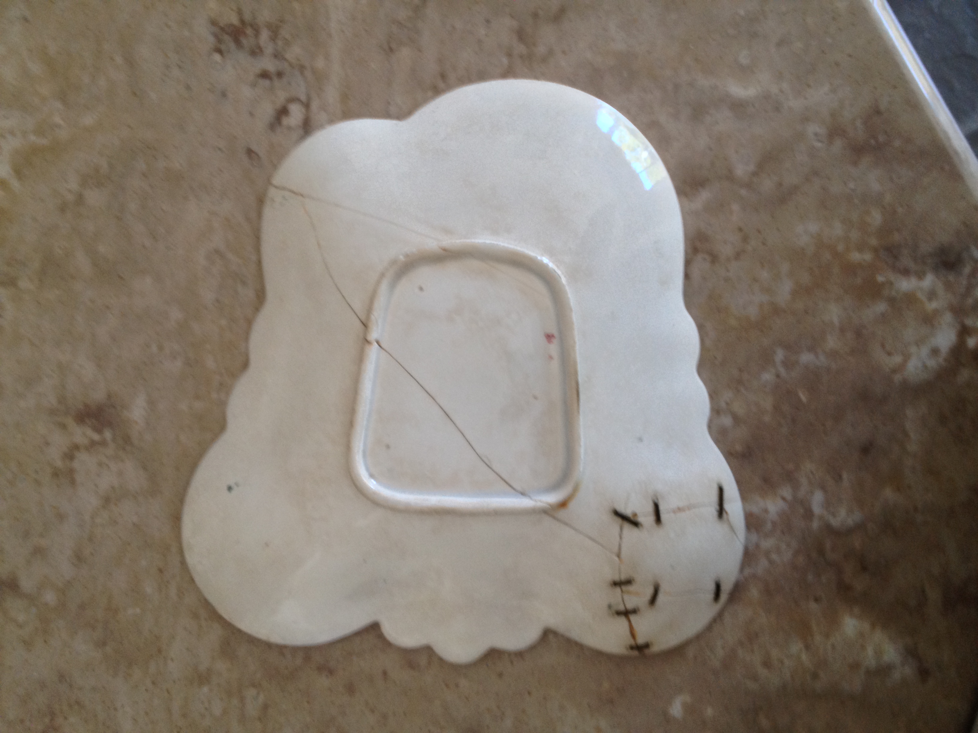 Repair on the first item is with glue and metal staples. There are no manufacture name or anything on the back except for the closeup pictures take of each mark.