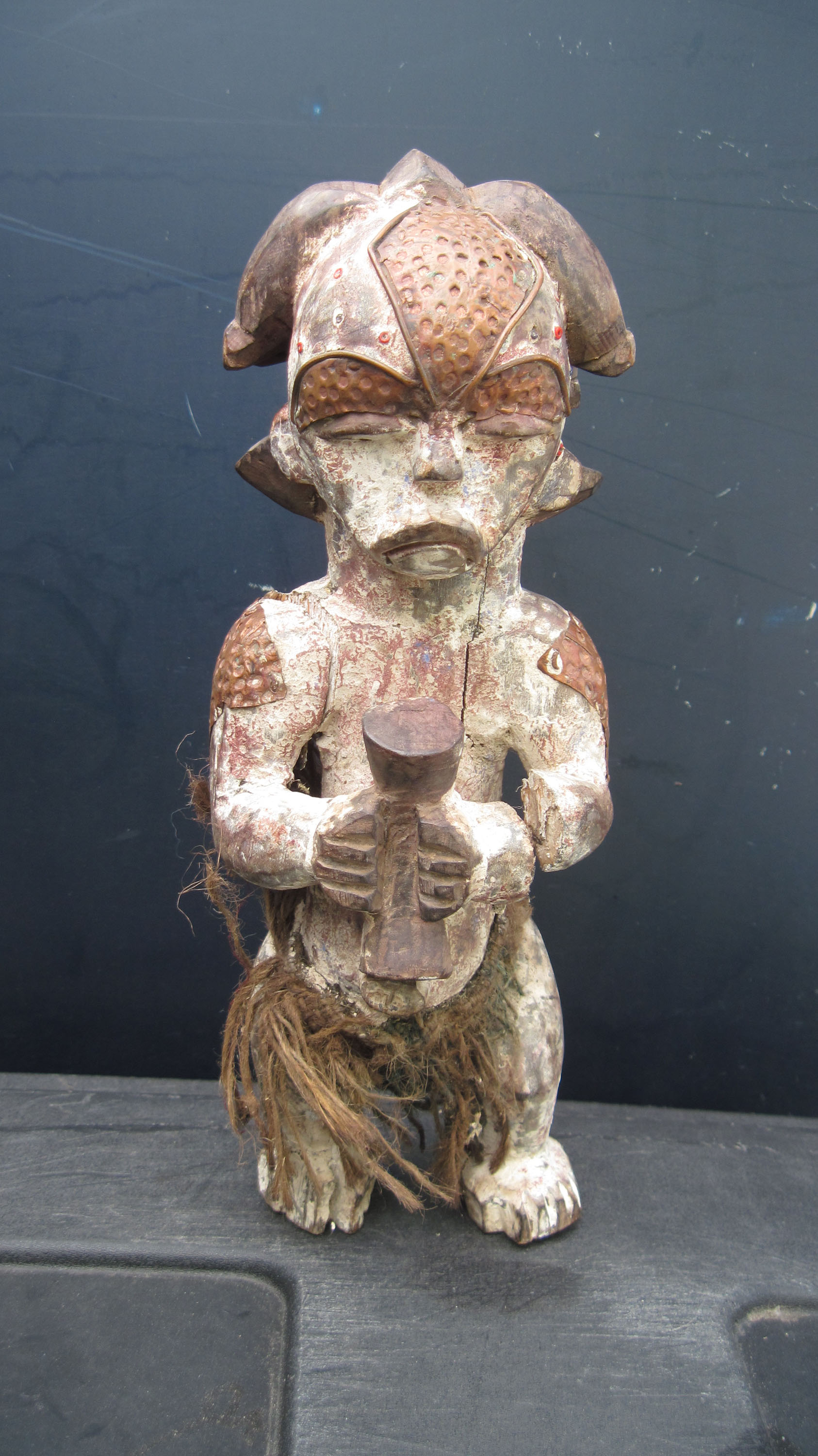 3. Warrior is 12.5 h x 4.5 w is made of wood and brass plates pined in various areas around eyes head and shoulders. whits paint fading.
