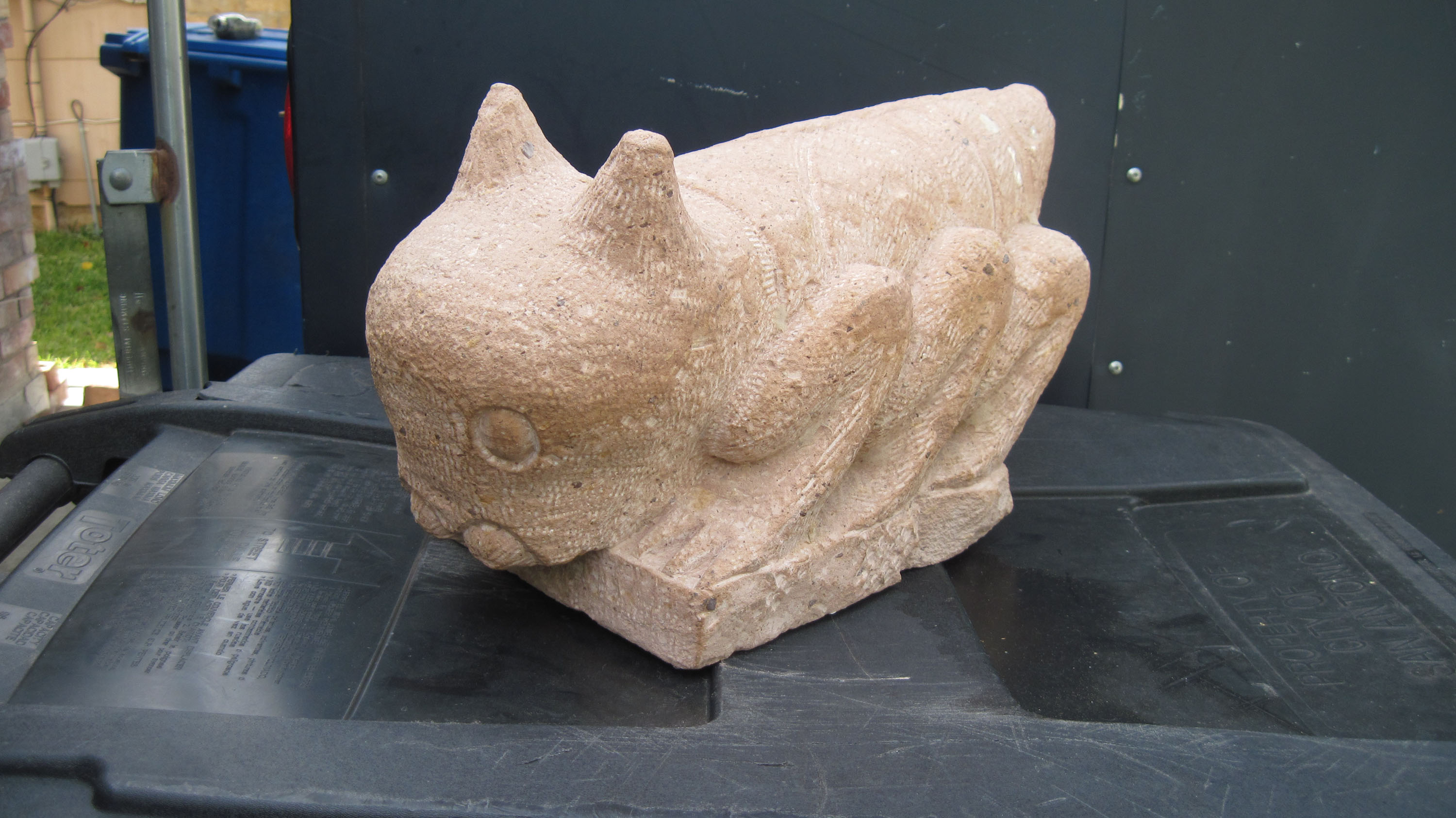 2. Grasshopper is 10h x 18l x 7.5 w and weighs about 35lbs it is pinkish in color mad eof cement.