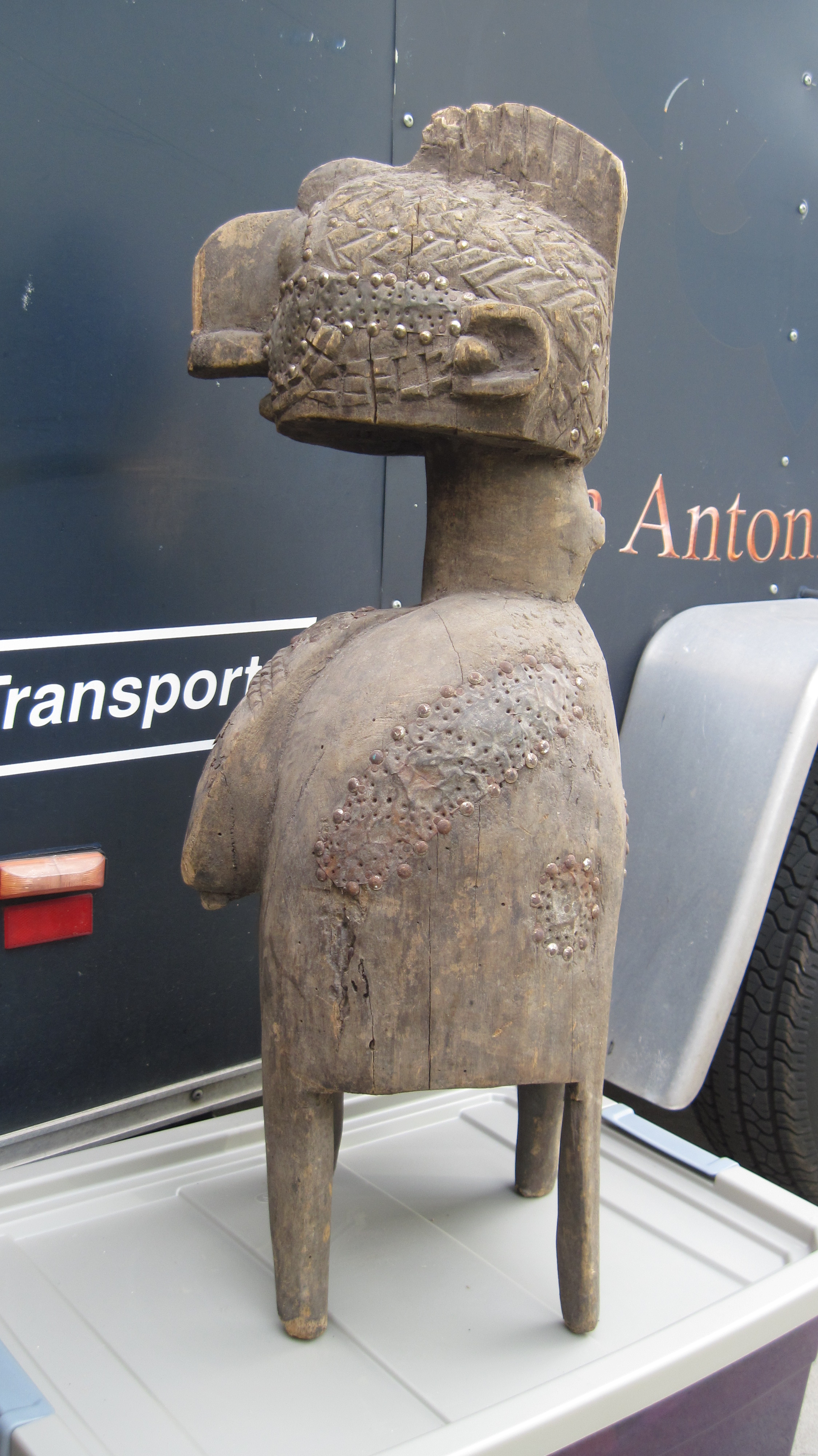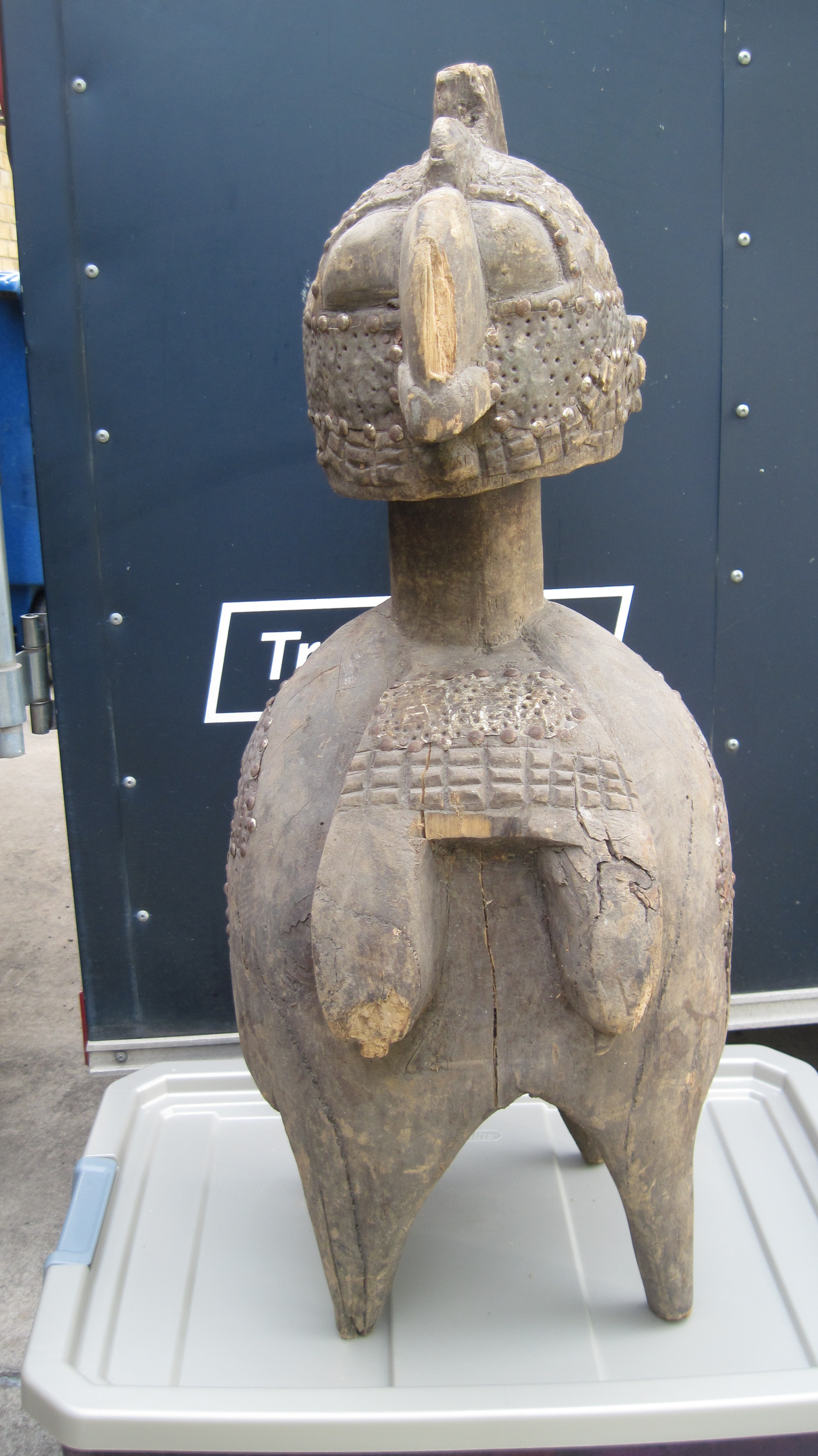 4. Wooden aztec ? stands 33h x 12 w x 12l weighs about 15lbs made of wood with some brass plates pinned around face and shoulders.
