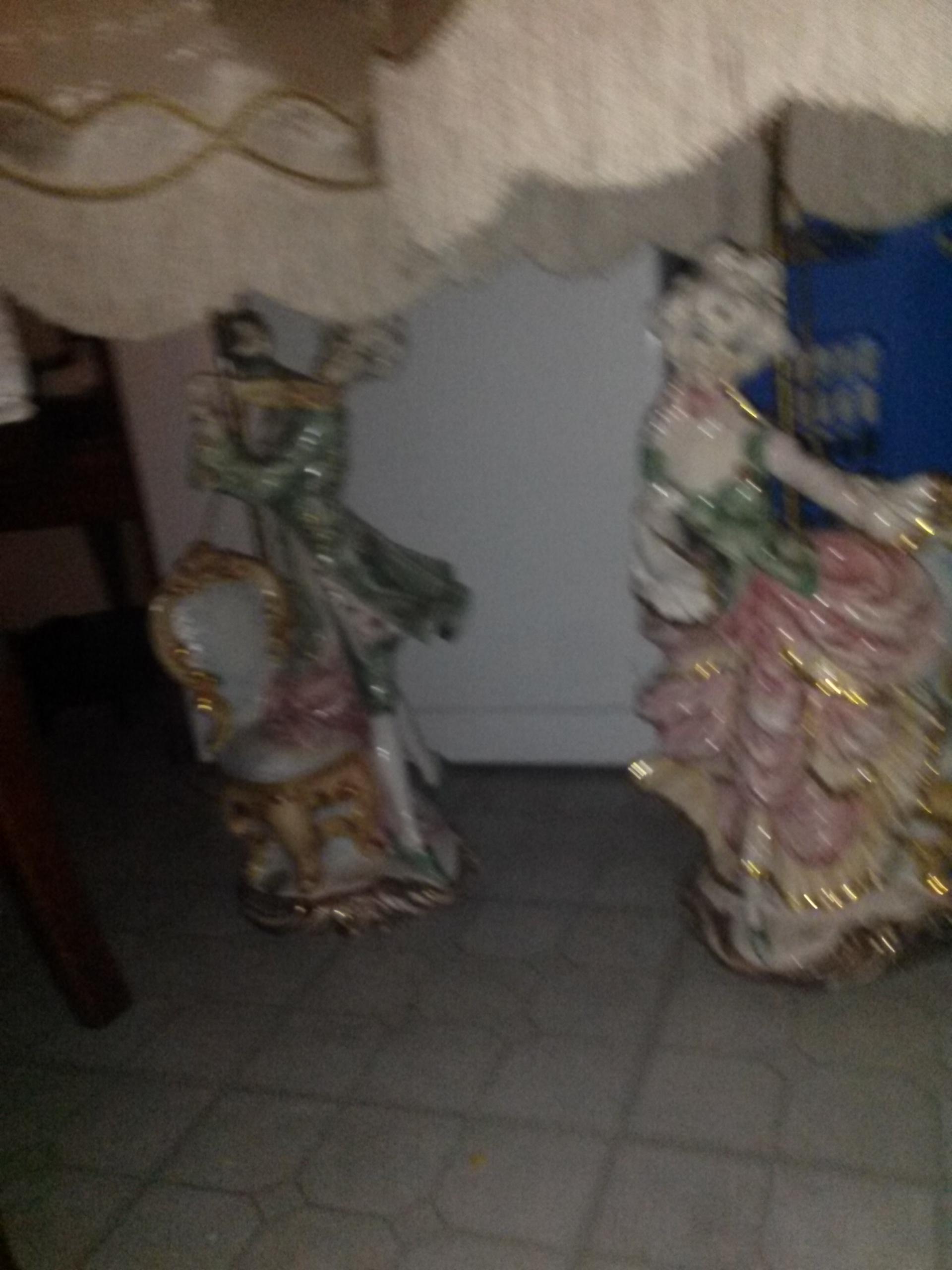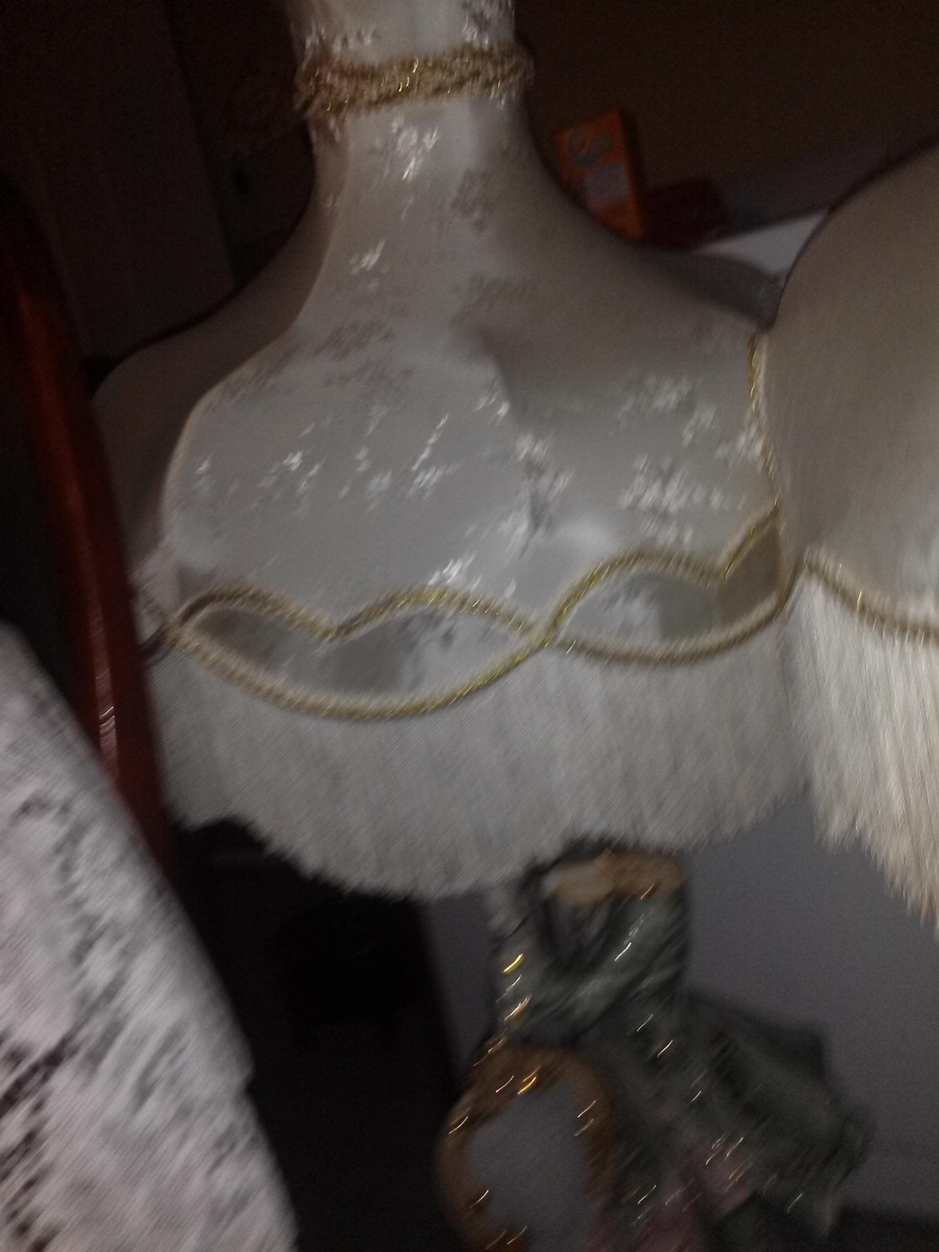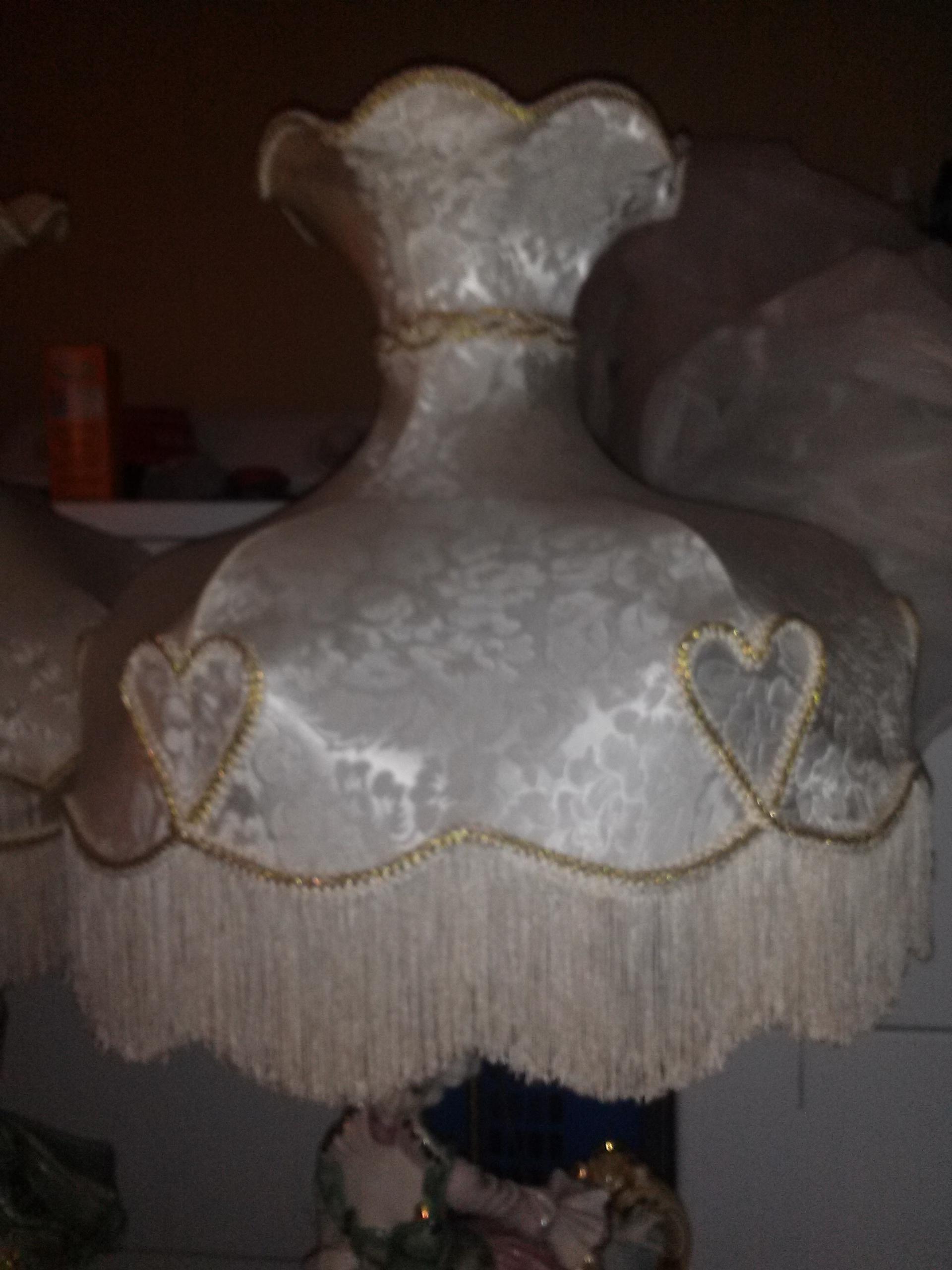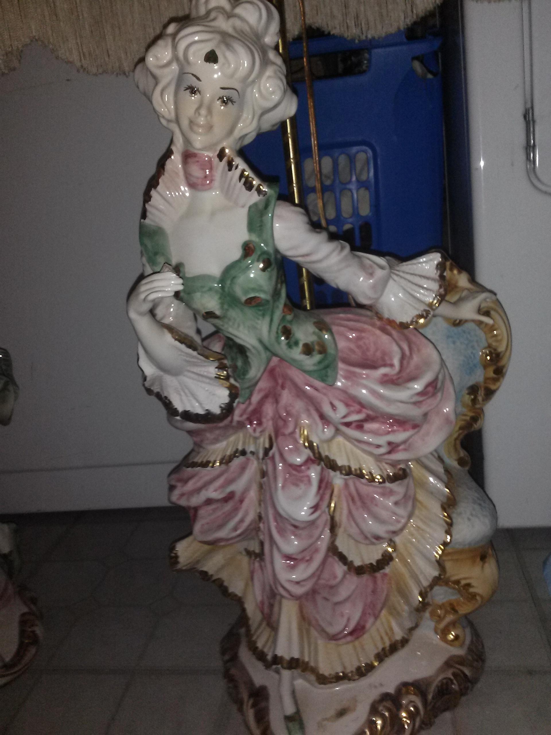 a set of porcelin laps. with lamp shades stand about 48"tall. one is a man playing a violin next to a chair. the other is a lady dancing next to a chair. the tips of the ladies finger on one hand is chipped off a little. tiny piece off the mans finger is off but have the piece. other than that, great condition. lamp shades are a ivory color with gold trim design on one and hearts on the other.