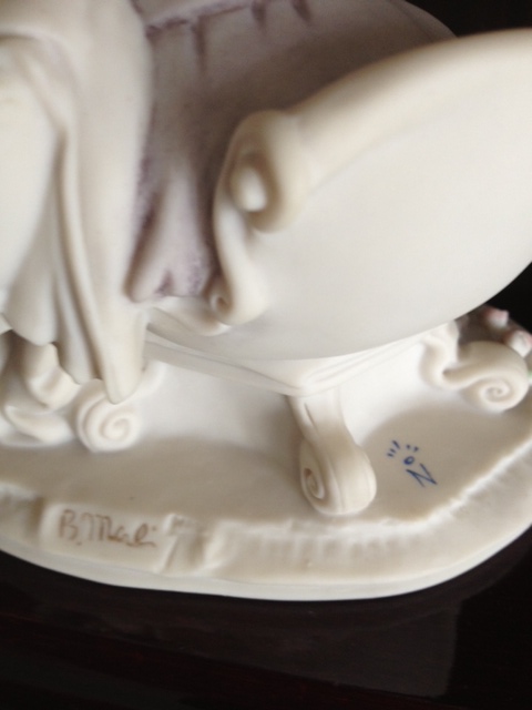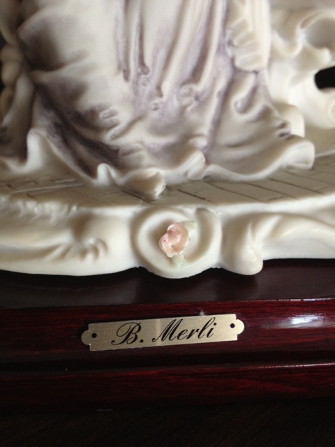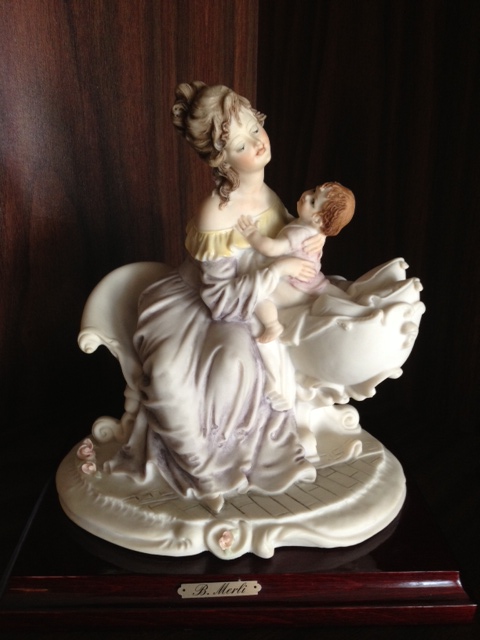 B. Merli Mother and child figurine. Signature and markings on back (shown in photo). It's on a wood base and figurine appears to be porcelain.