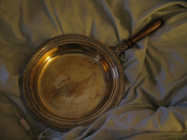 good condition, stamped B. Rogers SIlver Co. 1883 Silver on Copper and numbered 1144. It looks like someone tried to remove some of the tarnish. No large damaged areas to note, only a negligeable scratch in the wooden handle.