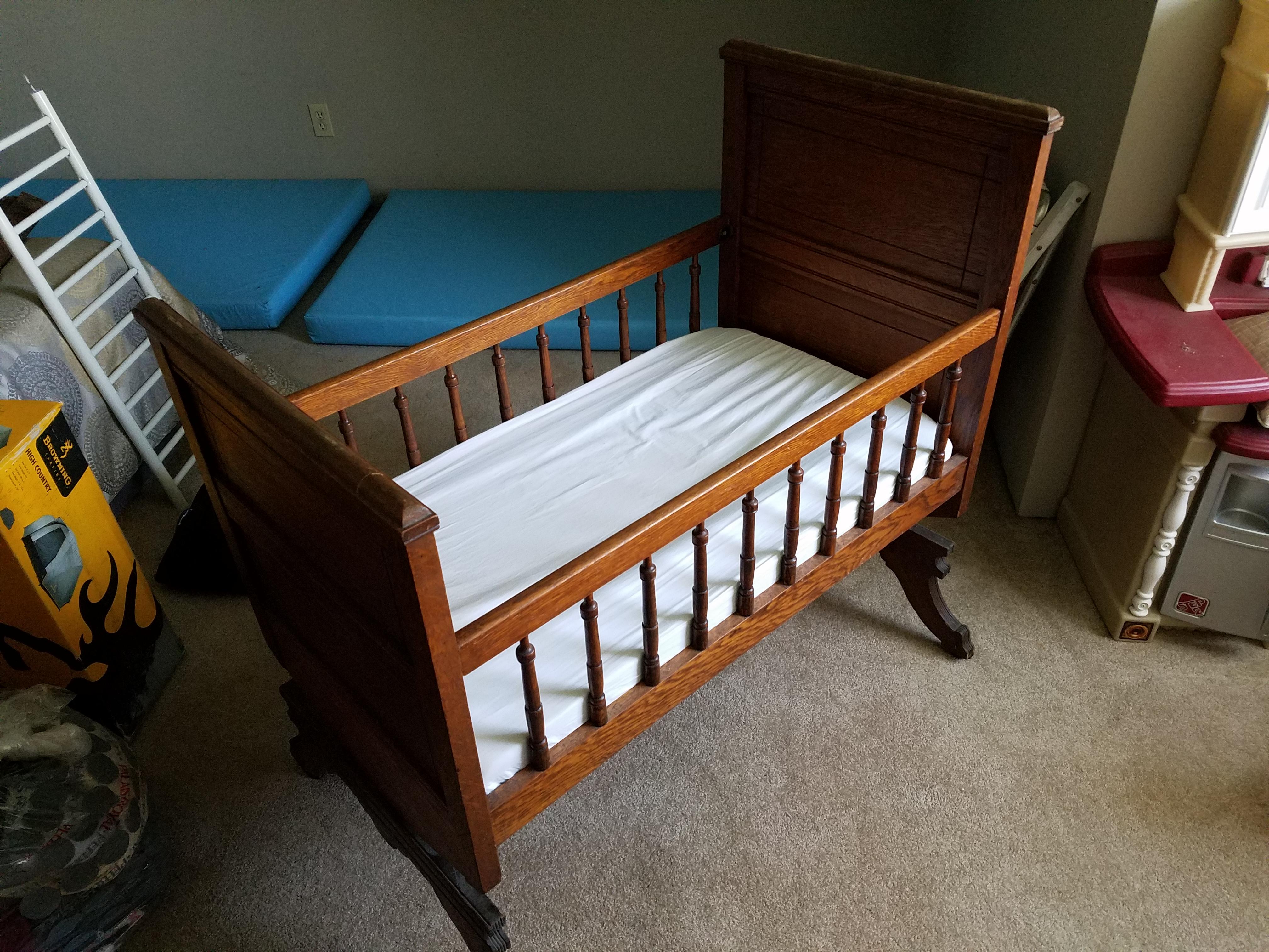 I was given this cradle/baby bed as a gift. I do not know anything about its previous owner(s) or origin since it was bought at an auction. It is about 3 feet long by 1.5 feet wide and at least 3 feet tall. It is solid wood, I assume oak, because it is pretty heavy. It can rock like a cradle but also has a locking mechanism to hold it stable like a bed. The head and foot boards are solid wood with spindles on the sides. There are board slats for the bottom of the bed. It is in nearly perfect condition, but I don't know if it is original or restored. There are no maker's marks of any kind to identify it.
