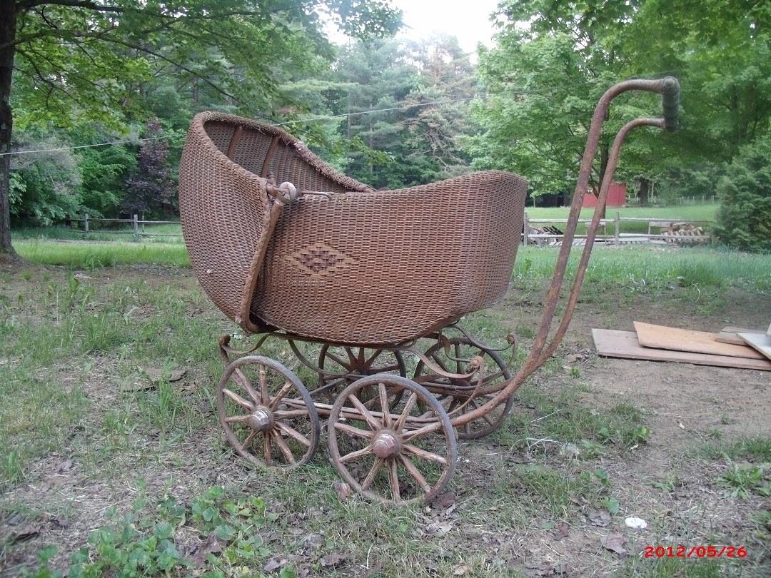 WICKER BABY CARRIAGE WITH WOOD WHEELS AND A SECRET COMPARTMENT UNDER WHERE A PAD WOULD GO